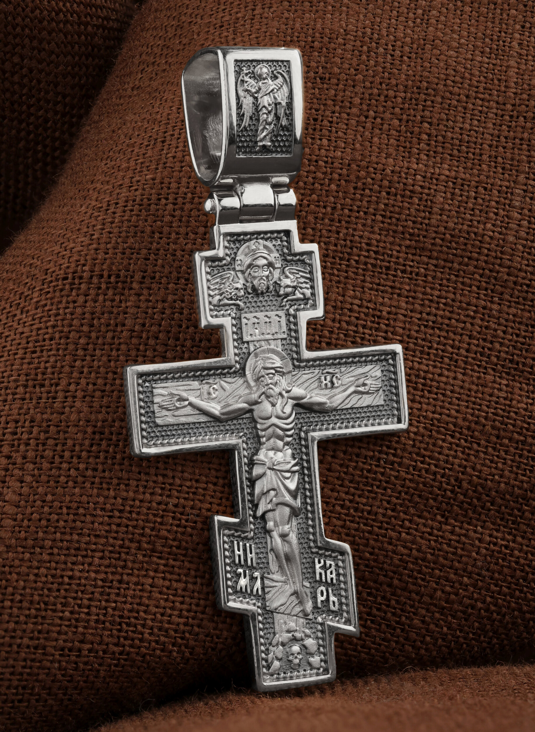 На лицевой стороне креста изображено Распятие, потому что это орудие казни Иисус Христос сделал орудием победы над грехом и смертью. Своими страданиями Он искупил грехи человечества, умерев и сошествовав во ад, победил сатану, освободил души праведников от вечной смерти и открыл им небесные врата рая. Жертва Христа сделала возможным спасение для каждого человека. На православном кресте Христос не умирает, а свободно простирает руки, ладони Иисуса открыты, будто он хочет обнять все человечество, даря им свою любовь и открывая путь к вечной жизни. Верхняя перекладина символизирует собой табличку с надписью «IHЦI» — Иисус Назарянин Царь Иудейский. У подножия добавляется: «НИКА» (греч. — Победитель) и «МЛРБ» — Место Лобное Рай Бысть. Возвышение, на котором стоит Крест, символизирует гору Голгофу, на которой произошло Распятие. У подножия Креста изображают прах Адама, обозначенный черепом.