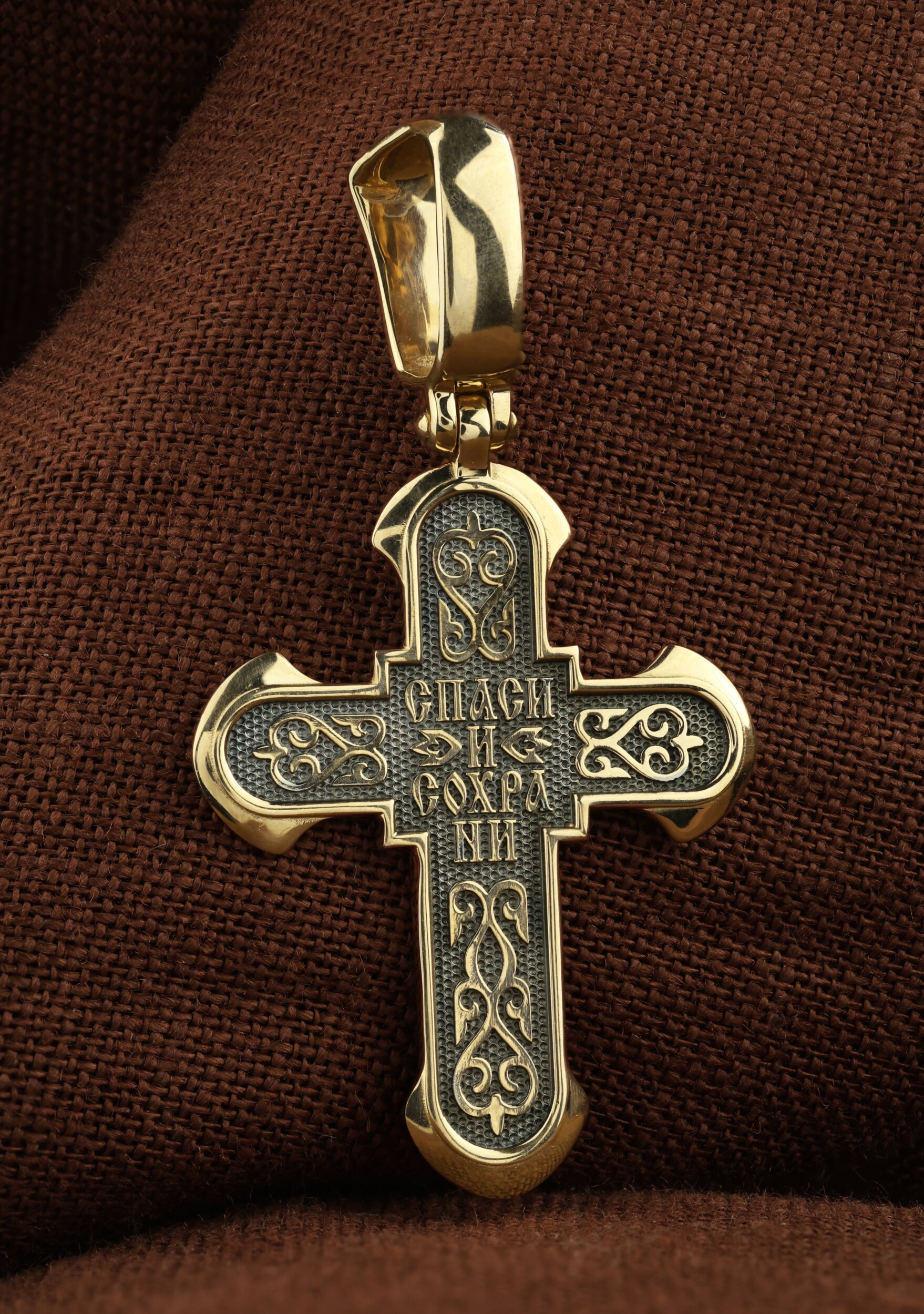 Обратная сторона креста выполнена с использованием растительного орнамента. Такой крест с растительным узором вводит мотив процветшего креста и символизирует Древо Жизни. Умерев за наши грехи, Христос возродил всех для Жизни Вечной, «Смертию смерть поправ…». Своими страданиями Он искупил грехи человечества, умерев и сошествовав во ад, победил сатану, освободил души праведников от вечной смерти и открыл им небесные врата рая. Поэтому на обороте данного креста написано молитвенное славословие: «Спаси и сохрани».