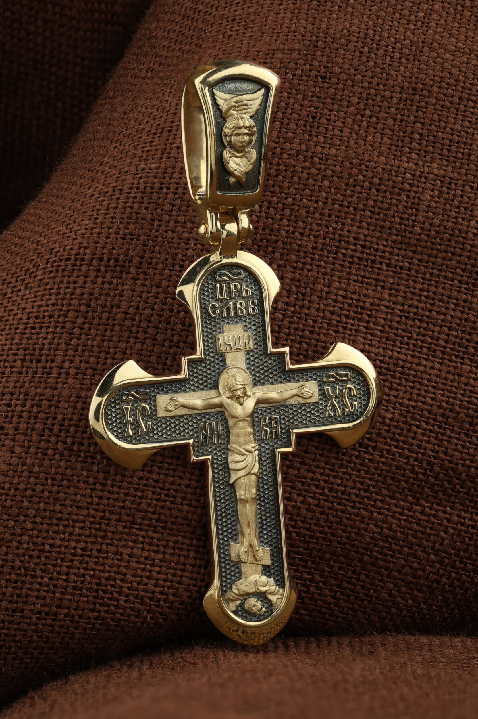 На лицевой стороне креста изображено Распятие Господа нашего Иисуса Христа. В традиции Православия — принято изображать Спасителя как Воскресшего Крестоносителя, призывающего в Свои объятия все концы мира. Его руки имеют горизонтальное положение, открытые ладони пробиты гвоздями, голова наклонена вправо, вокруг головы крестчатый нимб. Крест стоит на горе камней, символизирующих Голгофу, в основании которой различается череп. Это голова Адама. По преданию, тело Адама было погребено Симом, сыном Ноя, на месте, где впоследствии возникла гора Голгофа. Над головой Господа на поперечной перекладине аббревиатура «IНЦI», что символизирует табличку, которая была прибита к Кресту, с надписью «Иисус Назорей Царь Иудейский». Этим иудеи хотели посмеяться над Христом, не зная, что распинают истинного Царя всех царей. По бокам поперечной перекладины титлы святого имени Христа «IC» (Иисус) «ХС» (Христос), и слово «НИКА», что в переводе с греческого означает «победитель». Венчает лицевую сторону креста надпись «Царь Славы».