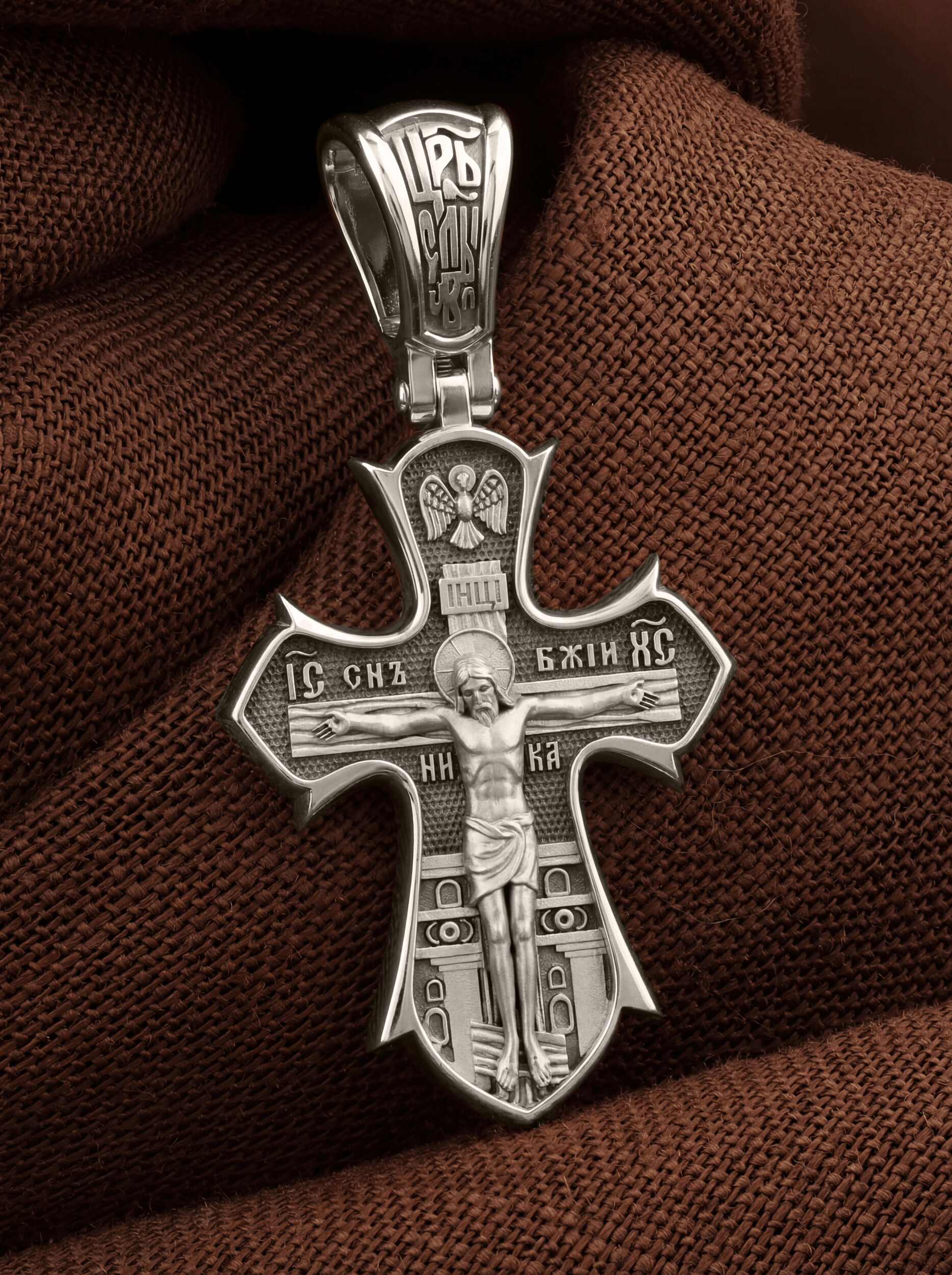 На лицевой стороне креста изображено распятие Господа нашего Иисуса Христа. Позади Распятия видна иерусалимская стена, знак того, что Господь был распят вне стен города. Но вместе с тем стена символизирует и Небесный Иерусалим, путь который открылся для человека через Голгофу. На кулоном кольце видим слова «ЦРЬ СЛВЫ» — Царь Славы. Верхняя перекладина символизирует собой табличку с надписью «IHЦI» — Иисус Назарянин Царь Иудейский. Над перекладиной пишется сокращенно имя Спасителя «IC XC» — Иисус Христос и словосочетание «СНЪ БЖIЙ» — «СЫН БОЖИЙ». Рядом с образом Христа помещены слова — «НИКА» (греч. — Победитель). Возвышение, на котором стоит Крест, символизирует гору Голгофу, на которой произошло Распятие. У подножия Креста изображают прах Адама, обозначенный черепом.