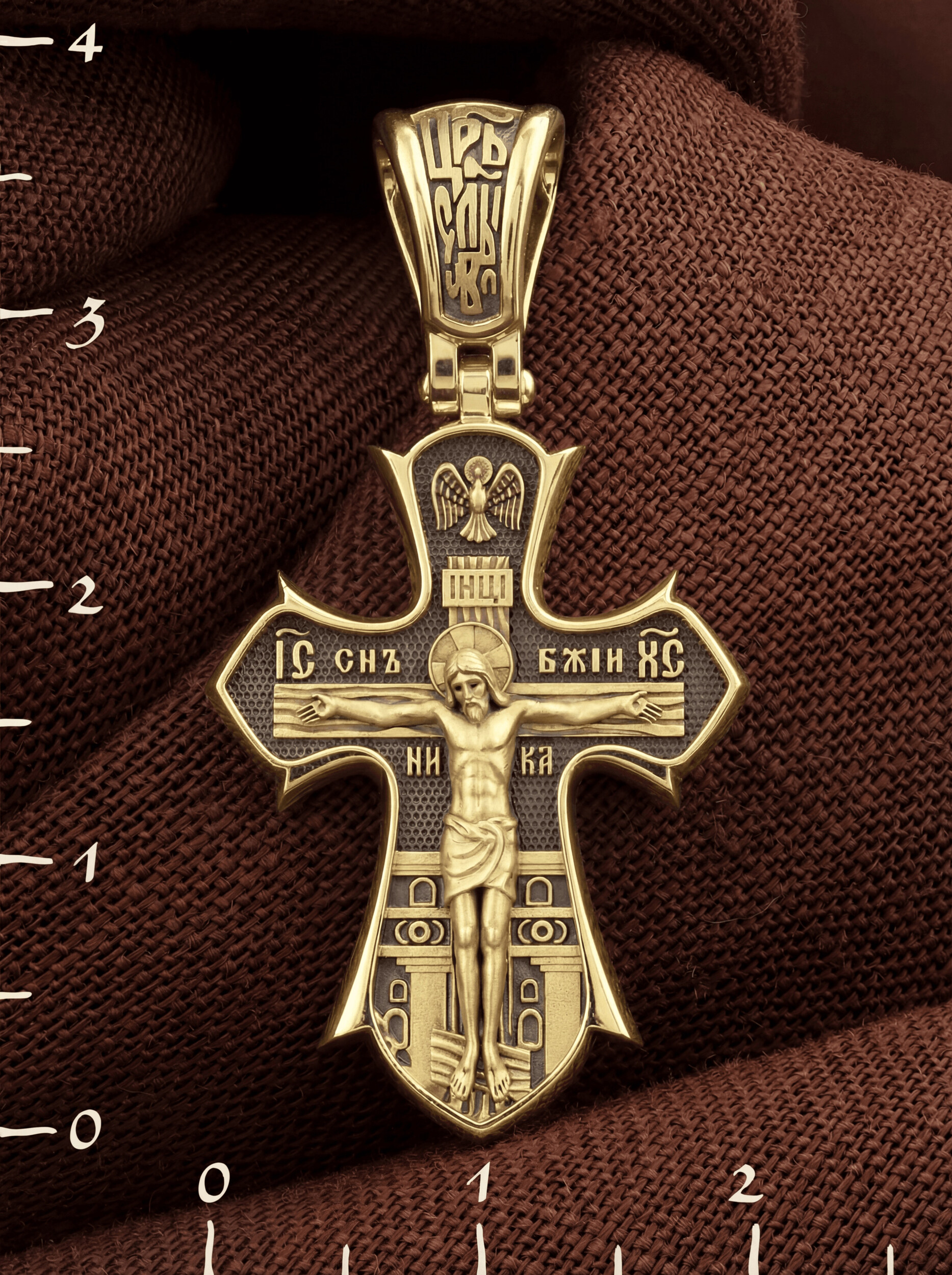 На лицевой стороне креста изображено распятие Господа нашего Иисуса Христа. Позади Распятия видна иерусалимская стена, знак того, что Господь был распят вне стен города. Но вместе с тем стена символизирует и Небесный Иерусалим, путь который открылся для человека через Голгофу. На кулоном кольце видим слова «ЦРЬ СЛВЫ» — Царь Славы. Верхняя перекладина символизирует собой табличку с надписью «IHЦI» — Иисус Назарянин Царь Иудейский. Над перекладиной пишется сокращенно имя Спасителя «IC XC» — Иисус Христос и словосочетание «СНЪ БЖIЙ» — «СЫН БОЖИЙ». Рядом с образом Христа помещены слова — «НИКА» (греч. — Победитель). Возвышение, на котором стоит Крест, символизирует гору Голгофу, на которой произошло Распятие. У подножия Креста изображают прах Адама, обозначенный черепом.