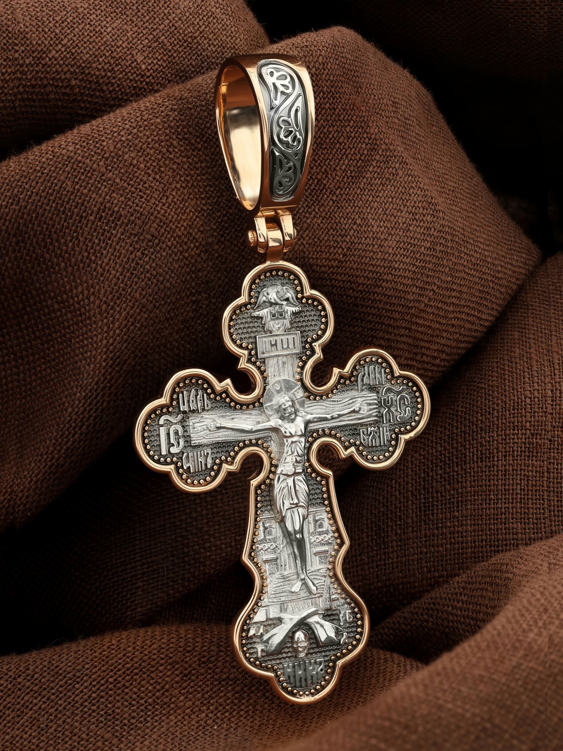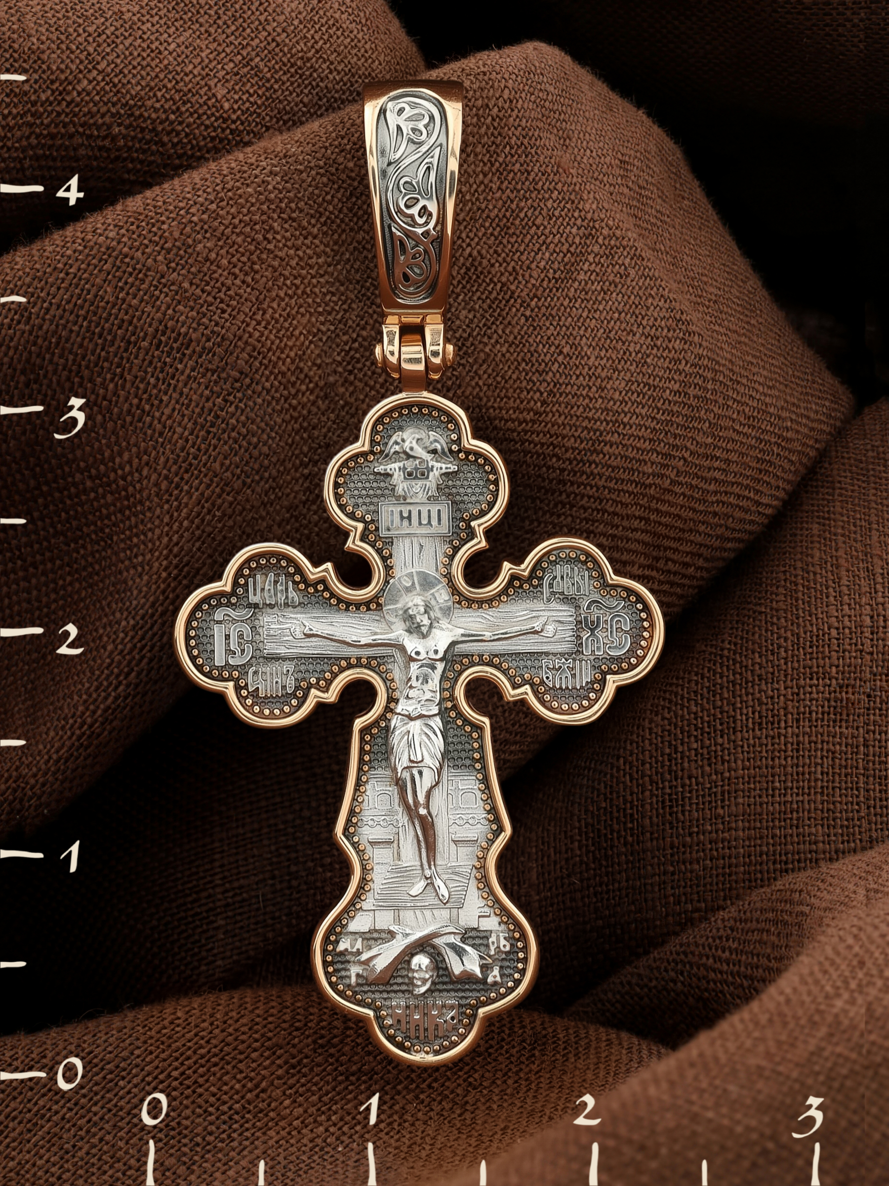 На лицевой стороне креста изображено Распятие Господа и Спасителя нашего Иисуса Христа. Христос, подвергнутый на кресте мучительной казни, своими страданиями искупил нас от древнего греха и даровал нам жизнь вечную. На верхней табличке, выше головы Иисуса, расположена надпись, составленная Понтием Пилатом — «IНЦI». Она означает «Иисус Назорей, Царь Иудейский». Распятие сопровождается каноническими надписями. Надпись «IС ХС» означает Иисус Христос, надпись «Царь Славы» и словосочетание «СЫН БОЖИЙ», что означает божественную природу Иисуса Христа, помещаются на разных сторонах поперечной перекладины креста. В нижней части креста находятся надписи –«НИКА» и «МЛРБ». В переводе с греческого, слово «НИКА» означает «победитель». Именно оно является символом победы Христа над смертью. Надпись «МЛРБ» — «место лобное рай бысть» означает, что место лобное стало раем. Крест стоит на горе камней, символизирующих Голгофу. Под подножием Креста изображена покоящаяся голова (череп) Адама и надпись «Г.А.». Христос в Своей Божественной любви, над которой смерть не властна и которая, страдая, и не страдает в обычном смысле, простирает к людям со Креста Свои объятия, в которые призывается и привлекается весь мир. Поэтому Тело Его не висит, а торжественно покоится на Кресте.