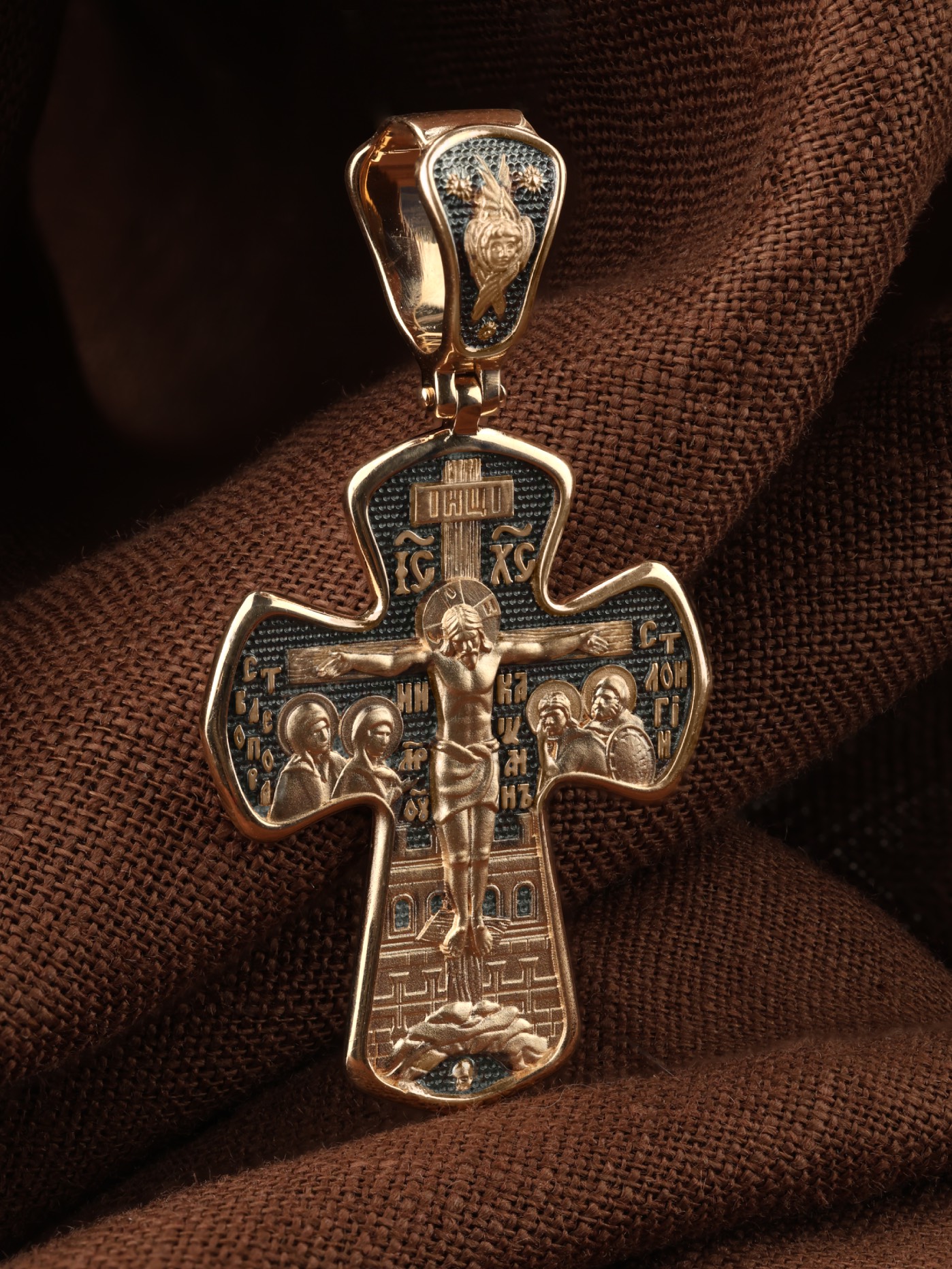 На лицевой стороне креста изображено Распятие Господа и Спасителя нашего Иисуса Христа, отдавшего Себя на смерть, для искупления грехов мира. Господь сказал: кто хочет идти за Мною, отвергнись себя, и возьми крест свой, и следуй за Мною. (Мк. 8: 34). Крест является символом жертвенной любви всеблагого Бога к падшим людям, всепобеждающим духовным оружием христиан, основанием и средоточием церковной жизни. На верхней перекладине помещена надпись «IС» « ХС», что означает Иисус Христос. Ниже — слово «НИКА», что означает «победитель». Слева от Распятия изображена Пресвятая Богородица, справа — апостол и евангелист Иоанн Богослов, один из ближайших учеников Иисуса Христа. За Распятием высится Иерусалимская стена, в знак того, что Господь был распят вне стен города. Возвышение, на котором стоит Крест, символизирует гору Голгофу, на которой произошло Распятие. Под подножием Креста изображена покоящаяся голова (череп) Адама. На кулонном кольце помещен крест.