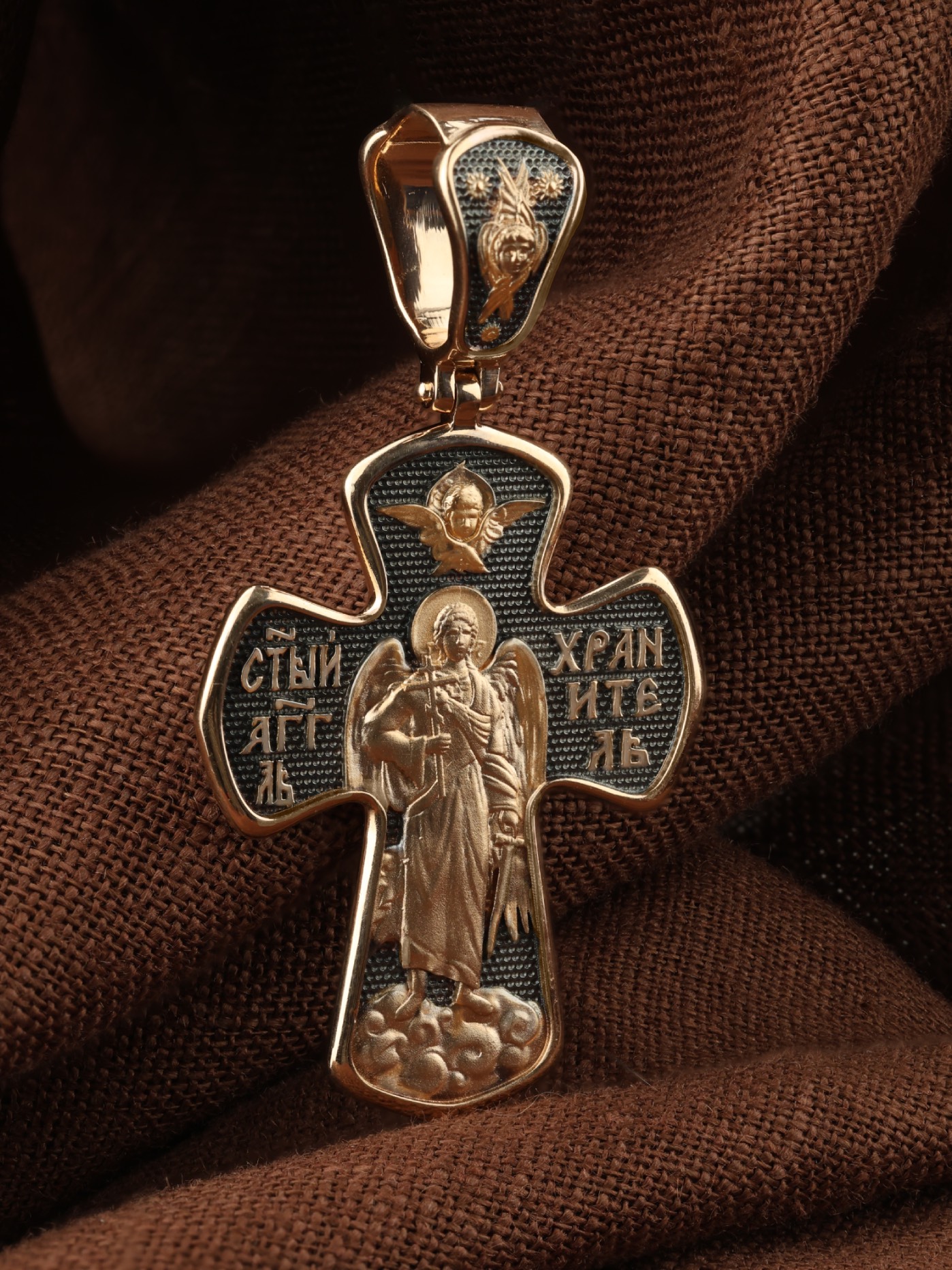 На оборотной стороне креста изображен Святой Ангел-Хранитель держащего в правой руке крест, а в левой — мечь. Ангел-Хранитель — это Ангел приставляемый Богом к человеку при крещении для охраны и помощи в добрых делах. Он невидимо находится при человеке на протяжении всей его жизни, если человек сохраняет в себе любовь к Богу и истинную веру перед Ним. Ангел-Xранитель делают для нас все, что служит к истинному нашему благу и спасению. Невидимо пребывая при нас постоянно, он, руководствуя нас ко спасению, не только по нашему желанию таинственно наставляет нас на все доброе и полезное, не только возносит наши молитвы к Богу, но еще и сам от себя охраняют и защищают нас от врагов видимых и невидимых и ходатайствует за нас пред Богом. Одного лишь каждому из нас он желает — спасения души; к этому он направляет все свои заботы. Над образом помещен Серафим.
