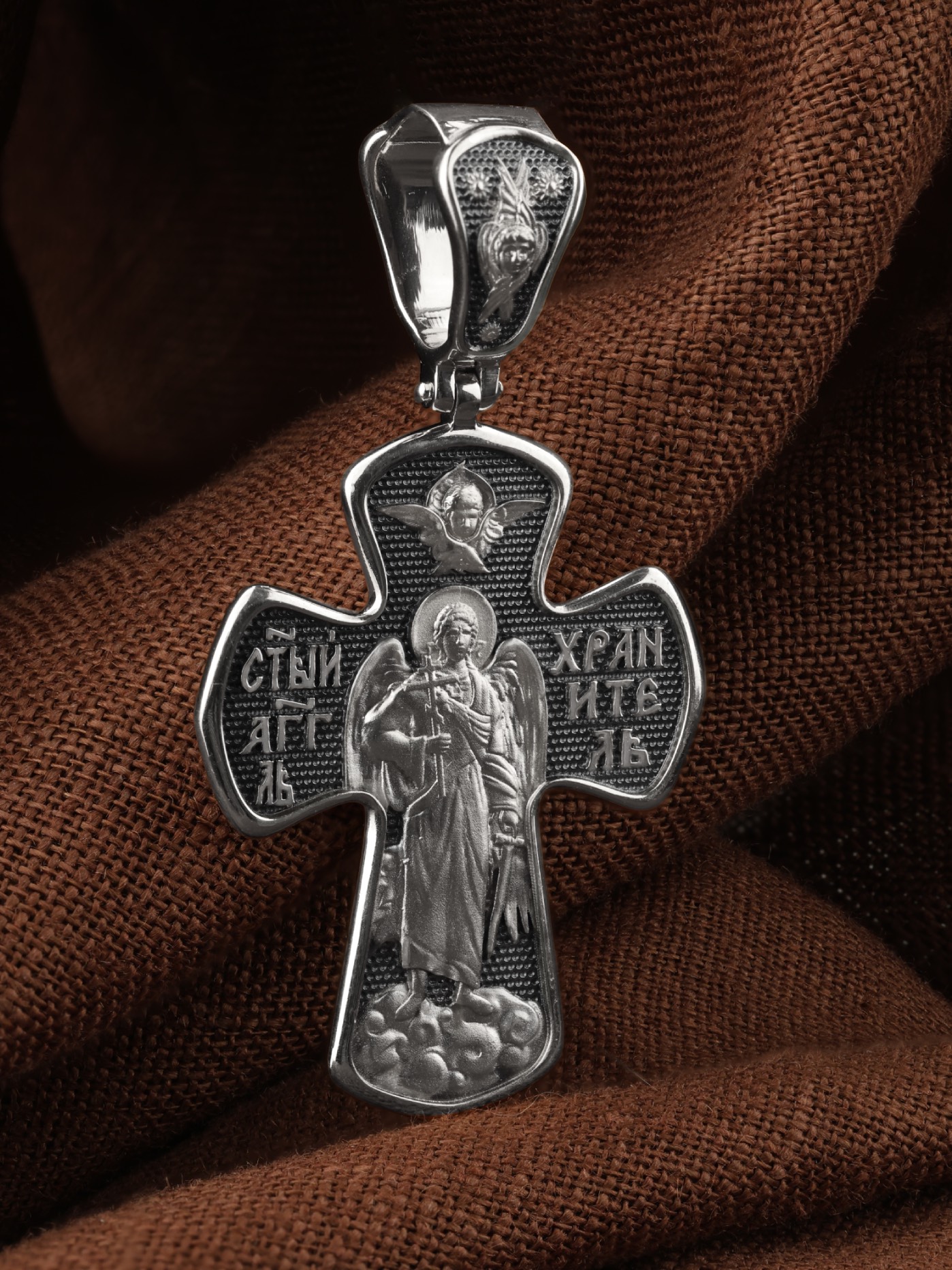 На оборотной стороне креста изображен Святой Ангел-Хранитель держащего в правой руке крест, а в левой — мечь. Ангел-Хранитель — это Ангел приставляемый Богом к человеку при крещении для охраны и помощи в добрых делах. Он невидимо находится при человеке на протяжении всей его жизни, если человек сохраняет в себе любовь к Богу и истинную веру перед Ним. Ангел-Xранитель делают для нас все, что служит к истинному нашему благу и спасению. Невидимо пребывая при нас постоянно, он, руководствуя нас ко спасению, не только по нашему желанию таинственно наставляет нас на все доброе и полезное, не только возносит наши молитвы к Богу, но еще и сам от себя охраняют и защищают нас от врагов видимых и невидимых и ходатайствует за нас пред Богом. Одного лишь каждому из нас он желает — спасения души; к этому он направляет все свои заботы. Над образом помещен Серафим.