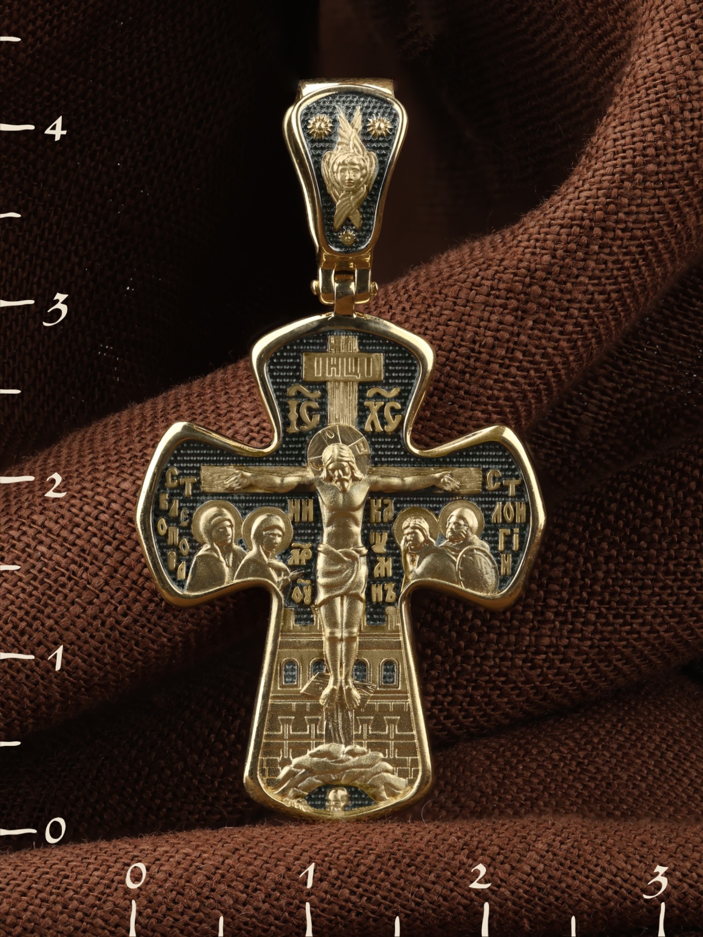 На лицевой стороне креста изображено Распятие Господа и Спасителя нашего Иисуса Христа, отдавшего Себя на смерть, для искупления грехов мира. Господь сказал: кто хочет идти за Мною, отвергнись себя, и возьми крест свой, и следуй за Мною. (Мк. 8: 34). Крест является символом жертвенной любви всеблагого Бога к падшим людям, всепобеждающим духовным оружием христиан, основанием и средоточием церковной жизни. На верхней перекладине помещена надпись «IС» « ХС», что означает Иисус Христос. Ниже — слово «НИКА», что означает «победитель». Слева от Распятия изображена Пресвятая Богородица, справа — апостол и евангелист Иоанн Богослов, один из ближайших учеников Иисуса Христа. За Распятием высится Иерусалимская стена, в знак того, что Господь был распят вне стен города. Возвышение, на котором стоит Крест, символизирует гору Голгофу, на которой произошло Распятие. Под подножием Креста изображена покоящаяся голова (череп) Адама. На кулонном кольце помещен крест.