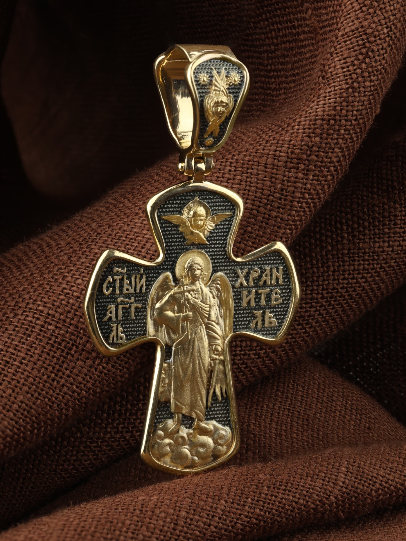 На оборотной стороне креста изображен Святой Ангел-Хранитель держащего в правой руке крест, а в левой — мечь. Ангел-Хранитель — это Ангел приставляемый Богом к человеку при крещении для охраны и помощи в добрых делах. Он невидимо находится при человеке на протяжении всей его жизни, если человек сохраняет в себе любовь к Богу и истинную веру перед Ним. Ангел-Xранитель делают для нас все, что служит к истинному нашему благу и спасению. Невидимо пребывая при нас постоянно, он, руководствуя нас ко спасению, не только по нашему желанию таинственно наставляет нас на все доброе и полезное, не только возносит наши молитвы к Богу, но еще и сам от себя охраняют и защищают нас от врагов видимых и невидимых и ходатайствует за нас пред Богом. Одного лишь каждому из нас он желает — спасения души; к этому он направляет все свои заботы. Над образом помещен Серафим.