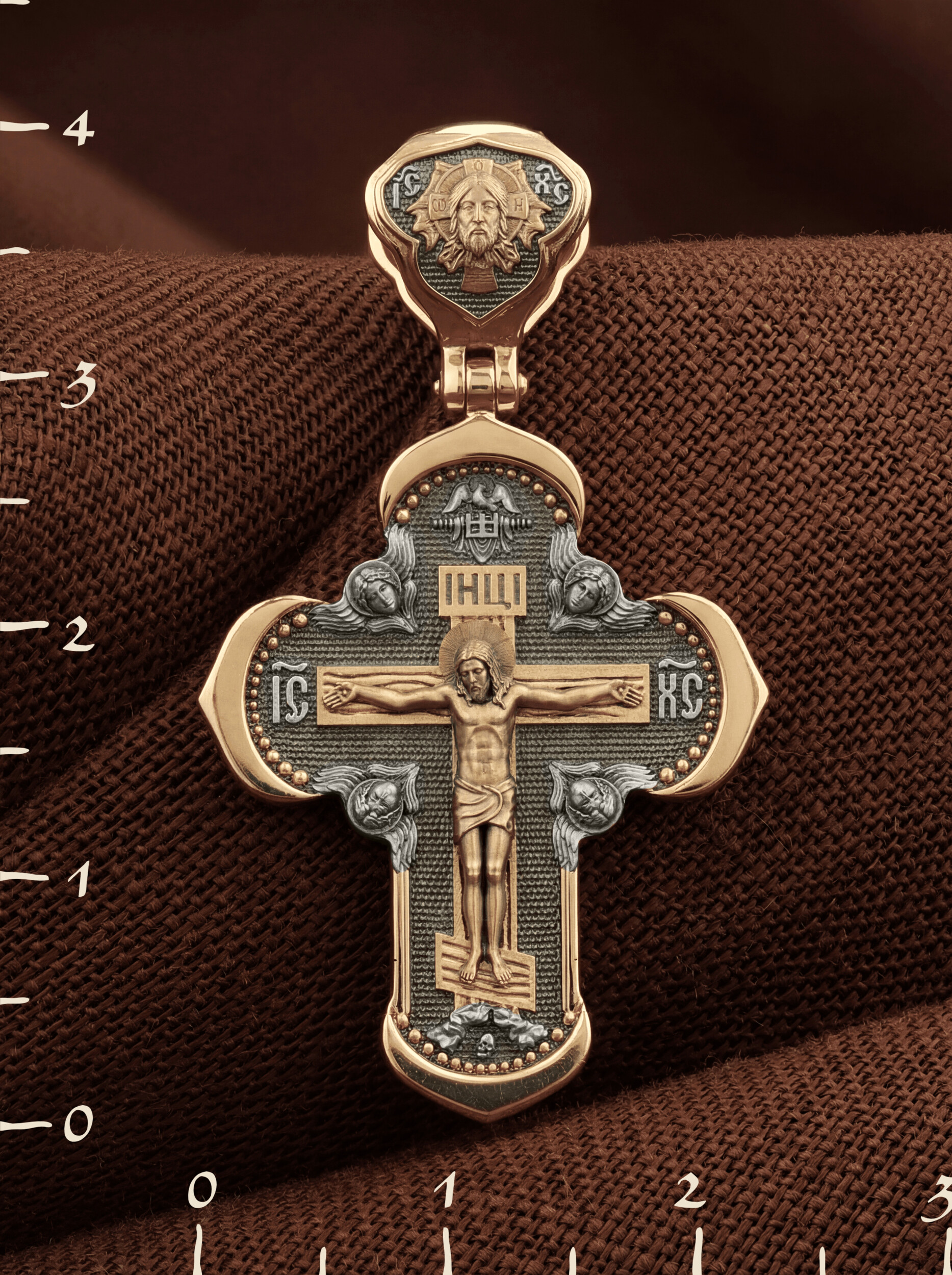На лицевой стороне креста изображено Распятие Господа и Спасителя нашего Иисуса Христа, отдавшего Себя на смерть, для искупления грехов мира. Крест является символом жертвенной любви Всеблагого Бога к падшим людям, всепобеждающим духовным оружием христиан, основанием и средоточием церковной жизни. Господь сказал: «кто хочет идти за Мною, отвергнись себя, и возьми крест свой, и следуй за Мною». (Мк. 8: 34). На верхней табличке, выше головы Иисуса, расположена надпись, составленная Понтием Пилатом — «IНЦI». Она означает «Иисус Назорей, Царь Иудейский». Надпись «IC» «ХC», означает Иисус Христос, помещается на разных сторонах поперечной перекладины креста. Крест стоит на горе камней, символизирующих Голгофу. В ее основании различается череп– это голова Адама. На кулонном кольце изображен Нерукотворный образ Господа и Спасителя нашего Иисуса Христа, чудесно отпечатавшийся на плате, которым Христос вытер свой лик.