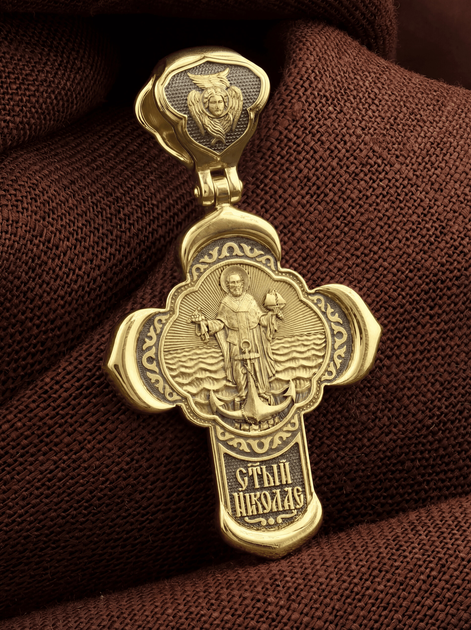 На лицевой стороне креста изображено Распятие Господа и Спасителя нашего Иисуса Христа, отдавшего Себя на смерть, для искупления грехов мира. Крест является символом жертвенной любви Всеблагого Бога к падшим людям, всепобеждающим духовным оружием христиан, основанием и средоточием церковной жизни. Господь сказал: «кто хочет идти за Мною, отвергнись себя, и возьми крест свой, и следуй за Мною». (Мк. 8: 34). На верхней табличке, выше головы Иисуса, расположена надпись, составленная Понтием Пилатом — «IНЦI». Она означает «Иисус Назорей, Царь Иудейский». Надпись «IC» «ХC», означает Иисус Христос, помещается на разных сторонах поперечной перекладины креста. Крест стоит на горе камней, символизирующих Голгофу. В ее основании различается череп– это голова Адама. На кулонном кольце изображен Нерукотворный образ Господа и Спасителя нашего Иисуса Христа, чудесно отпечатавшийся на плате, которым Христос вытер свой лик.