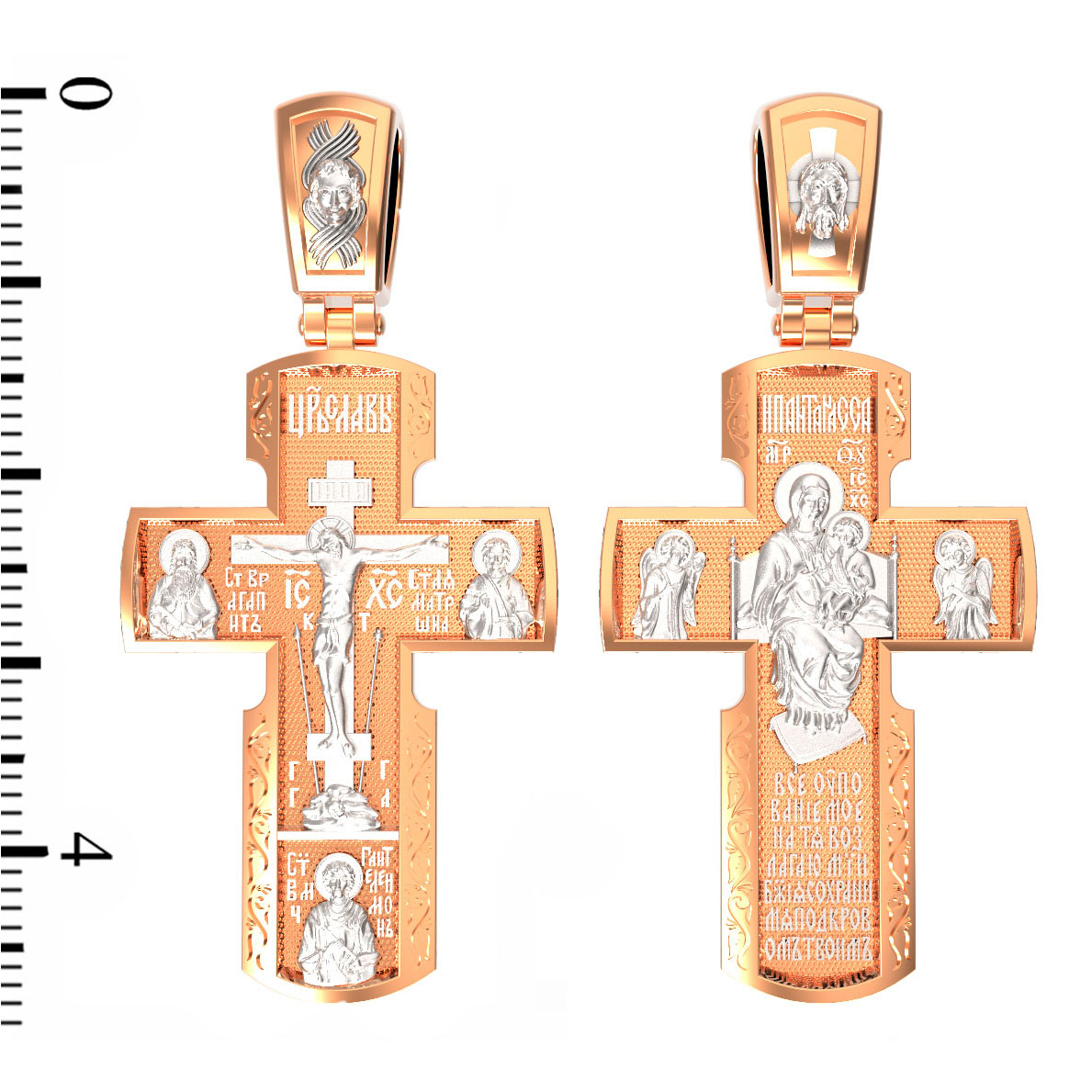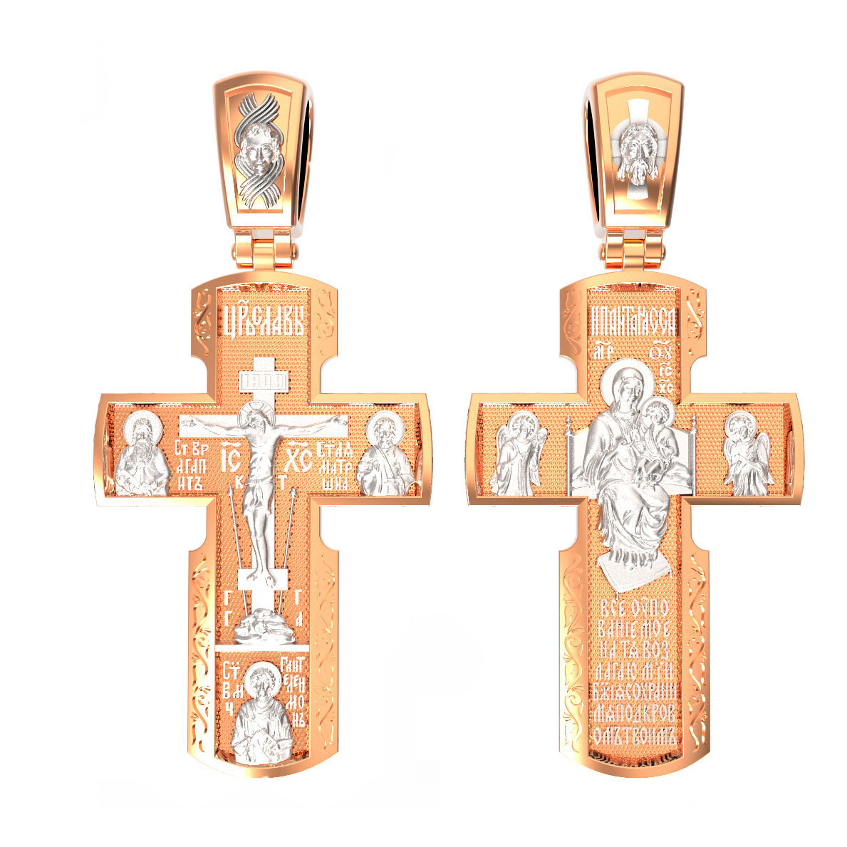 Как действенная помощь в немощах и болезнях был создан крест с образами святых целителей и со знаменитой афонской иконой Божией Матери «Всецарица». Над титлом видим слова «ЦРЬ СЛВЫ» — Царь Славы. Верхняя перекладина символизирует собой табличку с надписью «IHЦI» — Иисус Назарянин Царь Иудейский. Под перекладиной пишется сокращенно имя Спасителя «IC XC» — Иисус Христос. Возвышение, на котором стоит Крест, символизирует гору Голгофу, на которой произошло Распятие. У подножия Креста изображают прах Адама, обозначенный черепом. Справа от Распятия помещен образ прославленной святой блаженной Матроны. Слева — икона преподобный Агапита. Этот святой жил в пещерах Киево-Печерского монастыря в XI веке и бескорыстно врачевал мирян и монахов. У основания Креста Господня изображен великомученик Пантелеимон Целитель. Господь даровал удивительную силу его молитве. Ею он исцелял любые болезни и даже воскрешал умерших.