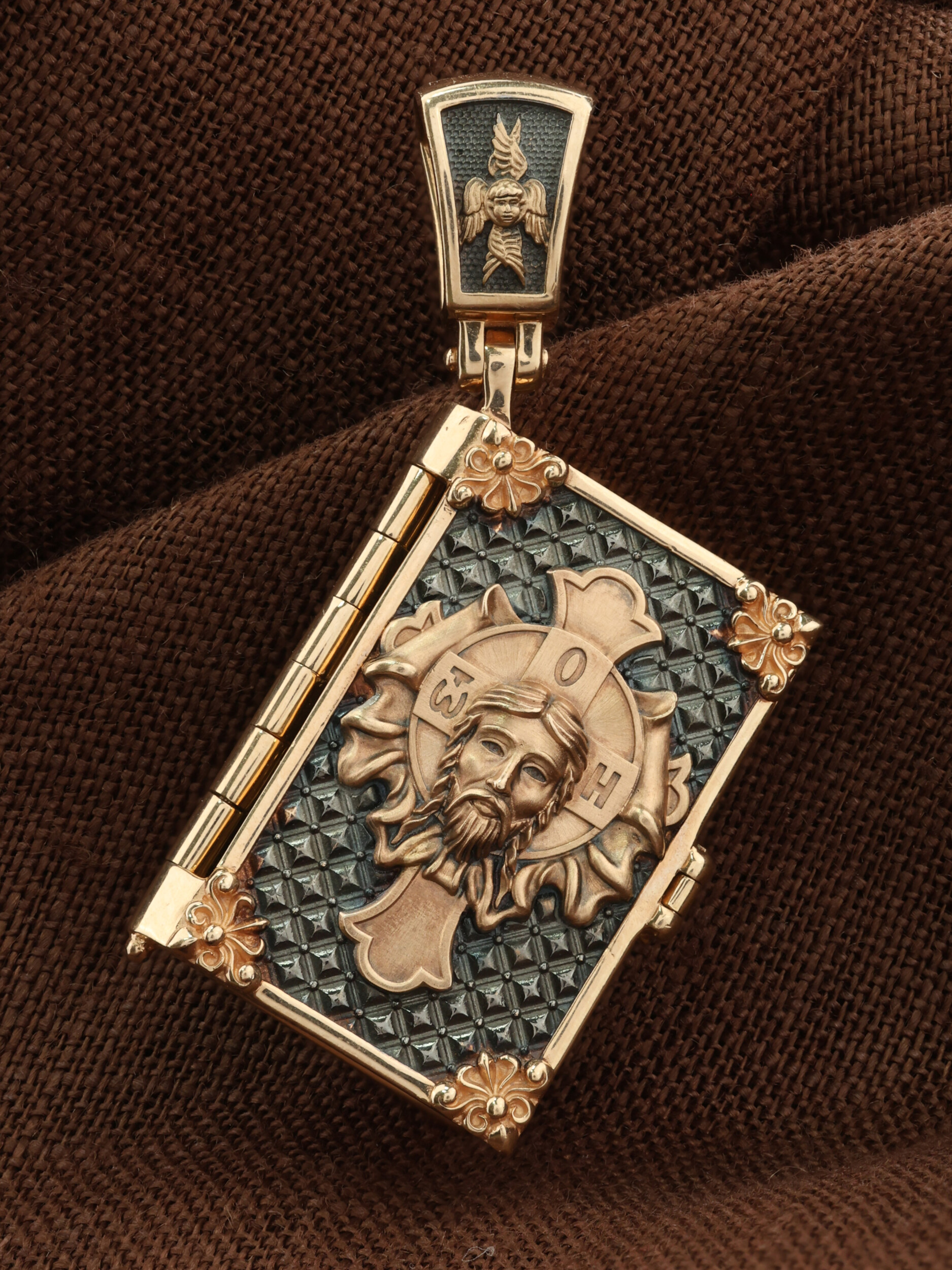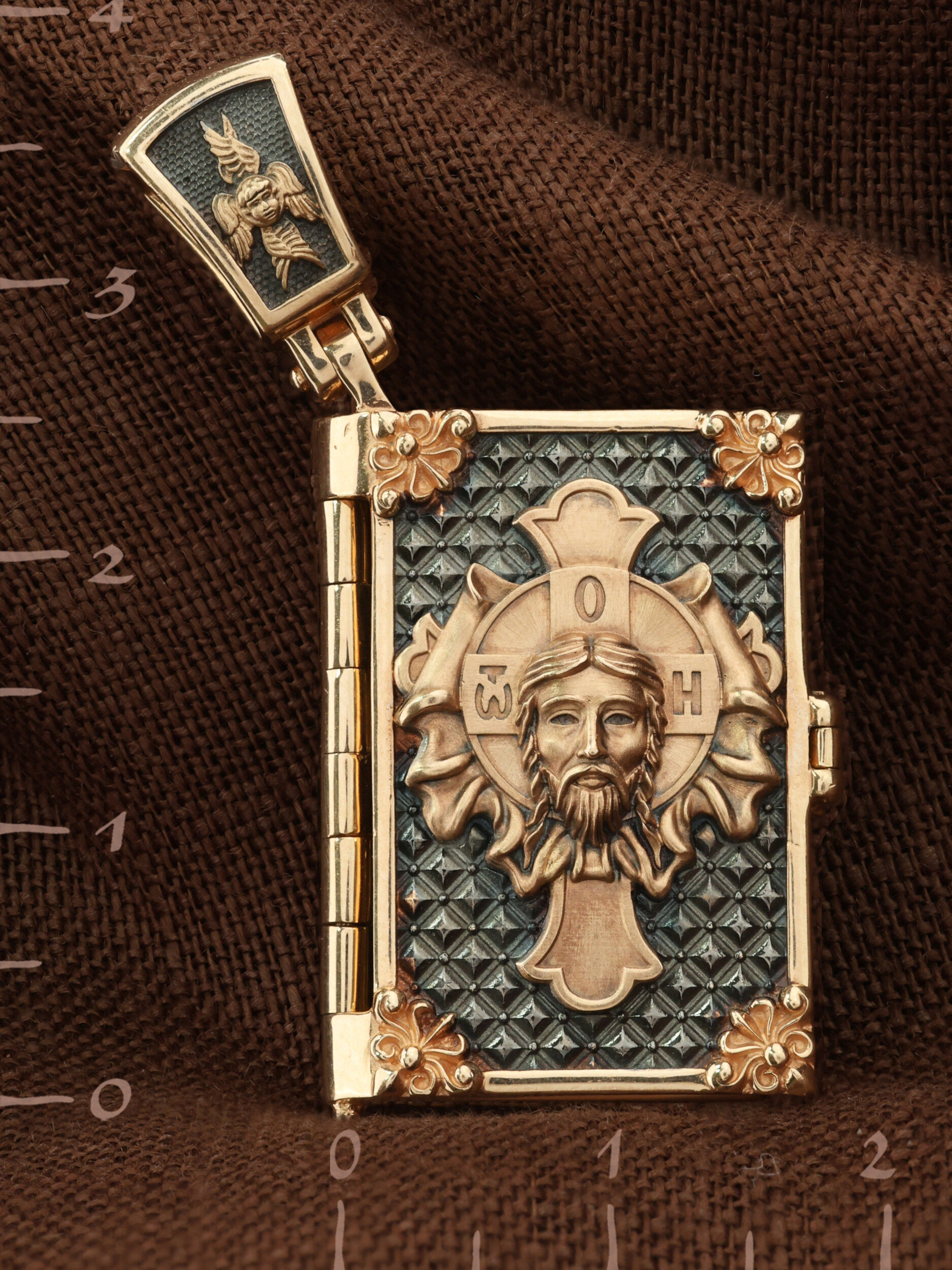 Специальная застежка сбоку скрывает внутреннее содержимое изделия — страницы, на которых выгровированы слова молитвы «Отче наш»: «Отче наш, Иже еси на небесех! Да святится имя Твое, да приидет Царствие Твое, да будет воля Твоя, яко на небеси и на земли. Хлеб наш насущный даждь нам днесь; и остави нам долги наша, яко и мы оставляем должником нашим; и не введи нас в напасть, но избави нас от лукаваго: Яко твое есть царствие и сила и слава во веки. Аминь».
