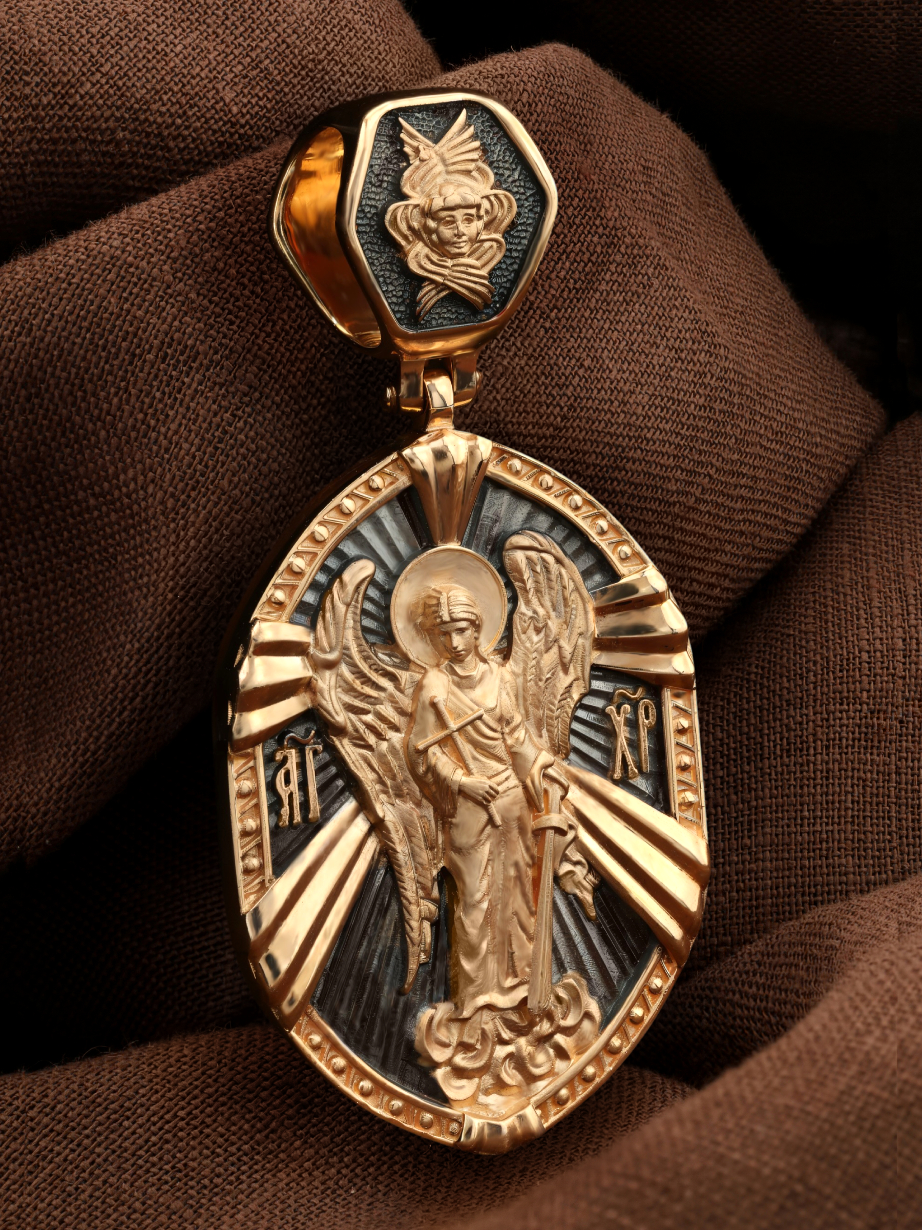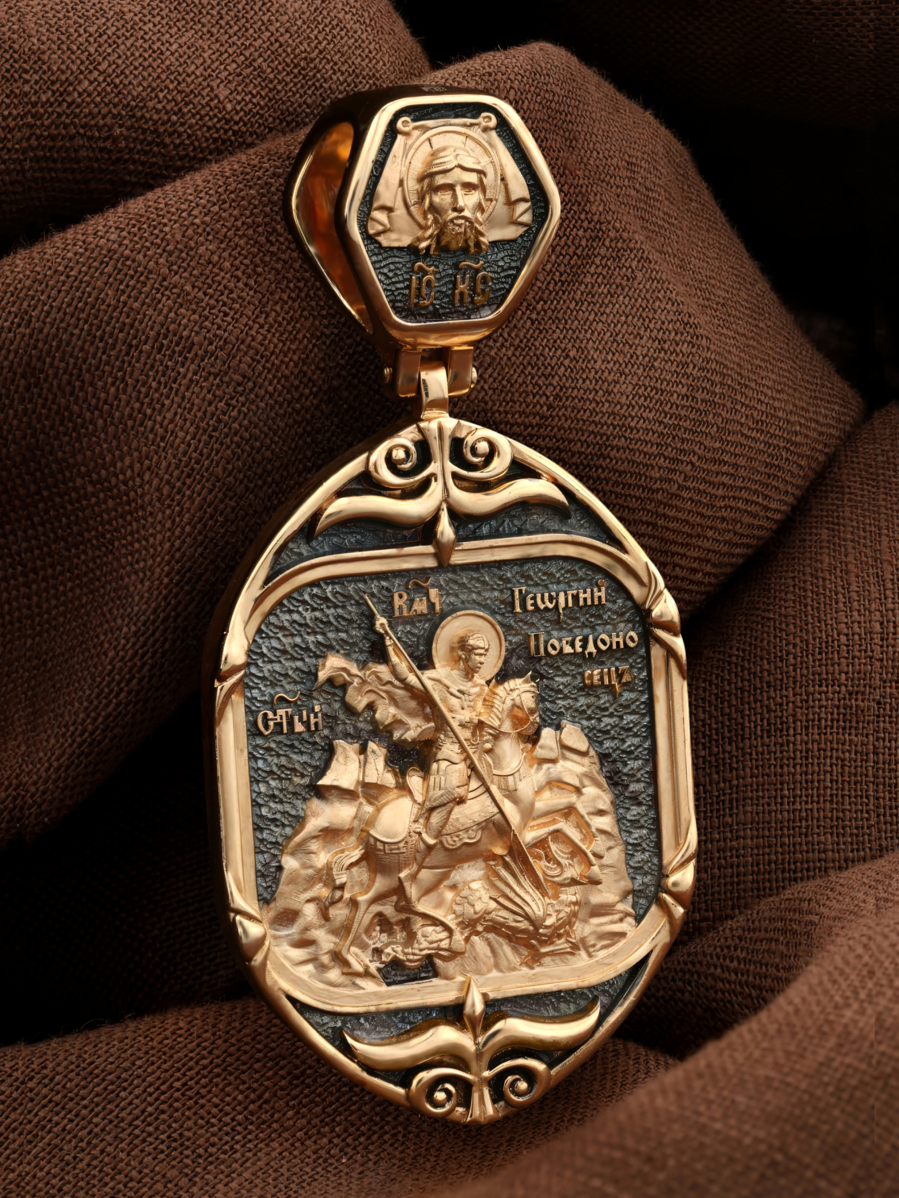 На кулонном кольце изображен Спас Нерукотворный — Символ вочеловечившегося Божества.
