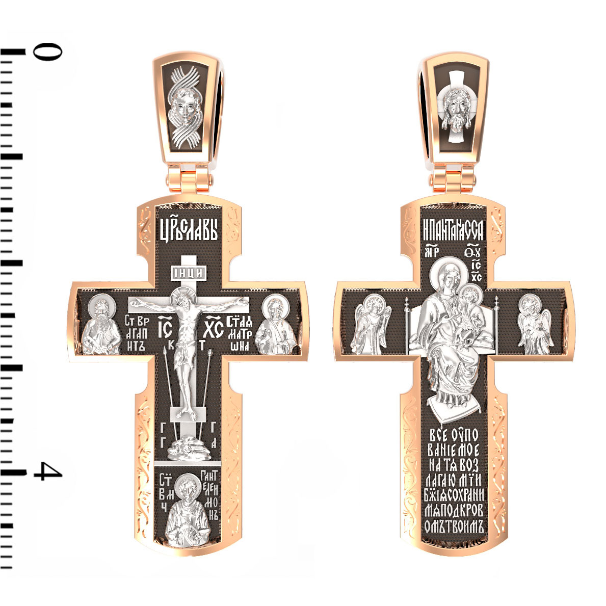 Как действенная помощь в немощах и болезнях был создан крест с образами святых целителей и со знаменитой афонской иконой Божией Матери «Всецарица». Над титлом видим слова «ЦРЬ СЛВЫ» — Царь Славы. Верхняя перекладина символизирует собой табличку с надписью «IHЦI» — Иисус Назарянин Царь Иудейский. Под перекладиной пишется сокращенно имя Спасителя «IC XC» — Иисус Христос. Возвышение, на котором стоит Крест, символизирует гору Голгофу, на которой произошло Распятие. У подножия Креста изображают прах Адама, обозначенный черепом. Справа от Распятия помещен образ прославленной святой блаженной Матроны. Слева — икона преподобный Агапита. Этот святой жил в пещерах Киево-Печерского монастыря в XI веке и бескорыстно врачевал мирян и монахов. У основания Креста Господня изображен великомученик Пантелеимон Целитель. Господь даровал удивительную силу его молитве. Ею он исцелял любые болезни и даже воскрешал умерших.