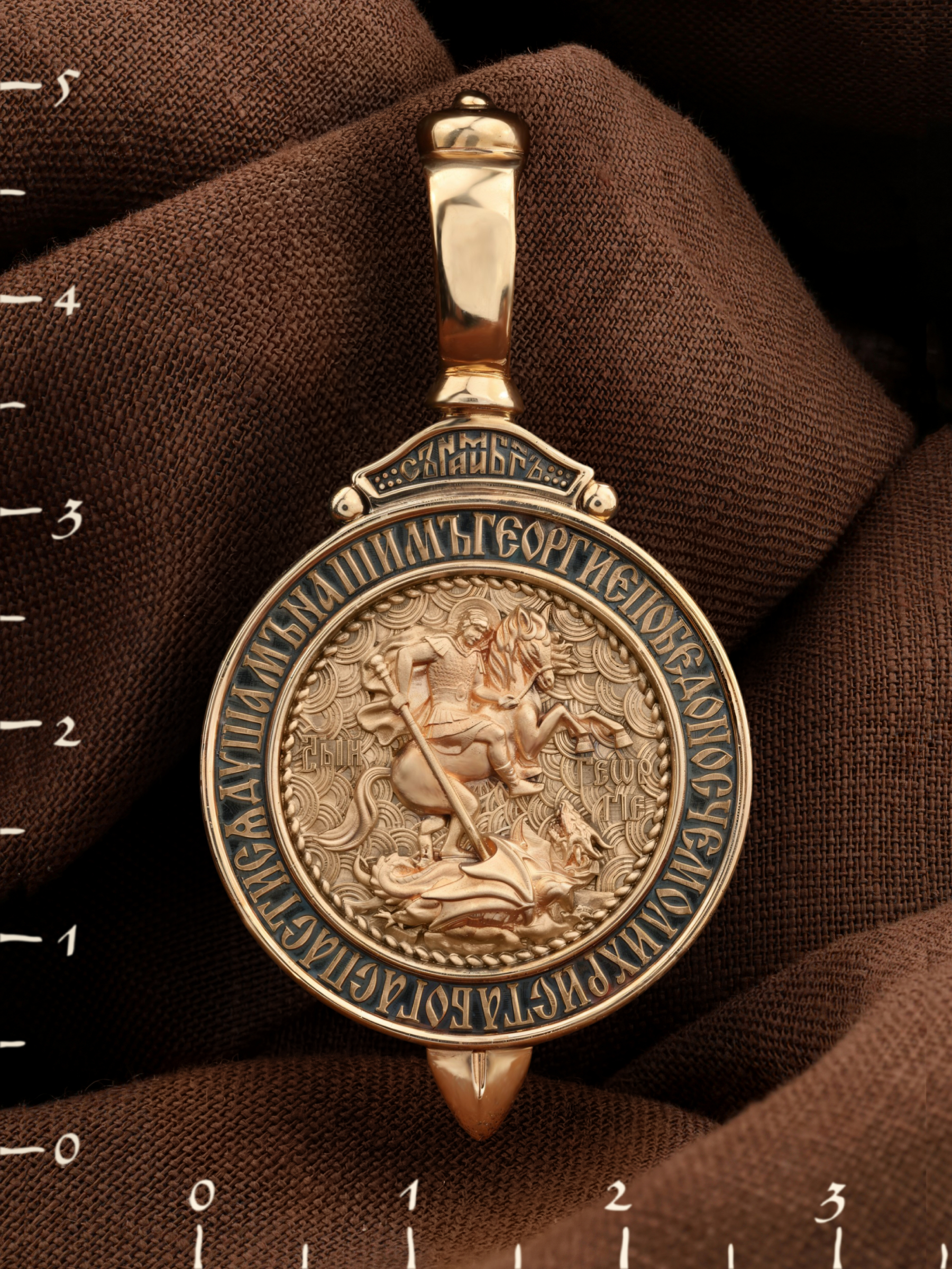 Основой композиции лицевой стороны является изображение Святого Великомученика Георгия Победоносца — одного из самых почитаемых и удивительных святых. На Руси он известен как Юрий или Егорий, покровитель воинов, помощник в крестьянском труде. На образке он изображен как воитель, сидящий на вздыбленном коне и поражающий копьем огнедышащего змея. Змей символизирует собою сатанинские силы. Молитвами вознесенными к Всевышнему и своей непреклонной верой он смог одолеть чудовище. Святой убил змея, спас царскую дочь, принесенную в жертву, и жителей города, их души от влияния дьявола, породив в них надежду и веру в Господа, призывая людей принять христианскую веру. Изображение святого великомученика Георгия Победоносца обрамлено словами молитвы: «Геогрие Победоносче, моли Христа Бога спастися душам нашим».