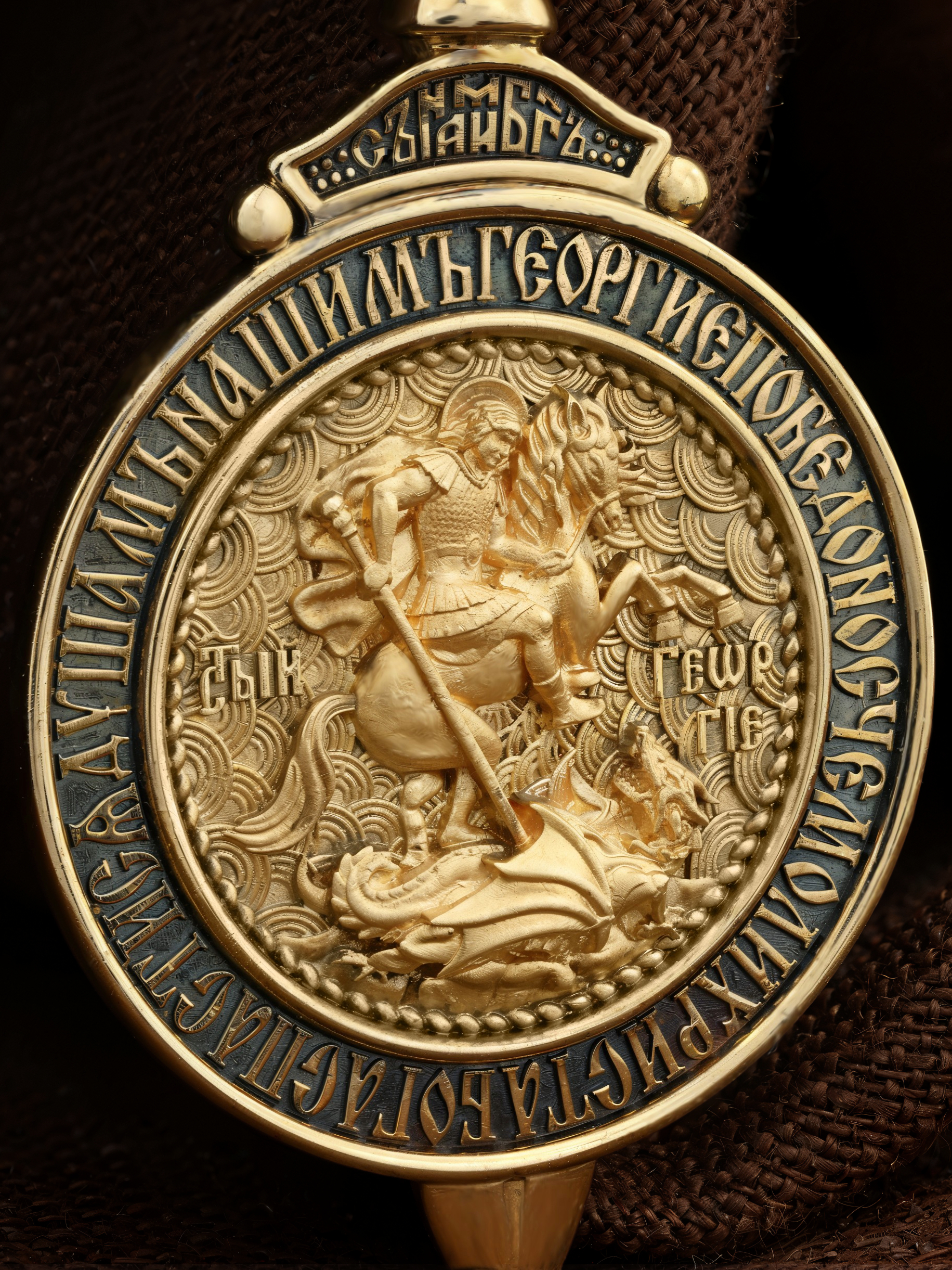 Основой композиции лицевой стороны является изображение Святого Великомученика Георгия Победоносца — одного из самых почитаемых и удивительных святых. На Руси он известен как Юрий или Егорий, покровитель воинов, помощник в крестьянском труде. На образке он изображен как воитель, сидящий на вздыбленном коне и поражающий копьем огнедышащего змея. Змей символизирует собою сатанинские силы. Молитвами вознесенными к Всевышнему и своей непреклонной верой он смог одолеть чудовище. Святой убил змея, спас царскую дочь, принесенную в жертву, и жителей города, их души от влияния дьявола, породив в них надежду и веру в Господа, призывая людей принять христианскую веру. Изображение святого великомученика Георгия Победоносца обрамлено словами молитвы: «Геогрие Победоносче, моли Христа Бога спастися душам нашим».