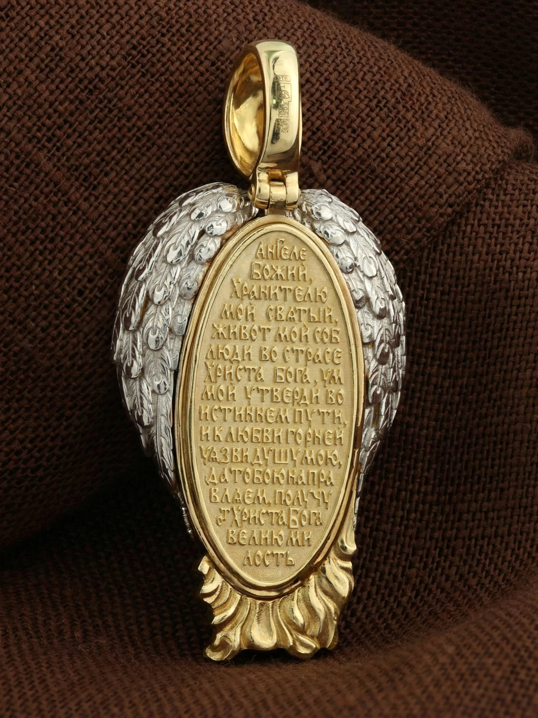 На оборотной стороне размещена молитва: «Ангеле Божий, хранителю мой святый, живот мой соблюди во страсе Христа Бога, ум мой утверди во истиннем пути, и к любви горней уязви душу мою, да тобою направляем, получу от Христа Бога велию милость».