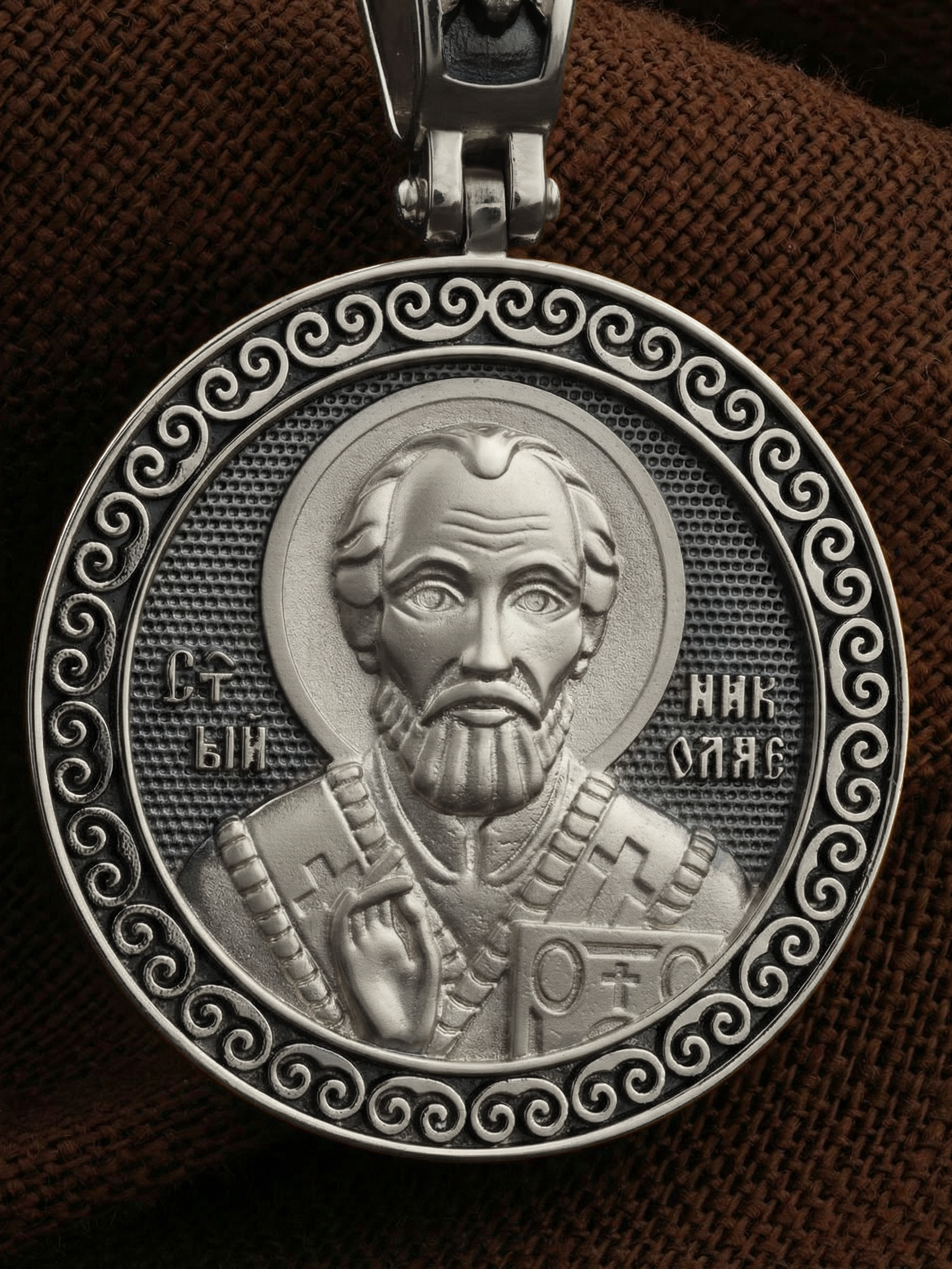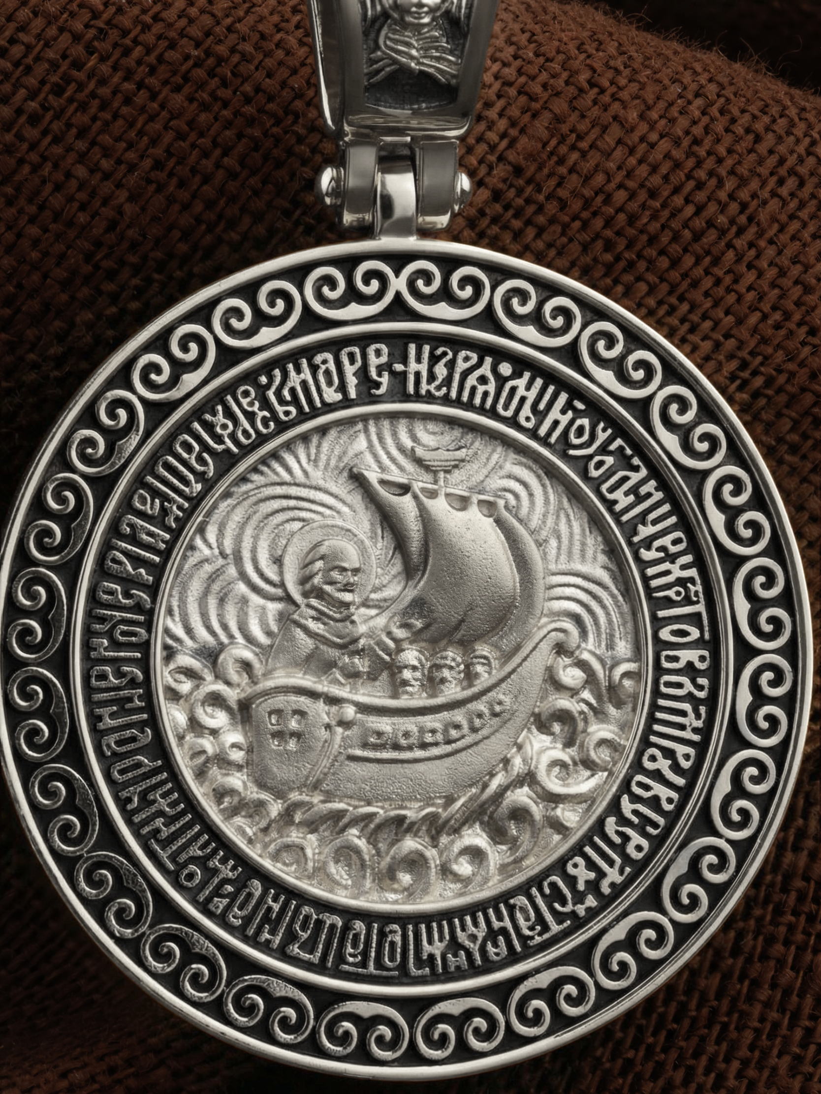 Лицевую сторону возглавляет икона Святителя Николая Чудотворца. Живший в III веке епископ Ликийского города Миры — самый почитаемый святой не только в России, но и во всем мире. Николай Чудотворец, помощник в делах, покровитель учащихся, утешитель обиженных и нуждающихся, целитель самых страшных и тяжелых недугов, предстатель и молитвенник за людей перед Богом. Также Святитель Николай Чудотворец известен своими молитвами за путешественников, когда непрестанный ветер и бушующие волны утихают и корабль заходит в спокойную гавань.