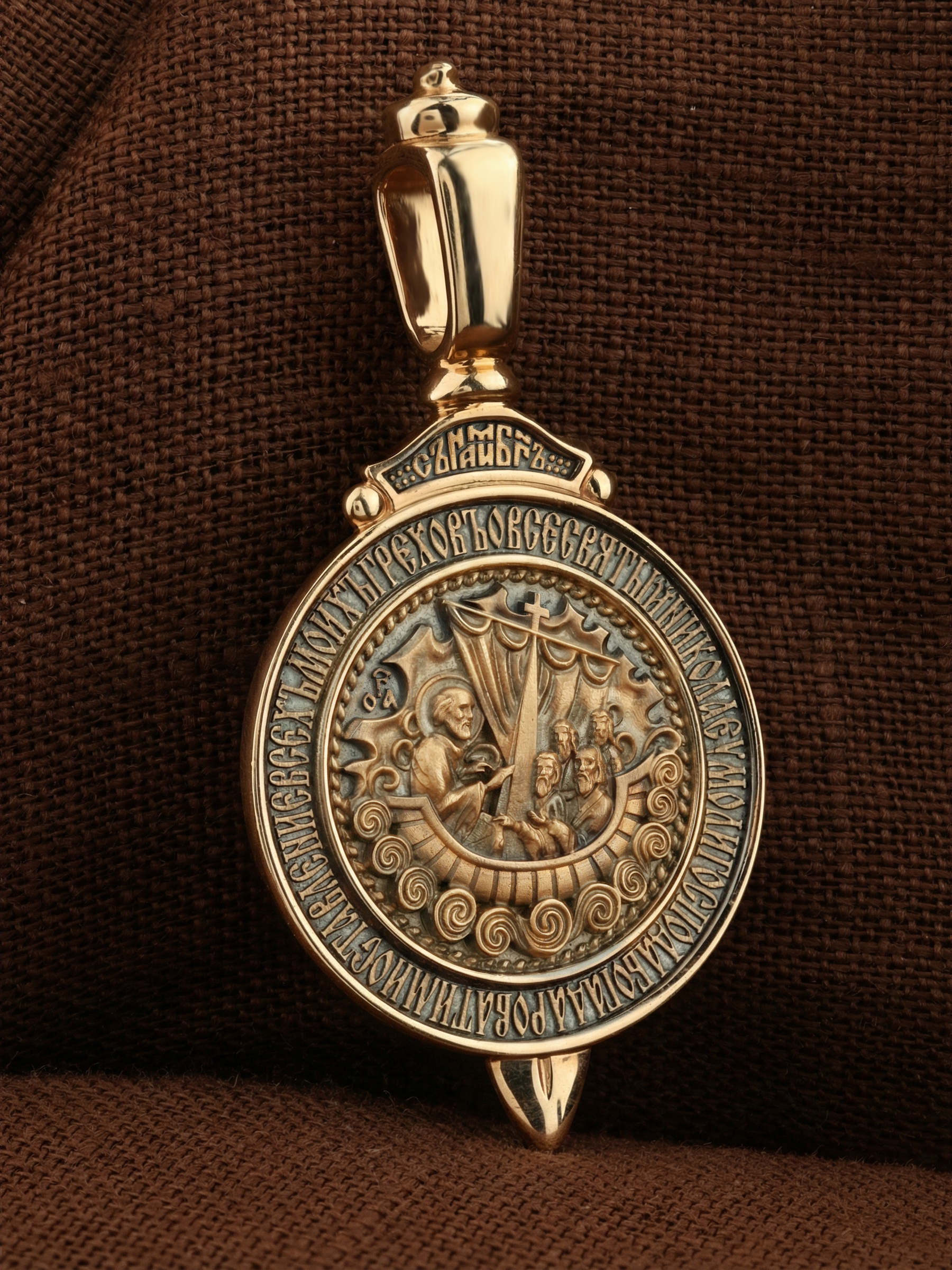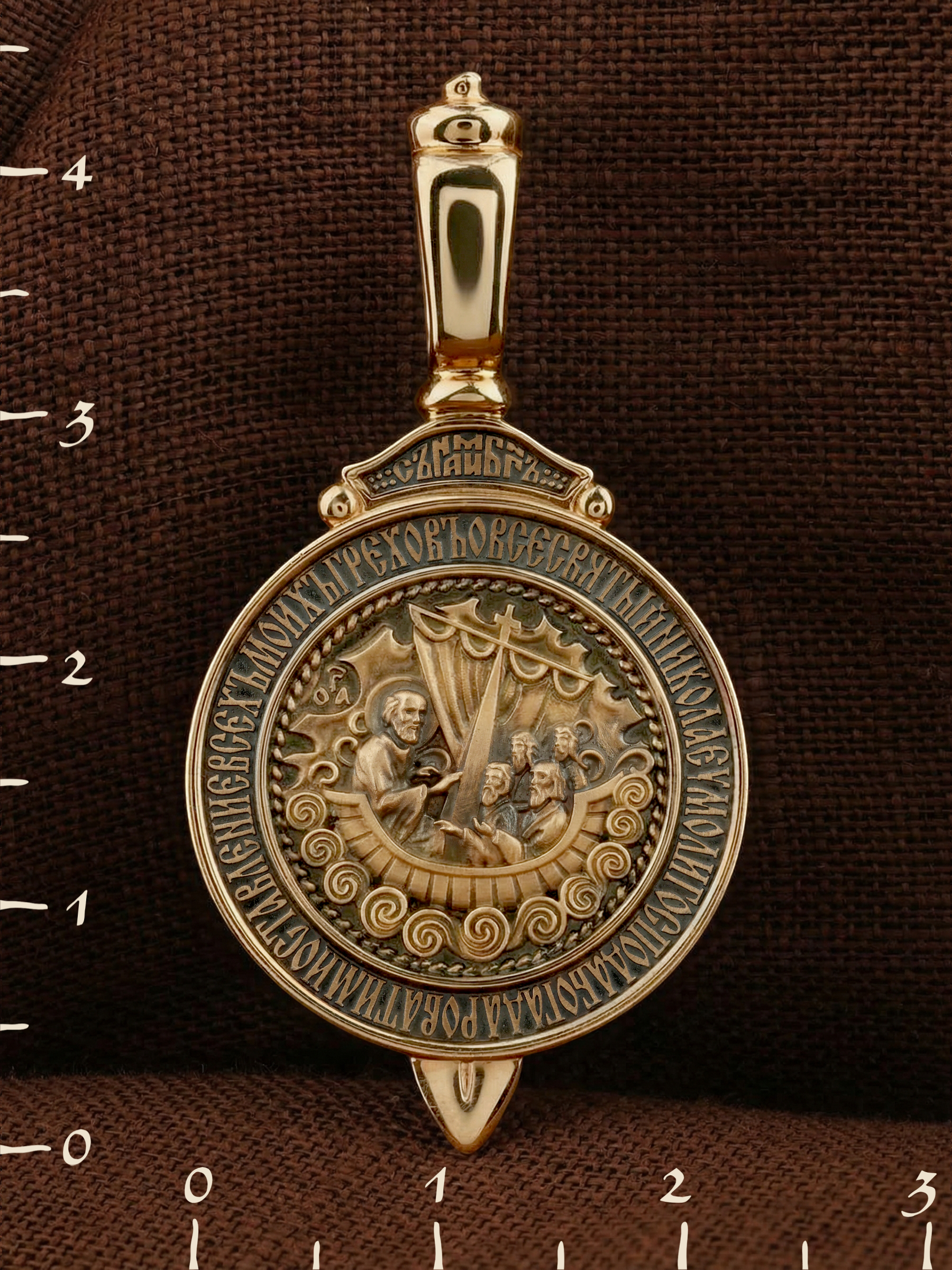 На обороте изображена икона «Чудо спасения трех корабельщиков». Икона рассказывает о том, как погибающие в море купцы обратились за помощью к свт. Николаю и были чудесно им спасены. Сначала они были, как пророк Иона, проглочены рыбой, потом «исплюнуты» ею на поднявшийся из морских пучин камень, а затем на камне, как на корабле, доставлены к городу. Правитель города, узнав о злодействе грабителей-корабельщиков, наказал их и вернул купцам товары. Вокруг — слова молитвы: «О Всесвятый Николае, умоли Господа Бога даровати ми оставление всех моих грехов».