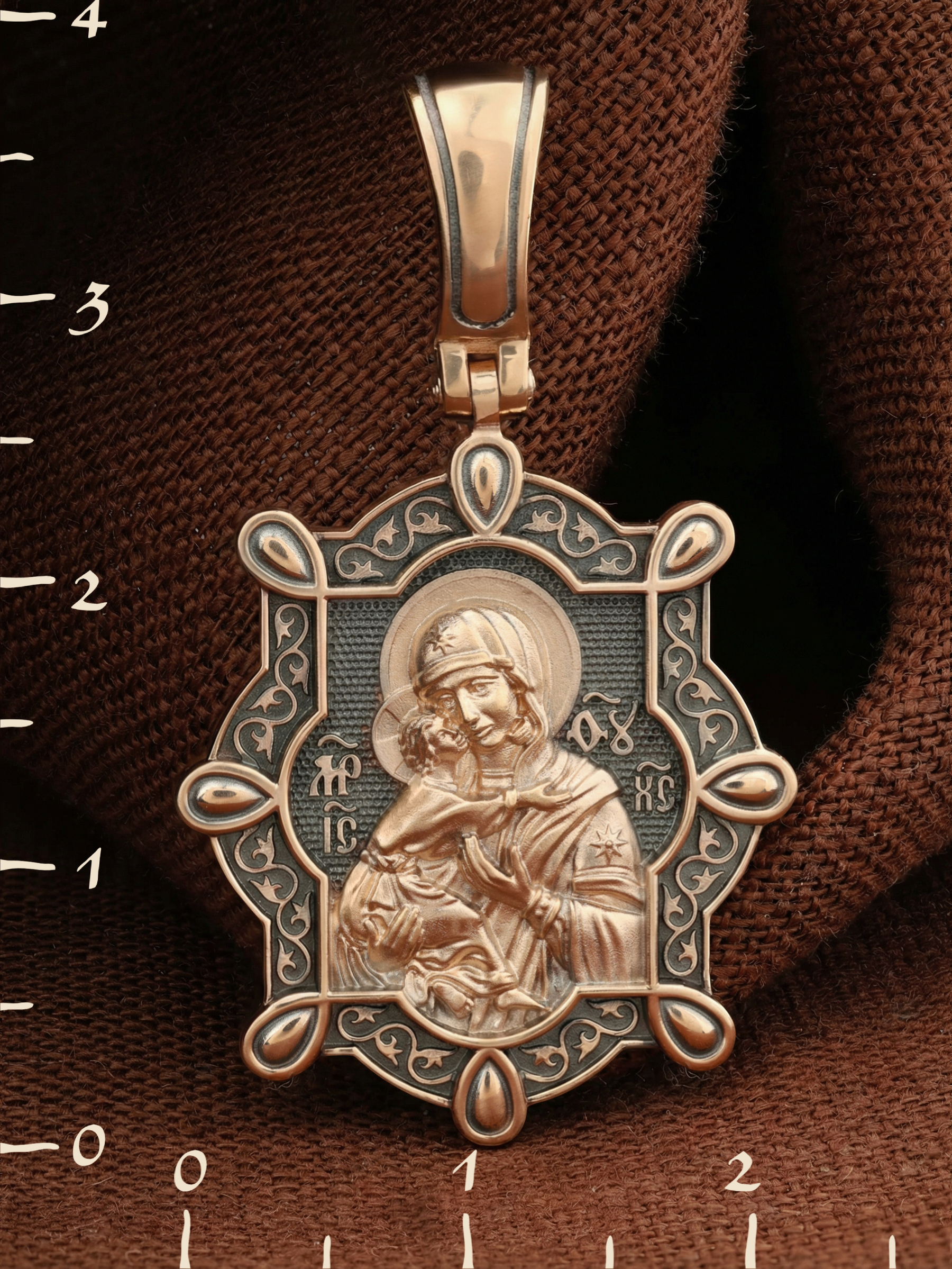 Лицевую сторону возглавляет Владимирская икона Божией Матери — самая великая русская святыня, многие века бывшая олицетворением нашей земли. Перед ней венчались на царство государи, избирались патриархи. Пречистой Богородице Владимирской клялись в верности Отечеству солдаты и за нее умирали на поле брани. Именно на ее защиту более всего уповала Россия в самые страшные периоды своей истории. Владимирская икона Божией Матери, по преданию, была написана на доске трапезного стола из дома Иисуса Христа. На Русь она была привезена в начале XII века и с тех пор почитается как главная святыня нашего Отечества. Перед ней молитвенно просят Богородицу об исцелении от телесных недугов, в частности, заболеваний сердца и сердечнососудистой системы. За помощью к ней обращаются во время бедствий, когда нуждаются в защите от врагов.