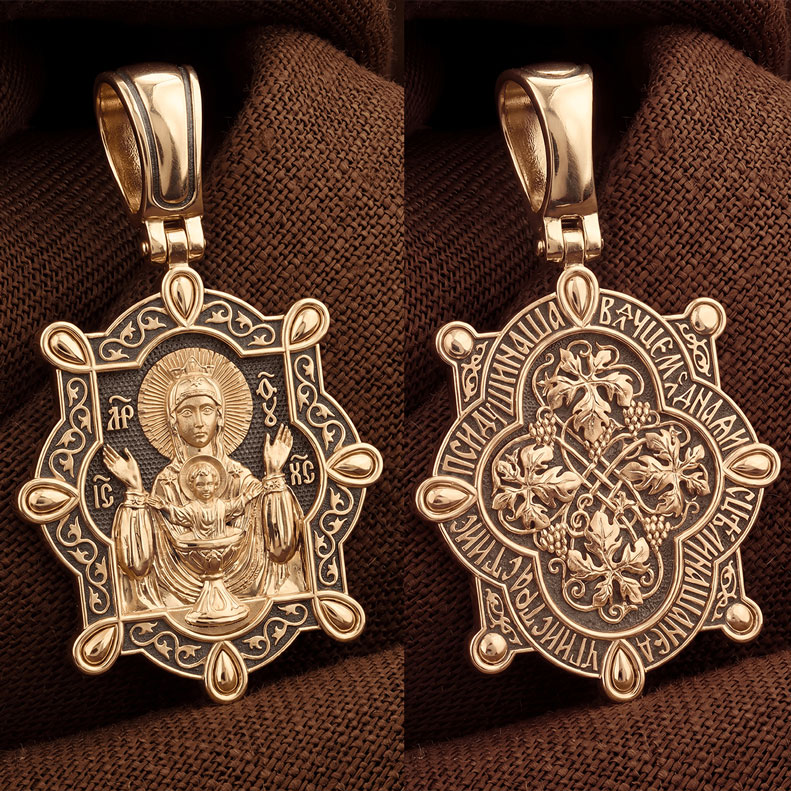 На лицевой части образка изображена икона Божией Матери «Неупиваемая чаша». Икона славится помощью в исцелении зависимостей, помогает людям обрести свободу от греховных страстей.