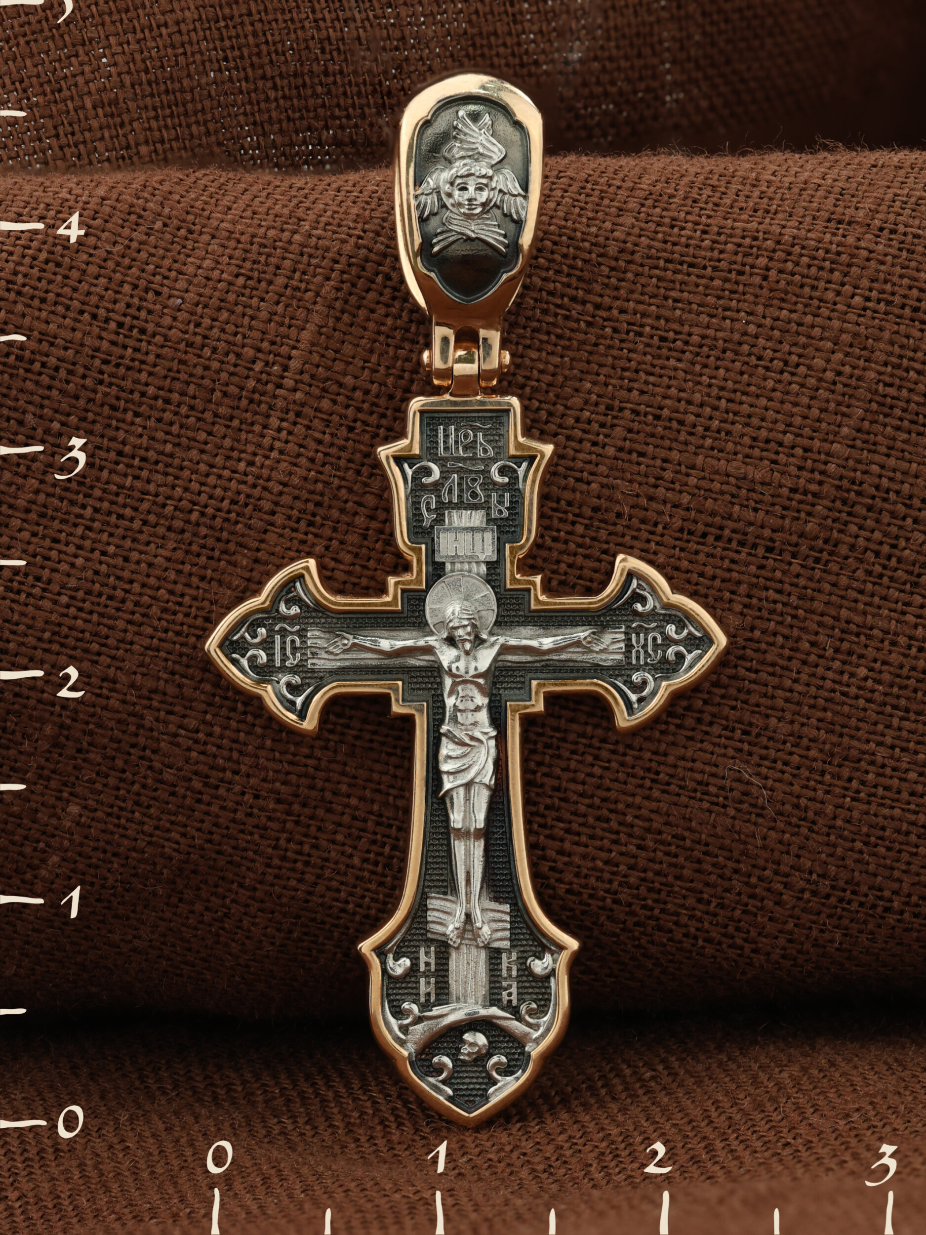 На лицевой стороне этого креста центральную часть занимает икона Распятия Христа — образ жертвы, принесенной Господом за грехи людей. Именно ко Христу, сошедшему на землю ради нашего спасения, возносятся все молитвы. Рядом с Его образом помещены слова — «НИКА» и «Царь Славы». Эти слова характеризуют Господа как Великого Архиерея, победителя смерти. Также Распятие сопровождается надписями, олицетворяющими Христа — это святое имя Христа «IC» (Иисус) «ХС» (Христос). Венчает лицевую сторону креста надпись «Царь Славы». На кулонном кольце помещено изображение Спаса Нерукотворного.