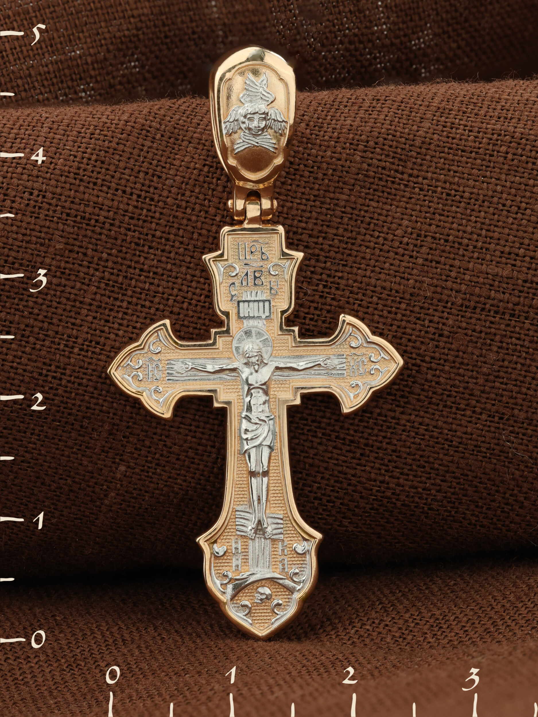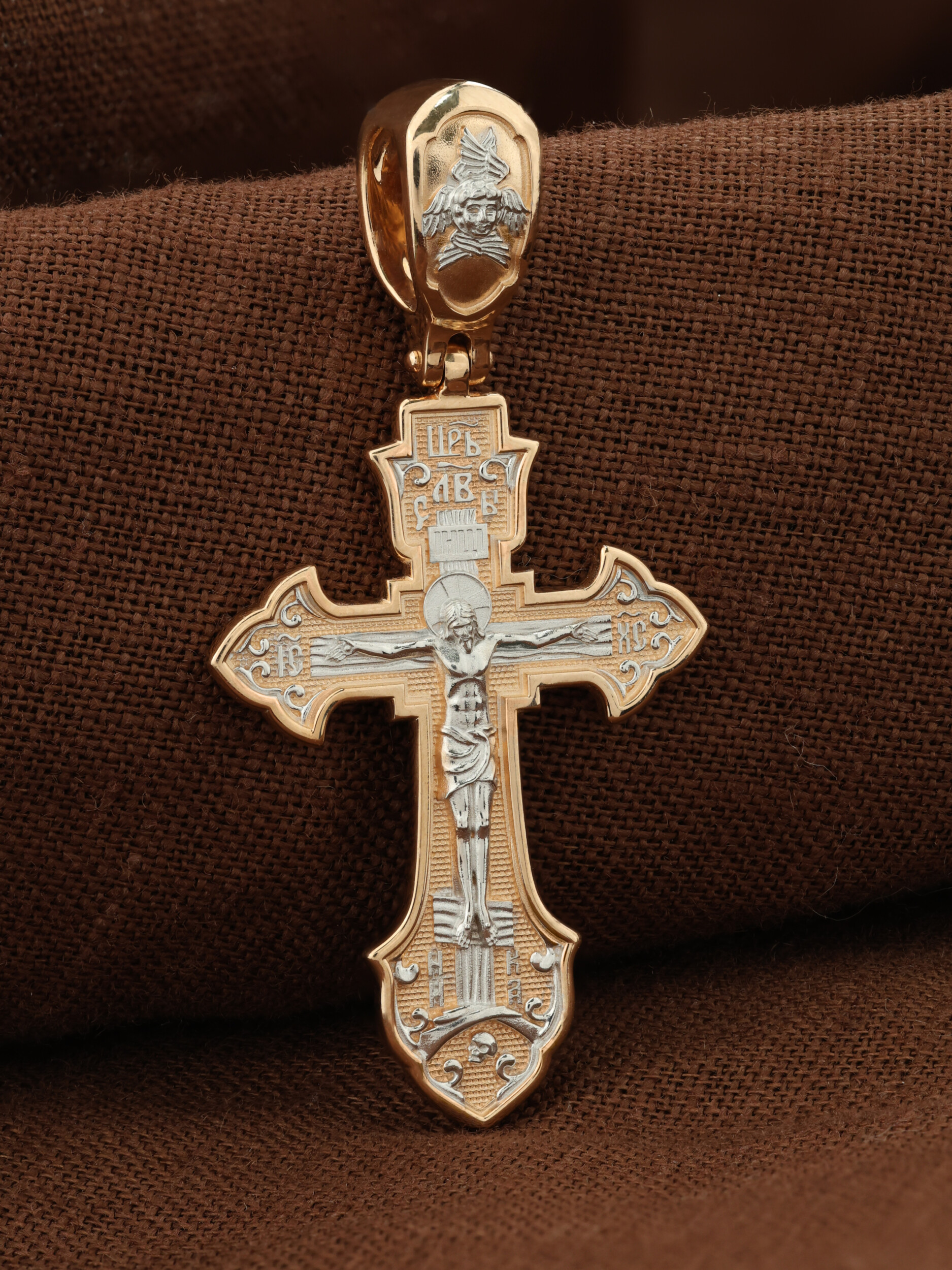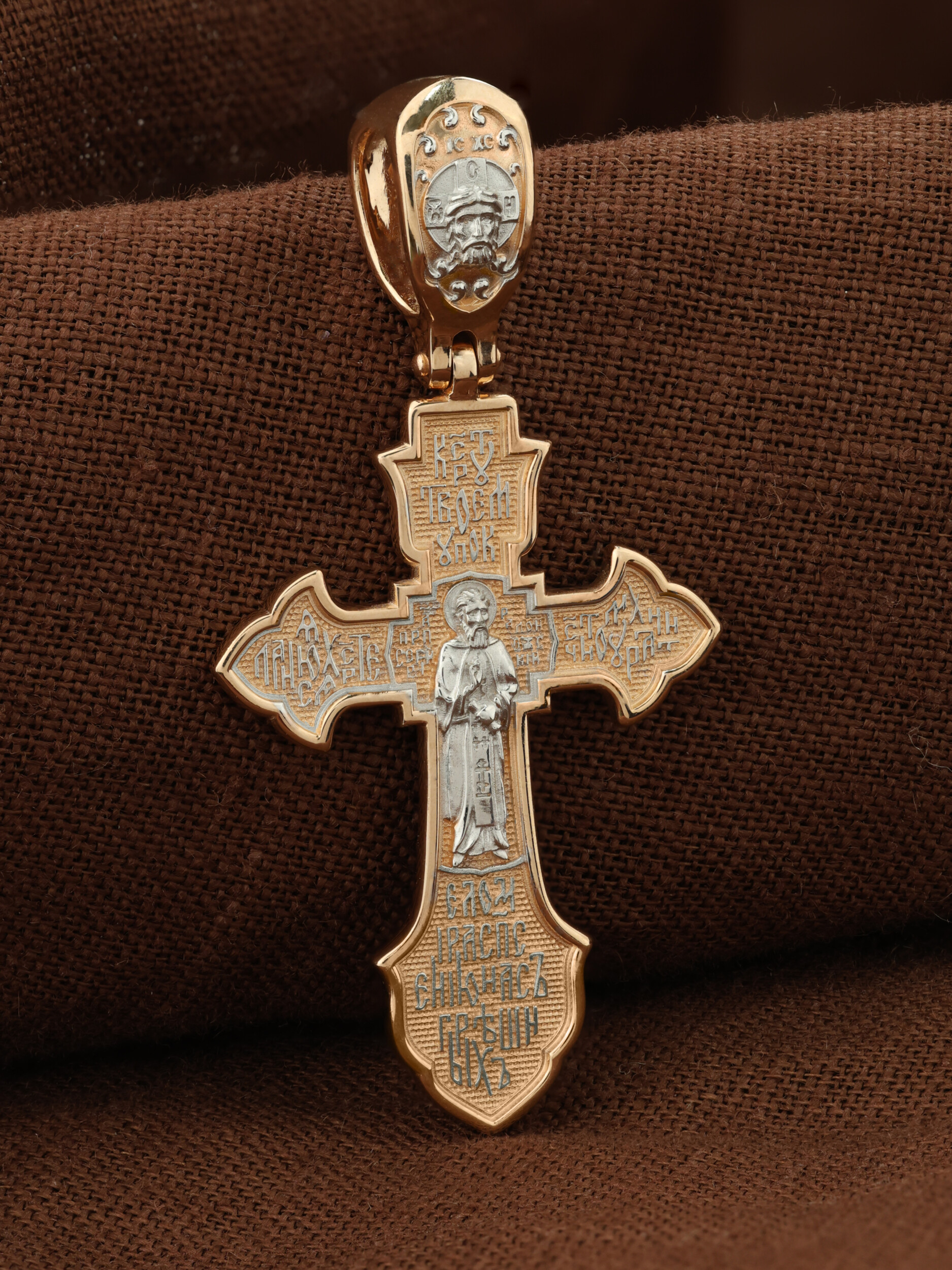 На лицевой стороне этого креста центральную часть занимает икона Распятия Христа — образ жертвы, принесенной Господом за грехи людей. Именно ко Христу, сошедшему на землю ради нашего спасения, возносятся все молитвы. Рядом с Его образом помещены слова — «НИКА» и «Царь Славы». Эти слова характеризуют Господа как Великого Архиерея, победителя смерти. Также Распятие сопровождается надписями, олицетворяющими Христа — это святое имя Христа «IC» (Иисус) «ХС» (Христос). Венчает лицевую сторону креста надпись «Царь Славы». На кулонном кольце помещено изображение Спаса Нерукотворного.