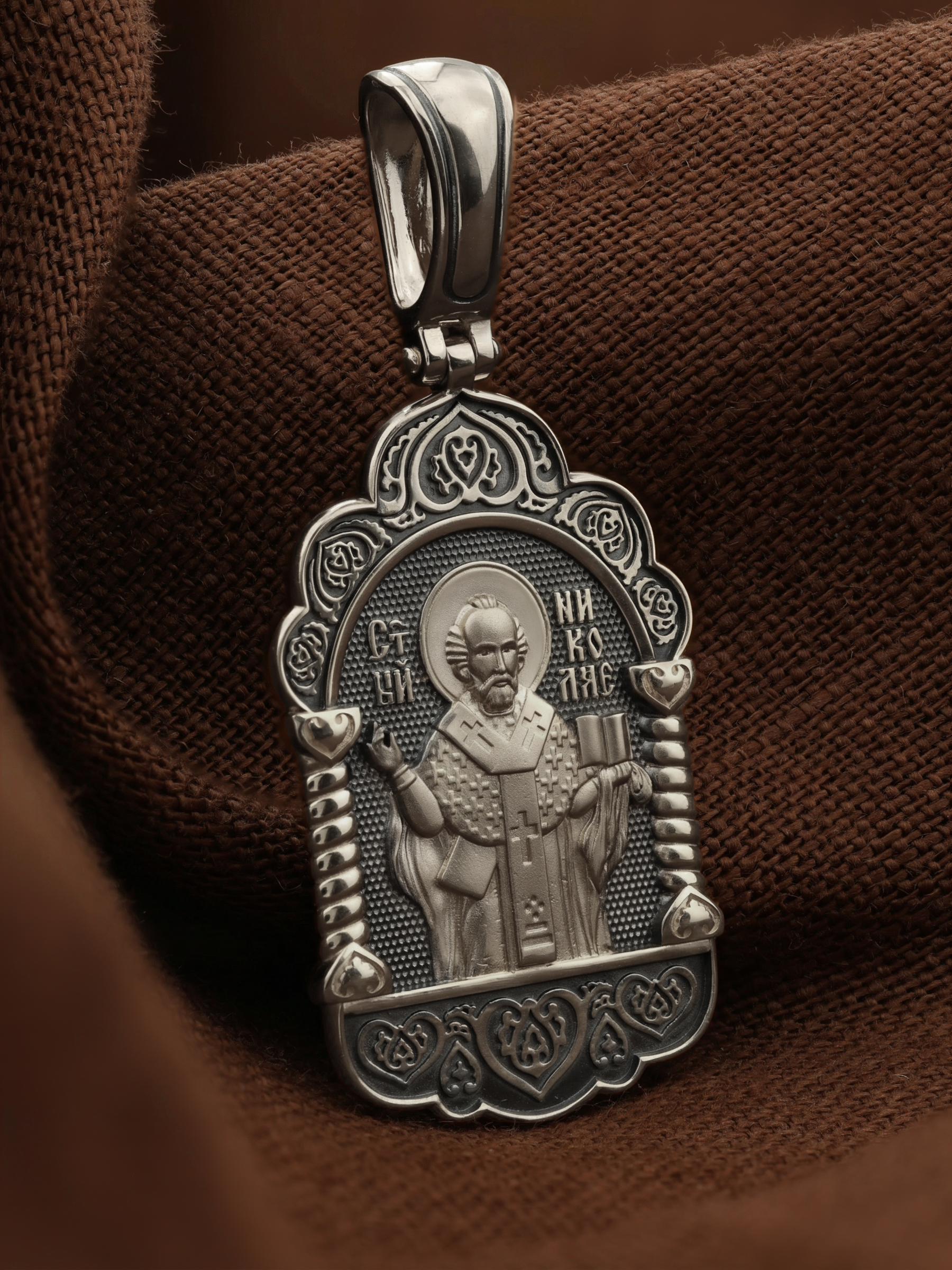 На лицевой стороне образка изображен Святитель Николай архиепископ Мир Ликийских, Чудотворец. Он является одним из самых почитаемых святых в православном мире. Святитель Николай родился во второй половине III века в Малой Азии в Ликийском городе Патары. С рождения Божий Угодник проявлял необыкновенные дарования. Сохранилось Предание, что во время крещения он, никем не поддерживаемый, простоял в купели три часа. Приняв сан священника, святитель Николай стал проводить еще более строгую подвижническую жизнь. Избранник Божий Николай стал вершиной всех добродетелей, поднятой до райской высоты. С кем из величайших праведников не сравнялся он образом духовной красоты, кому из них не последовал в своих деяниях и чудотворениях? Вся жизнь святого Николая — это служение Богу. Много великих и преславных чудес сотворил великий Святитель Николай Угодник. Он помогал сущим в бедах, укрощал штормы, спасал от потопления и выносил на сушу из глубины морской, освобождал из плена и приносил освобожденных домой, избавлял от уз и темницы, защищал от посечения мечом, освобождал от смерти и подавал многим различные исцеления, слепым прозрение, хромым хождение, глухим слух, немым дар слова.