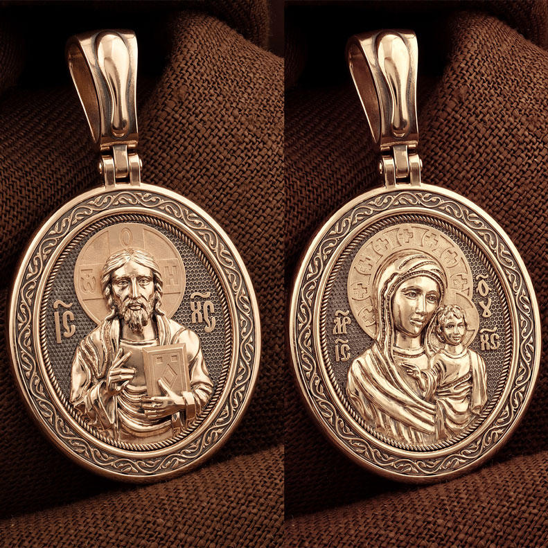 На обороте изображена Казанская икона Божией Матери — одна из самых почитаемых в России чудотворных икон Богородицы. Богословское значение Казанской иконы — указать верующим истинный Путь к спасению, который лежит через Христа. Только Божия Матерь имеет настолько сильное дерзновение к Спасителю, что может ходатайствовать перед Ним за всех верных. Именно этот образ дарится новой повенчанной паре, как хранитель очага и семейная реликвия. Молитва перед Казанской иконой Божьей Матери помогает во всех сложных случаях жизни, в болезнях, во всех печалях, невзгодах, скорбях. Уникальная история появления, чудеса, случившиеся по молитвам православных людей возле образа — все это делает Казанскую Богородицу особенной, среди тысяч других икон.
