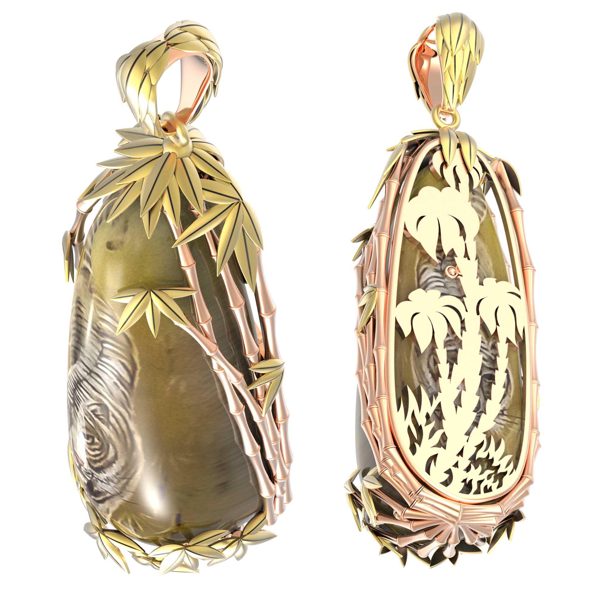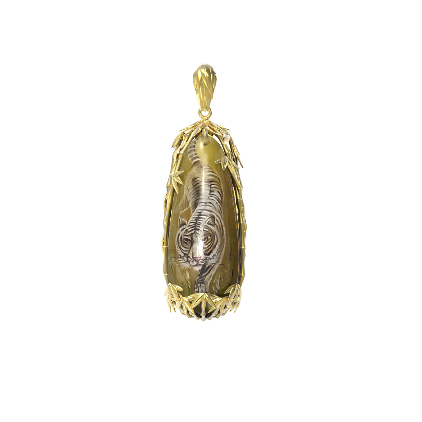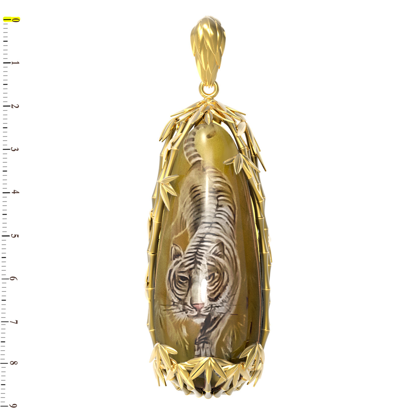 Центральным элементом украшения выступает крупная вставка из янтаря оранжевого оттенка, выполненная в форме капли. На поверхность камня нанесена тонкая художественная роспись, изображающая грациозного тигра. Детальная проработка рисунка делает подвеску похожей на миниатюрное произведение искусства. Оправа из золота бережно обрамляет янтарь, добавляя дизайну завершенности и глубины.