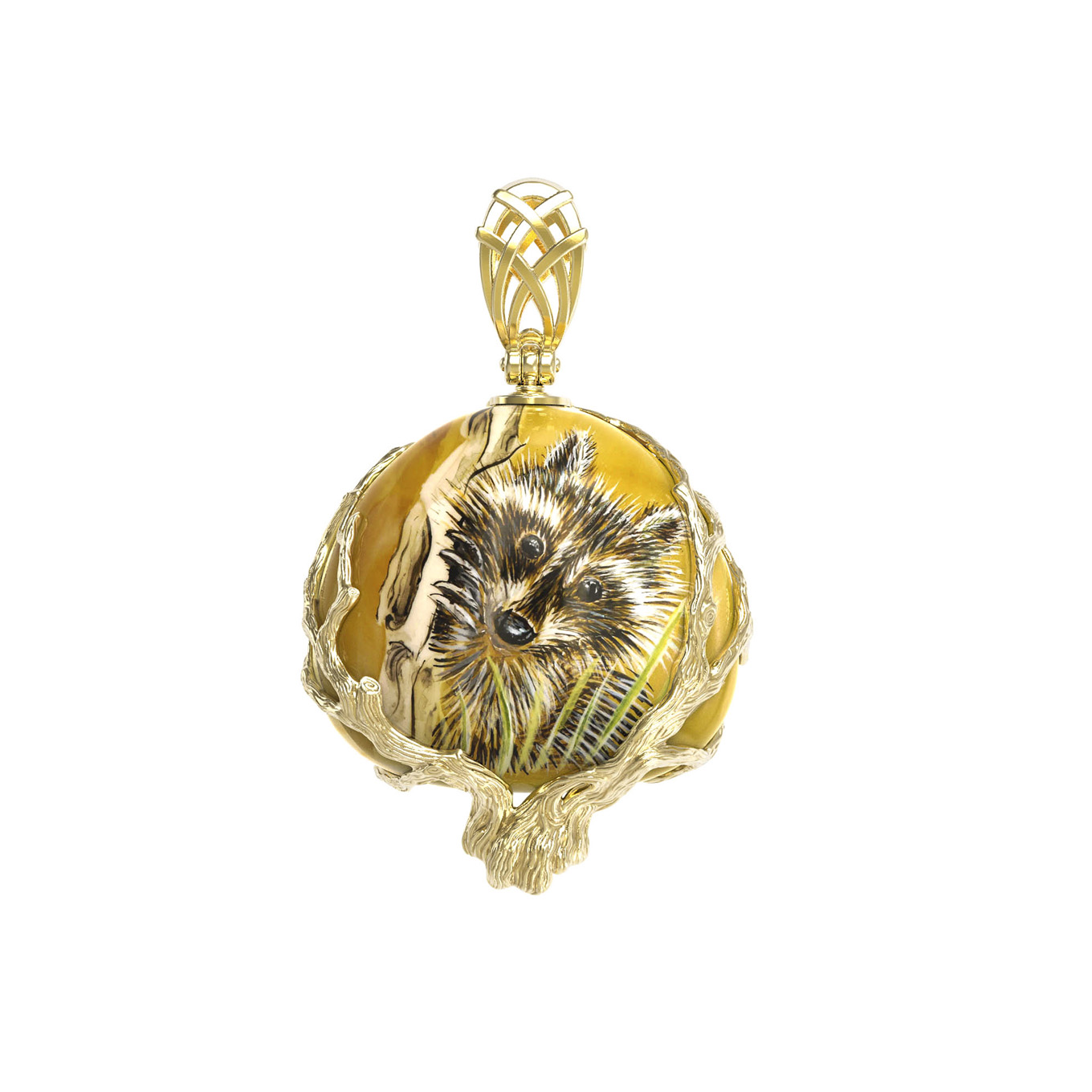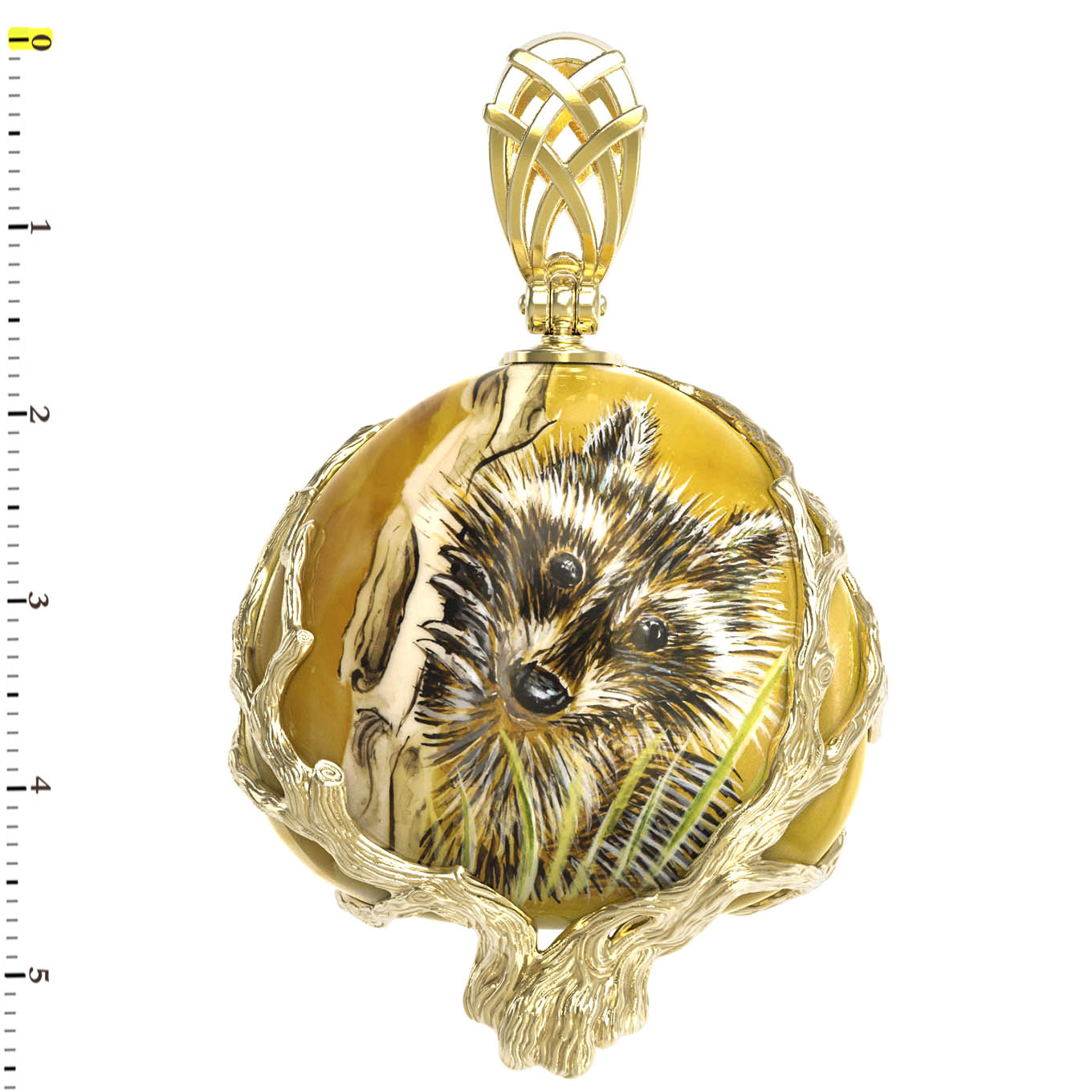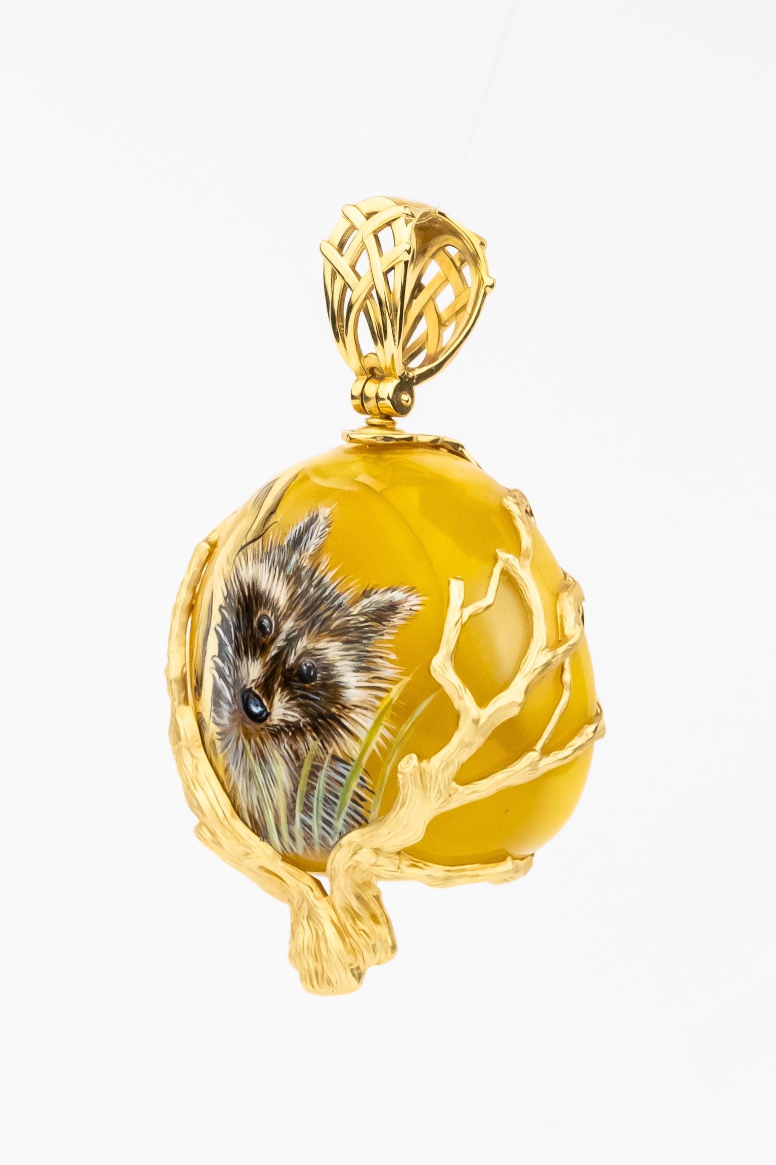 Откройте для себя очарование ювелирного искусства с этой уникальной подвеской из коллекции De luxe Premium — Роспись на янтаре. Украшение выполнено из благородного лимонного золота 585 пробы, чей мягкий, солнечный оттенок идеально подчеркивает теплоту натурального камня. Центральным элементом композиции является крупный янтарь с авторской художественной росписью, который благодаря своей форме капли притягивает взгляд своей глубиной и насыщенностью. Разноцветный рисунок на янтаре детально проработан, создавая живой и выразительный образ, обрамленный тонким золотым узором, напоминающим переплетение лесных ветвей.
