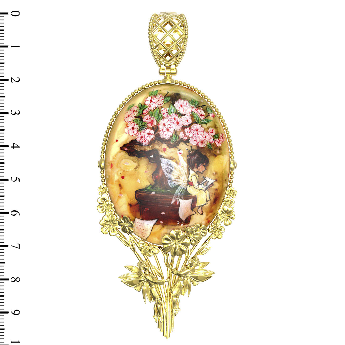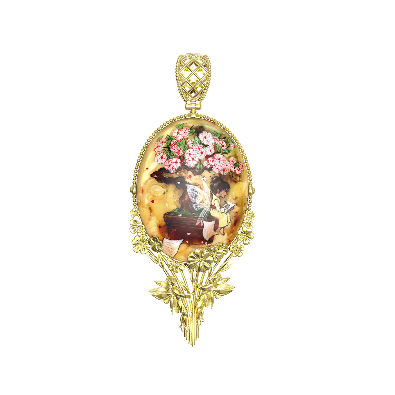 Изящная подвеска из лимонного золота 585 пробы из коллекции De luxe Premium — Роспись на янтаре станет утонченным дополнением вашего образа. Это украшение объединяет в себе мастерство ювелиров и природную теплоту натурального камня. Центральным элементом дизайна является крупный янтарь в форме капли, на поверхности которого выполнена искусная художественная роспись. Разноцветный рисунок, изображающий сказочный сюжет под цветущим деревом, делает каждое изделие по-настоящему уникальным и притягивающим взгляд.