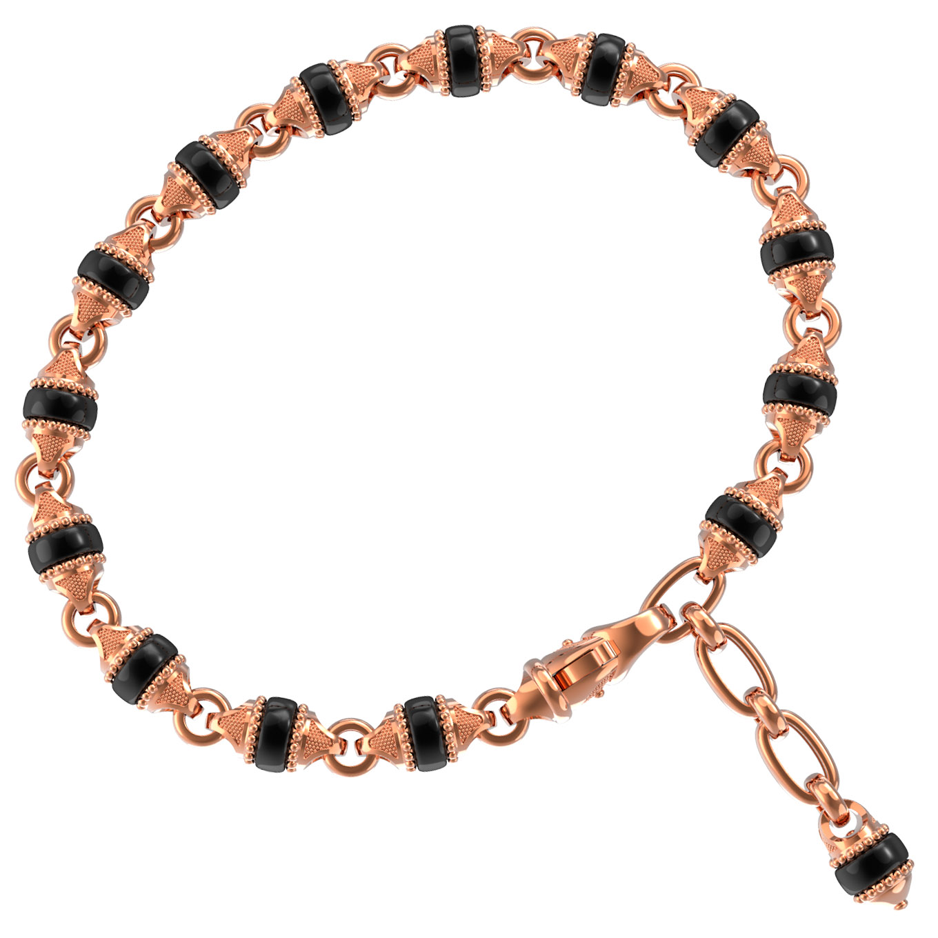 Мужской браслет из красного золота 585 пробы — воплощение стиля и уверенности для тех, кто ценит статус и индивидуальность. Это украшение из коллекции De Luxe — Браслеты De Luxe притягивает взгляды благодаря глубокому контрасту материалов. Основу композиции составляют 15 вставок из оникса, которые имеют правильную форму круга и насыщенный чёрный цвет. Глубокий, строгий оттенок камней идеально сочетается с теплым блеском металла, создавая гармоничный и завершенный образ.