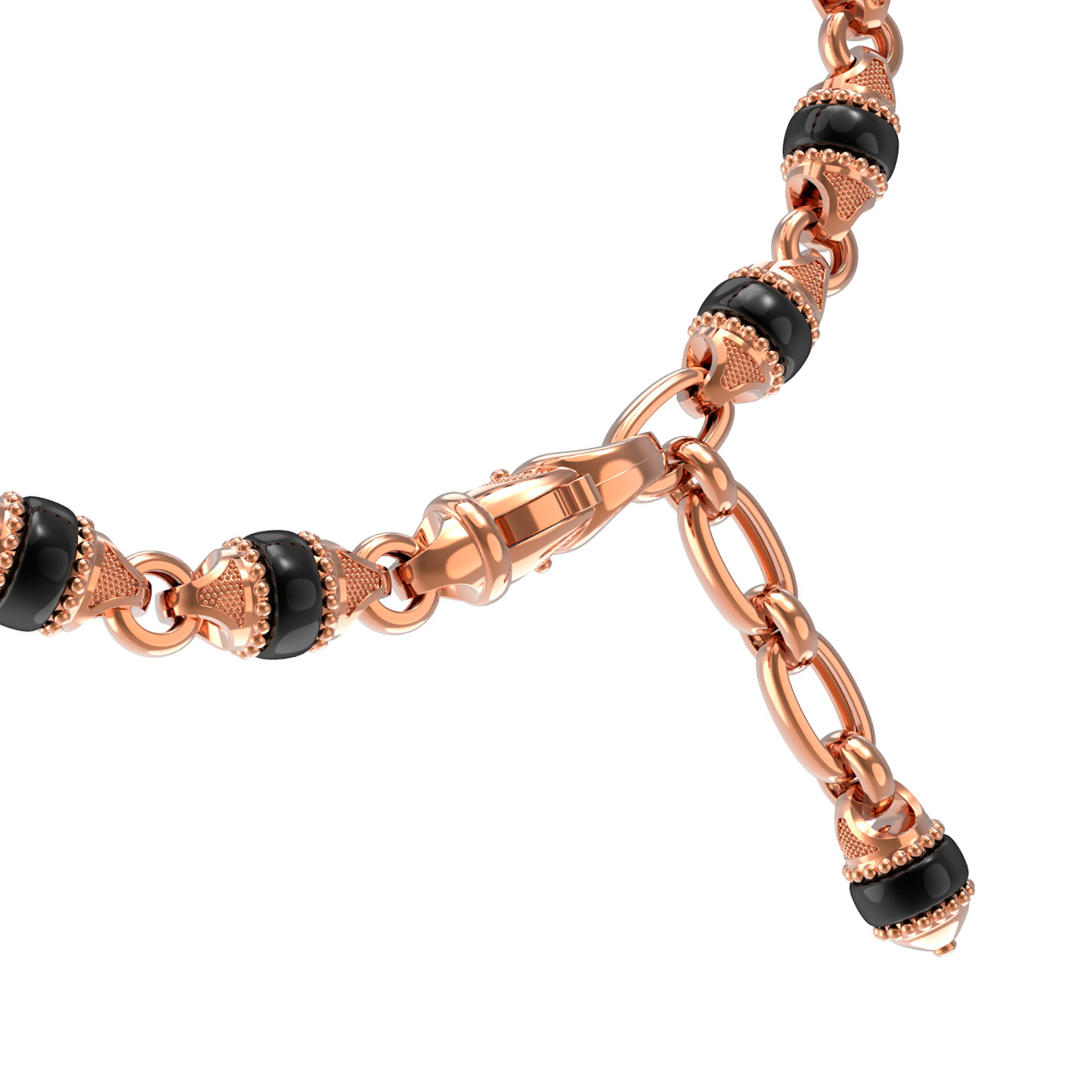 Дизайн изделия отличается проработкой каждой детали. Сложная фактура звеньев, чередующихся с круглыми ониксами, придает украшению объем и выразительность. Такой браслет из золота с ониксом подчеркнет сильный характер владельца и станет ключевым акцентом как в деловом, так и в повседневном гардеробе. Благодаря продуманному исполнению, это изделие отлично смотрится как самостоятельный аксессуар, так и в сочетании с другими украшениями.