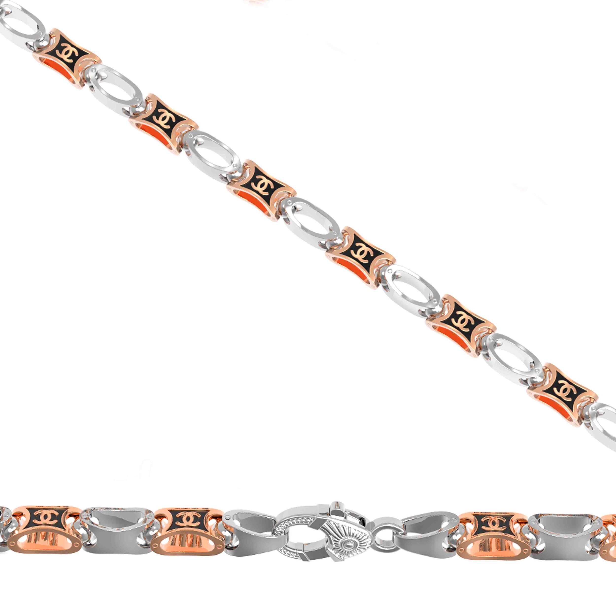 Элегантный мужской браслет из красного золота 585 пробы — воплощение статуса и уверенного стиля. Ювелирное изделие из коллекции De Luxe — Браслеты De Luxe притягивает взгляд оригинальным сочетанием материалов и контрастных оттенков. Звенья сложной геометрической формы, выполненные из благородного красного золота, гармонично переплетаются с деталями белого цвета, создавая динамичный и современный дизайн, который подчеркнет индивидуальность владельца.