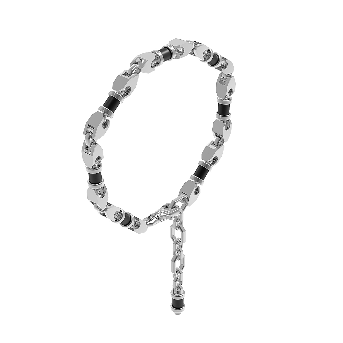Дизайн украшения построен на гармоничном сочетании геометрии и премиальных материалов. Браслет декорирован 8 вставками из оникса, имеющими форму цилиндра. Эти темные акценты придают аксессуару солидность и выразительность, подчеркивая статус своего владельца. Особая фактура звеньев и точность линий делают это изделие самодостаточным украшением, которое будет уместно смотреться как с деловым костюмом, так и в более свободном образе.