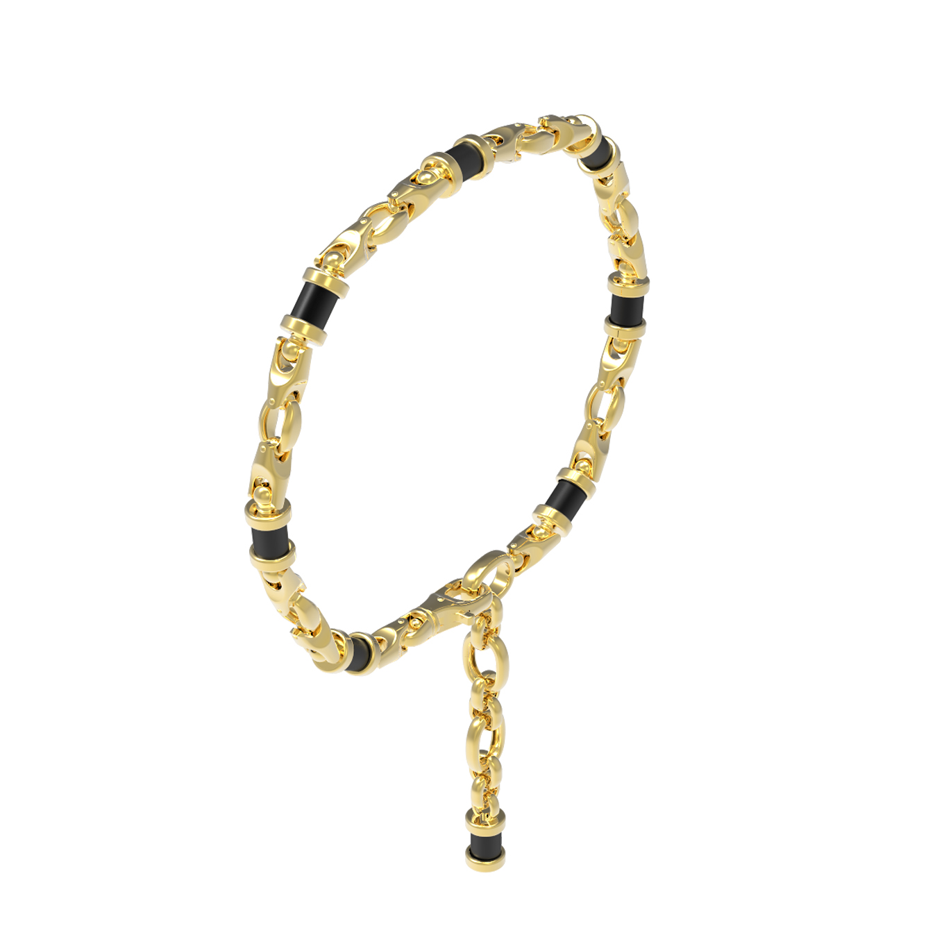 Особую эстетику браслету придают 8 вставок из оникса, выполненных в форме цилиндра. Глубокий черный цвет камня гармонично переплетается с сиянием золотых звеньев, создавая строгий и мужественный силуэт. Качественное исполнение и продуманная геометрия звеньев обеспечивают комфортную посадку на запястье, подчеркивая характер своего обладателя. Данная модель отличается универсальностью и может быть дополнена другими украшениями, так как изделие входит в серию, позволяющую формировать элегантные комплекты.