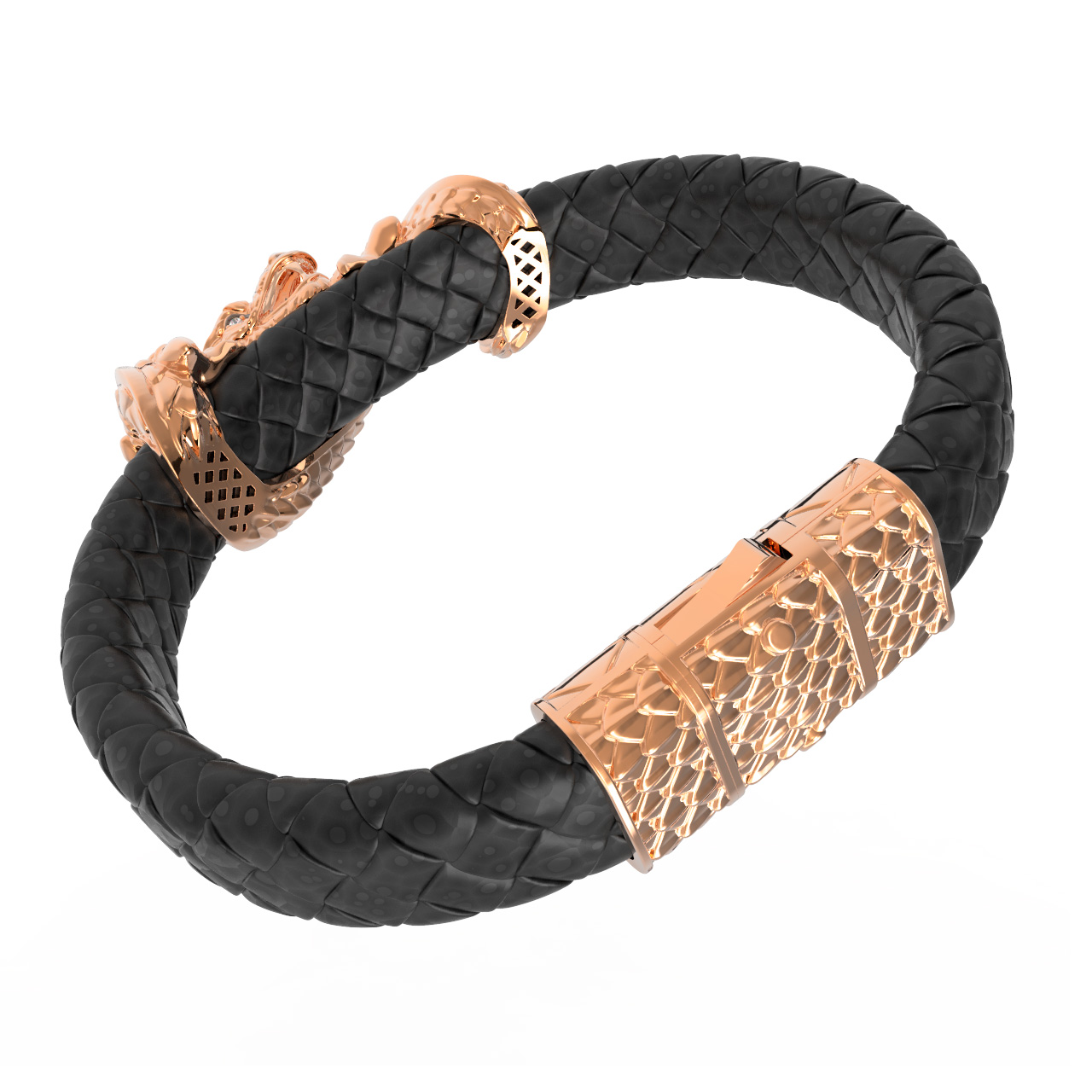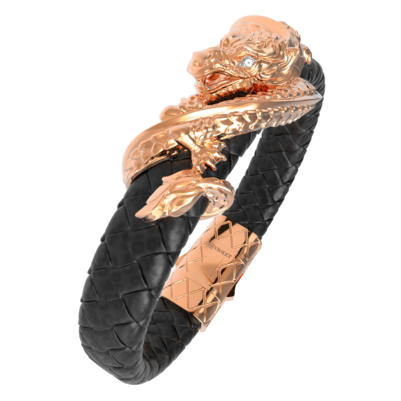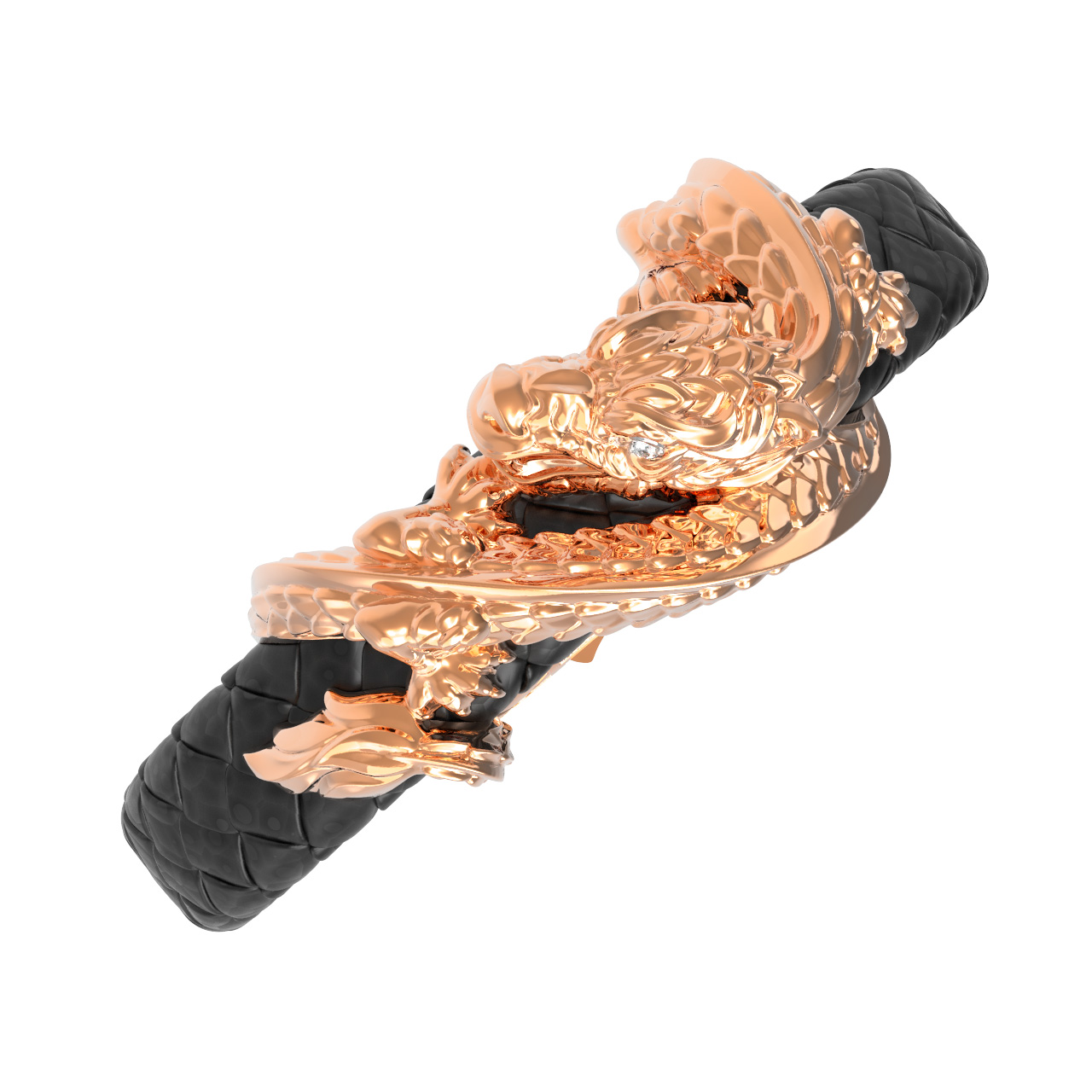 Стильный и дерзкий браслет из коллекции De Luxe — Браслеты De Luxe станет безупречным акцентом вашего образа. Это ювелирное изделие гармонично объединяет благородство драгоценных металлов и фактурность натуральных материалов. Центральным элементом украшения выступает изящный декоративный элемент из красного золота 585 пробы, выполненный в форме дракона, чья детализация подчеркивает статус владельца. В качестве акцентов использованы 22 вставки: сияющие бриллианты круглой и овальной формы создают тонкую игру света на фоне глубокого черного цвета вставок и классического красного золота.