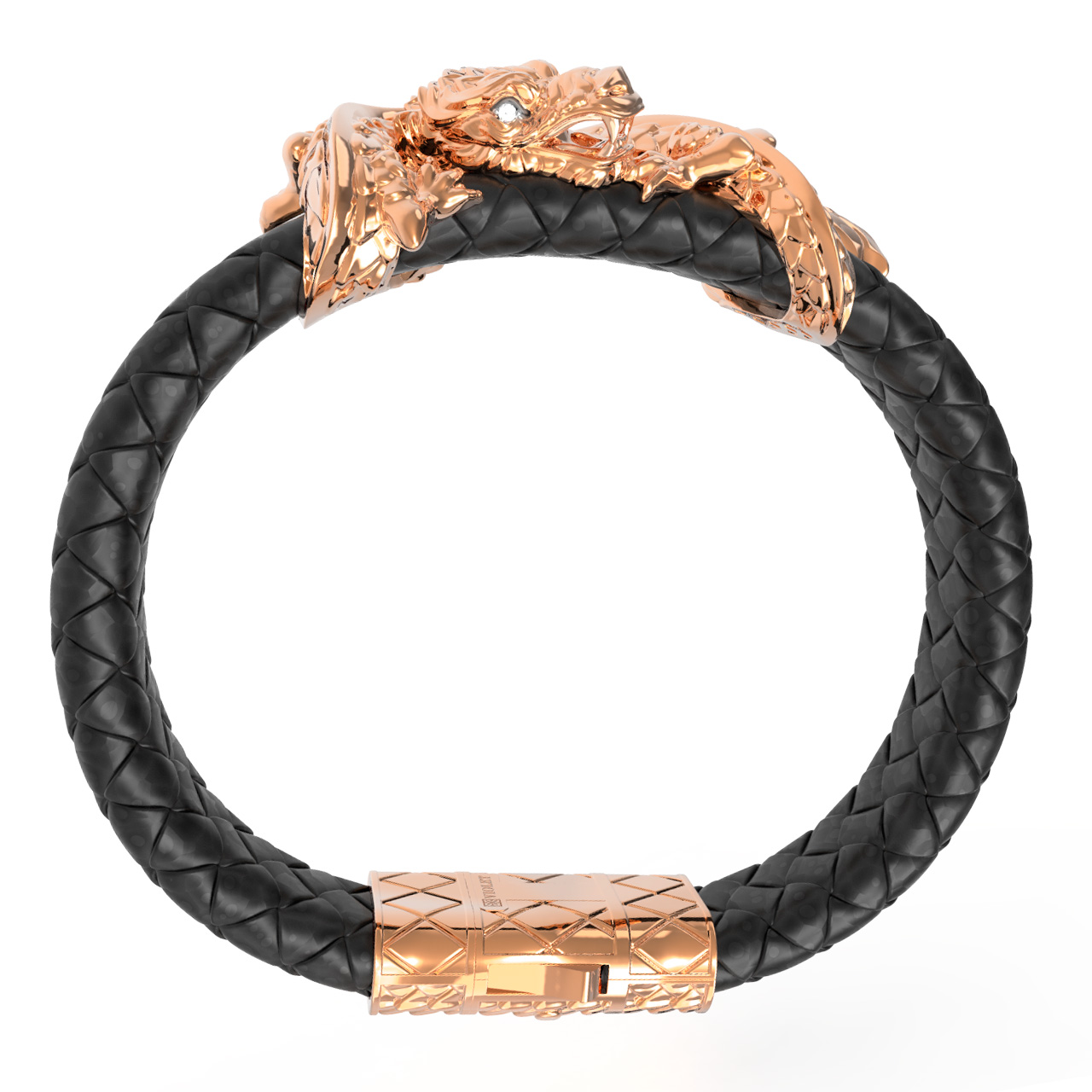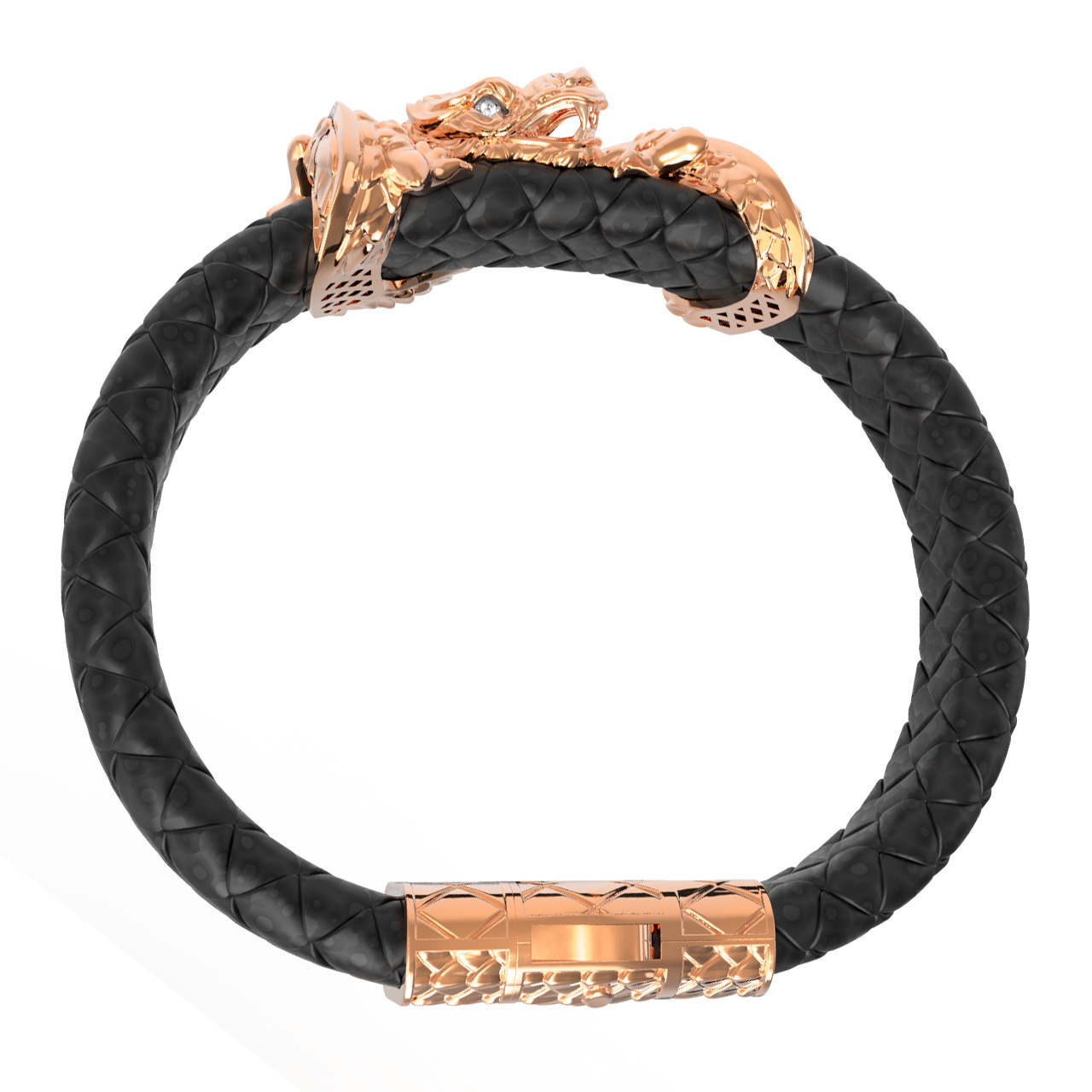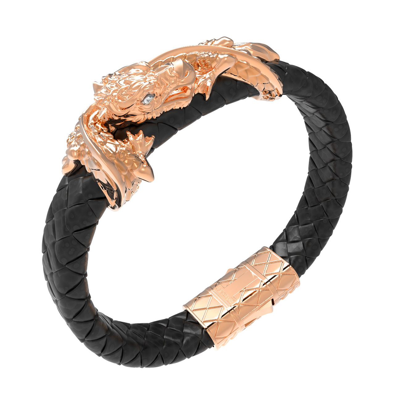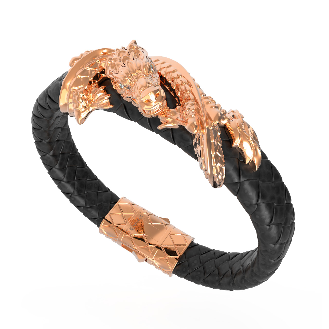 Стильный и дерзкий браслет из коллекции De Luxe — Браслеты De Luxe станет безупречным акцентом вашего образа. Это ювелирное изделие гармонично объединяет благородство драгоценных металлов и фактурность натуральных материалов. Центральным элементом украшения выступает изящный декоративный элемент из красного золота 585 пробы, выполненный в форме дракона, чья детализация подчеркивает статус владельца. В качестве акцентов использованы 22 вставки: сияющие бриллианты круглой и овальной формы создают тонкую игру света на фоне глубокого черного цвета вставок и классического красного золота.