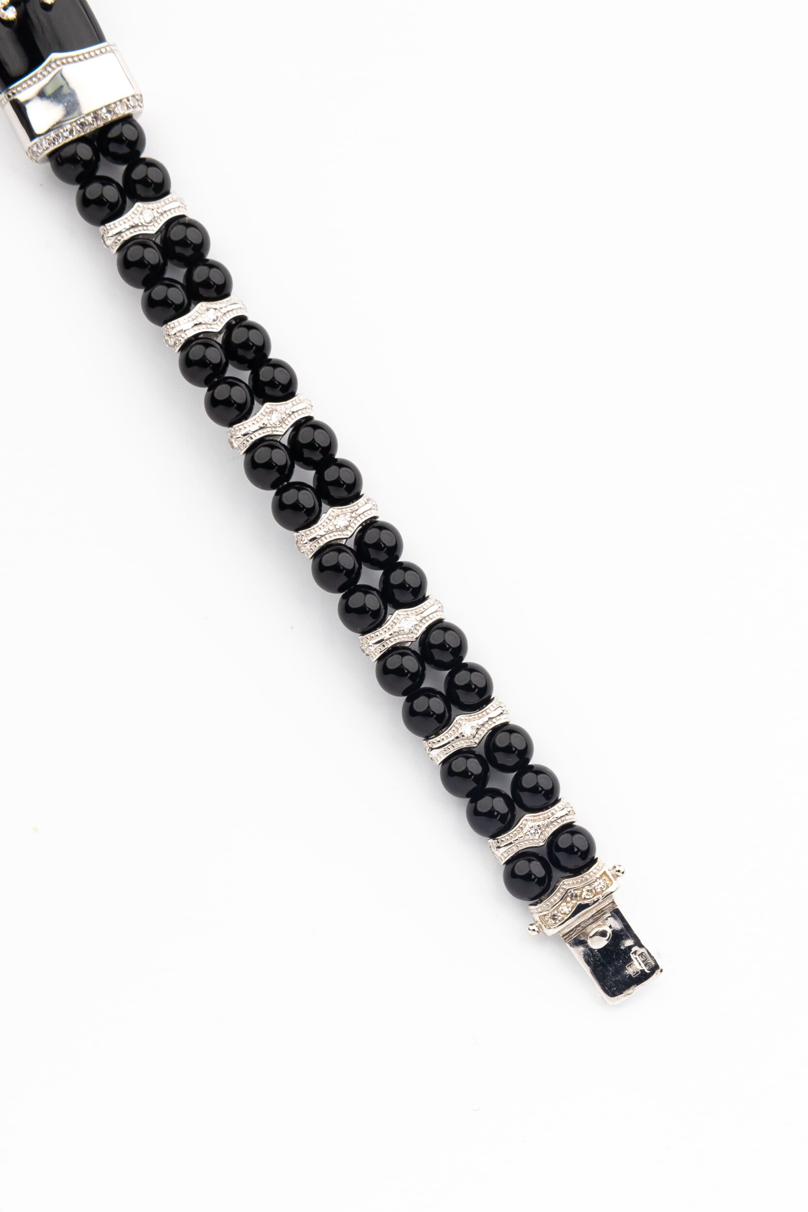 Центральным элементом композиции выступает глубокий черный оникс в форме изящных бусин, которые создают завораживающий визуальный ритм. Особое очарование браслету придает сочетание оникса с сиянием белого золота и россыпью 438 бриллиантов, инкрустированных в изделие. Круглая огранка камней обеспечивает непревзойденную игру света, превращая украшение в настоящий шедевр ювелирного мастерства.
