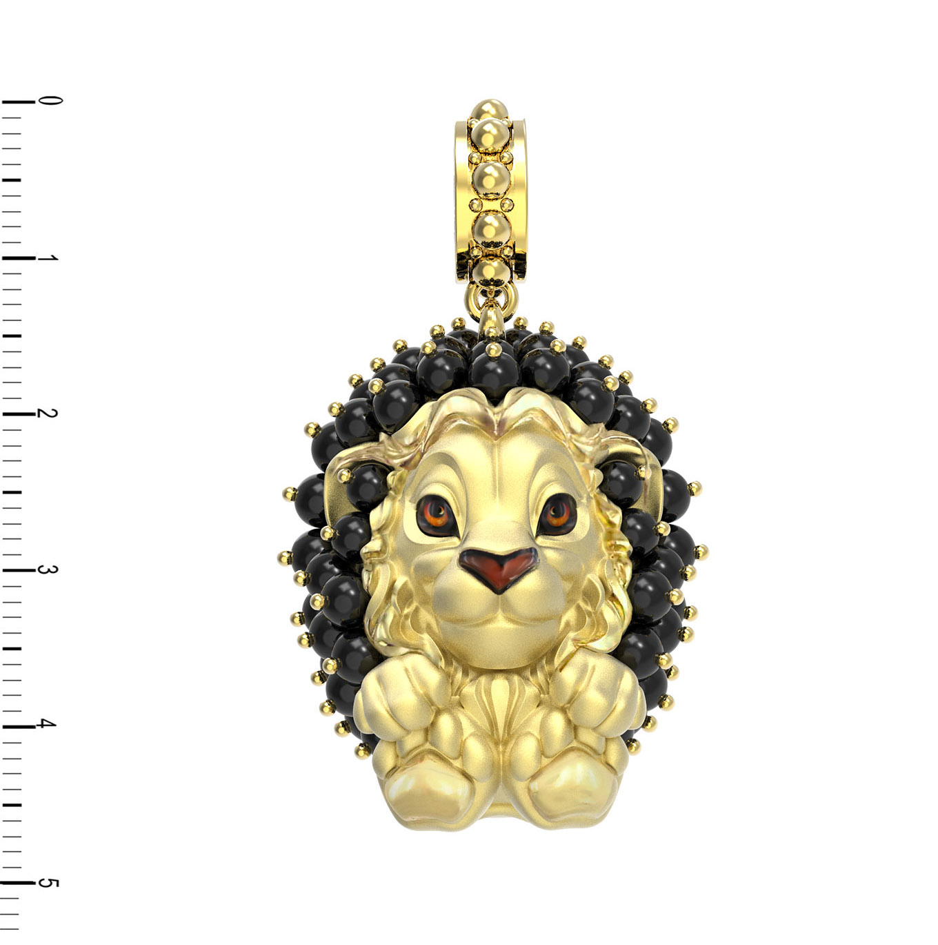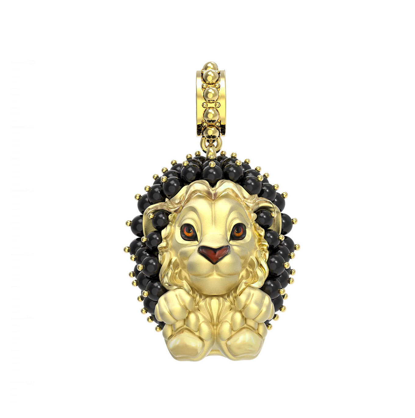 Центральный элемент дизайна — выразительная фигура льва, детально проработанная мастерами. Особую выразительность мордочке придает искусное использование эмали, расставляющей тонкие акценты. Грива льва выполнена в виде композиции из 48 вставок оникса, имеющих форму безупречных бусин. Глубокий черный цвет камней гармонично дополняет разноцветные элементы эмали, создавая целостный и запоминающийся образ.