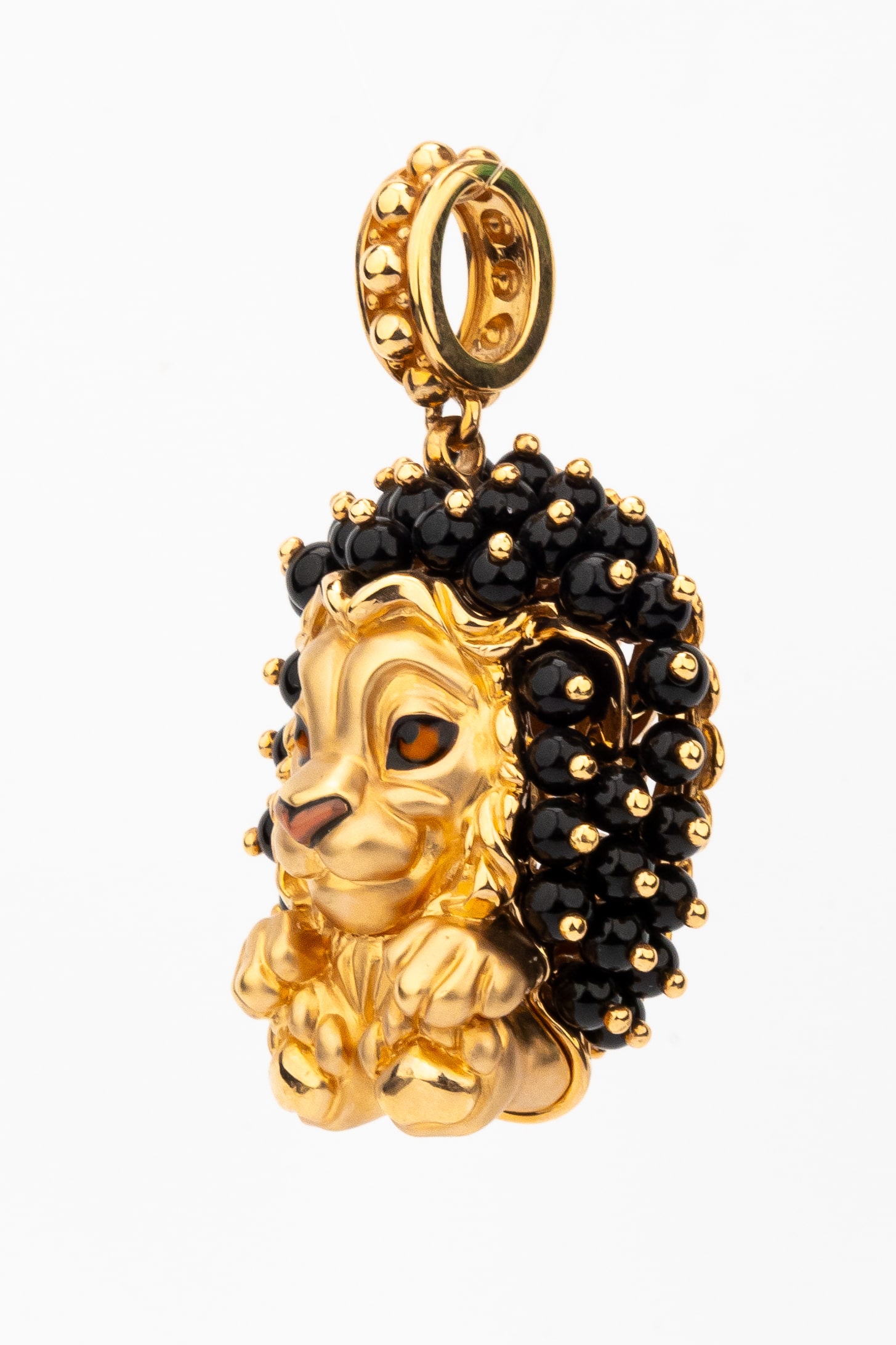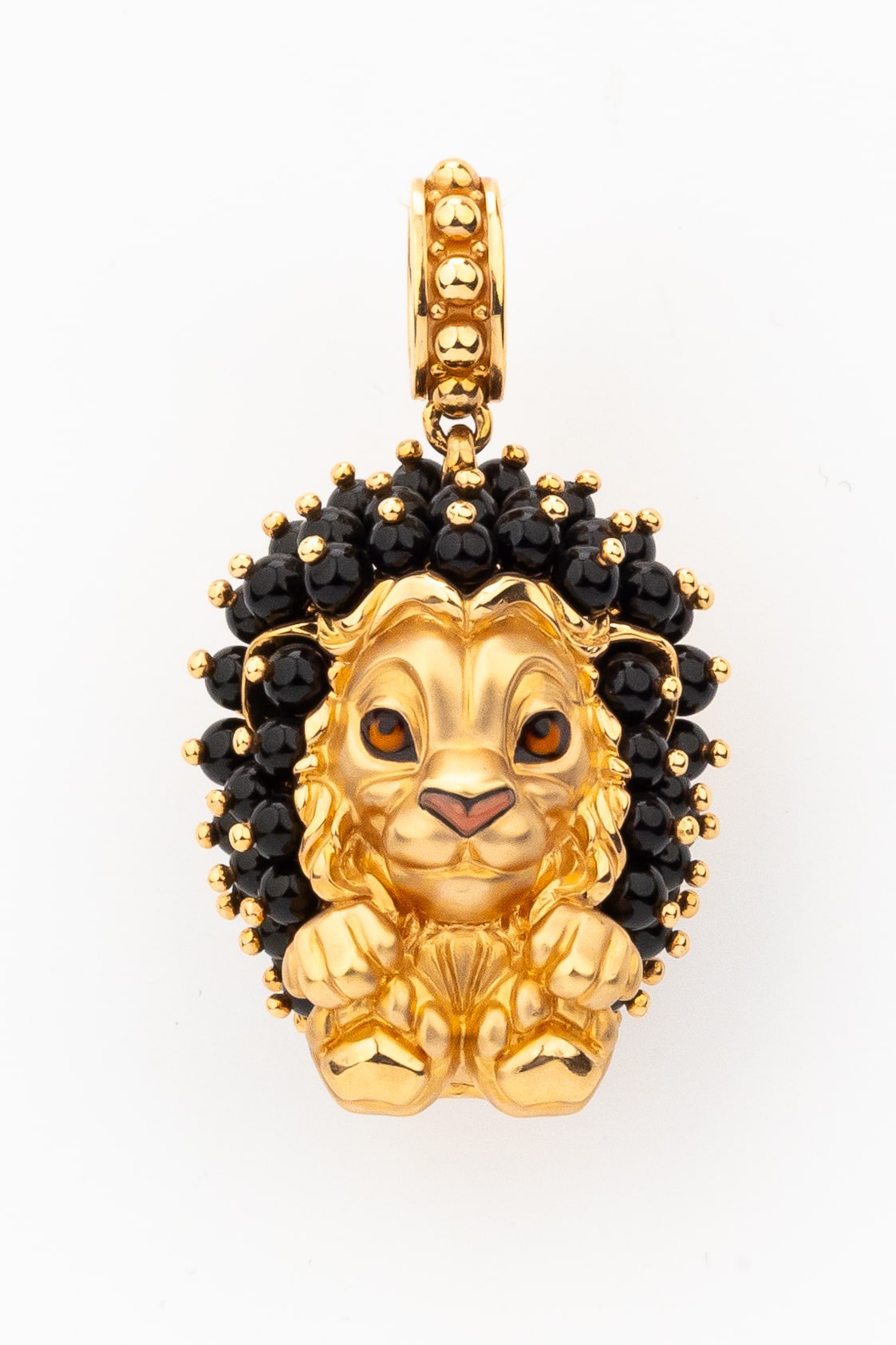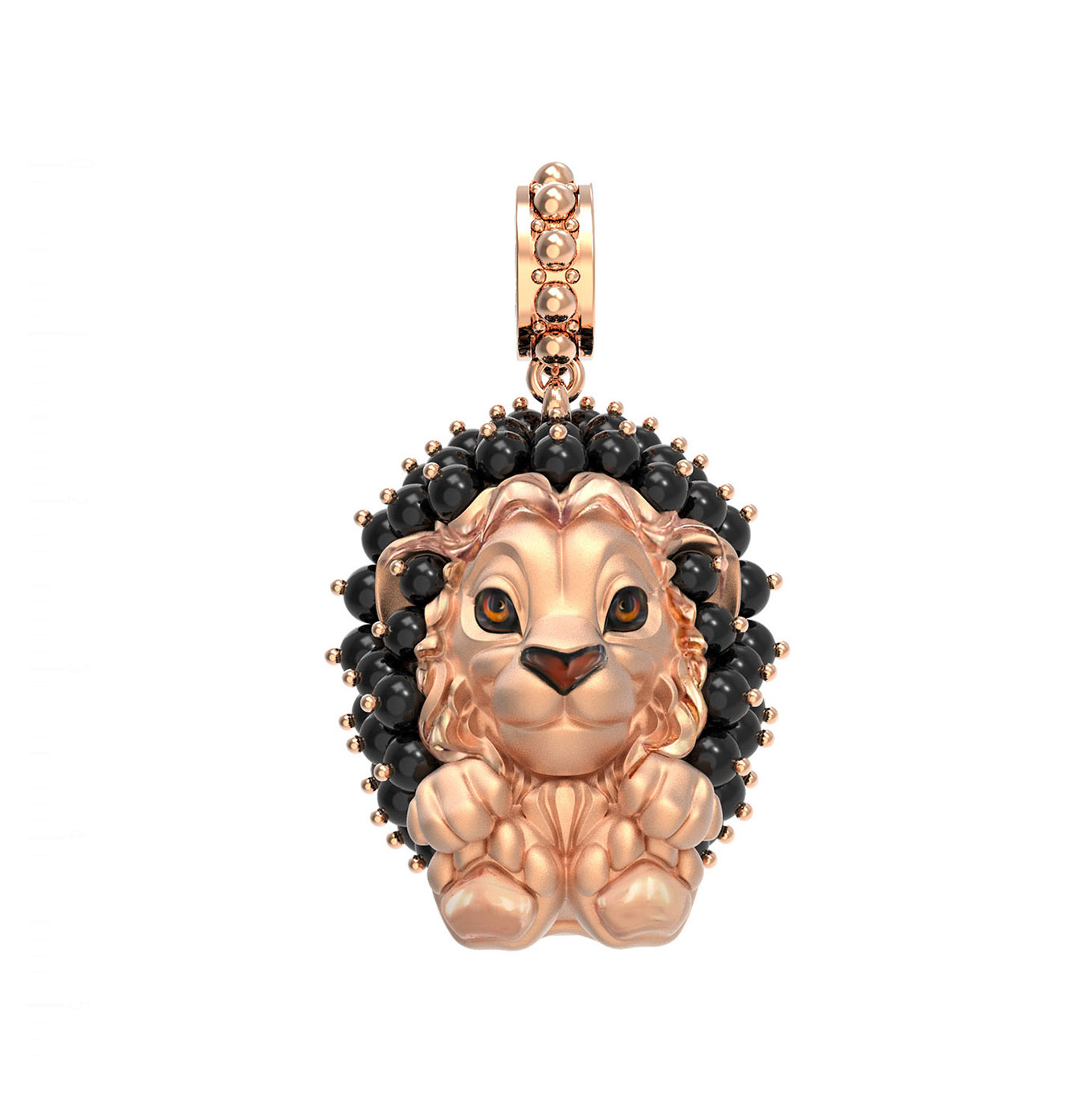 Эффектная подвеска из красного золота 585 пробы станет ярким акцентом в вашем образе. Дизайн изделия выполнен в виде грациозного льва — символа мужества и благородства. Это украшение из коллекции De luxe Premium — Львята демонстрирует мастерское сочетание драгоценного металла и ювелирных вставок. Грива льва инкрустирована 48 вставками оникса, которые имеют форму бусины и отличаются глубоким чёрным цветом. Выразительные детали образа подчеркнуты разноцветной эмалью, придающей подвеске объем и живость.