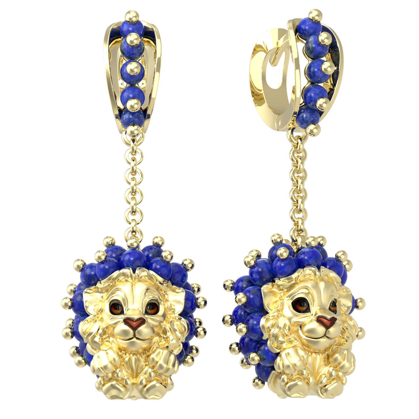 В дизайне модели использовано 118 вставок из натурального лазурита, имеющих форму аккуратной бусины. Глубокий синий оттенок камня великолепно подчеркивает выразительность золотых львов, а яркие элементы цветной эмали придают образу особую завершенность и живость. Сложная техника исполнения делает серьги настоящим произведением искусства, которое подчеркнет индивидуальность владельца.