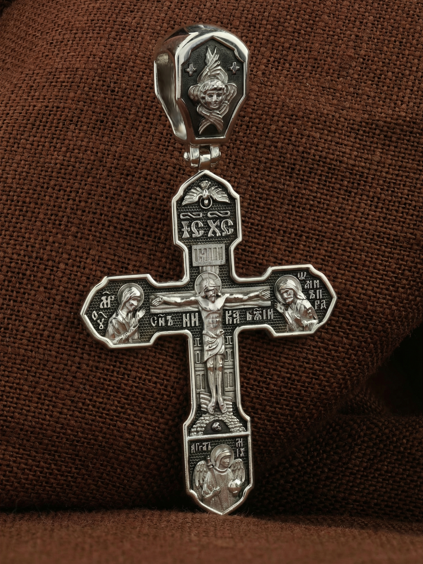 На лицевой стороне изображено Распятие Господа Иисуса Христа, над вершиной которого помещены титлы Его святого имени — «ИС ХС». Под основной перекладиной надписи — «НИКА», что в переводе с греческого означает «победитель», и словосочетание «СЫН БОЖИЙ», что означает божественную природу Иисуса Христа. С двух сторон Христу предстоят Пресвятая Богородица и св. Андрей Первозванный. Внизу — образ Архангела Михаила, могучего защитника от злых сил. Это он низверг дьявола и встал во главе ангелов для борьбы с бесовскими силами. Его имя означает «Кто яко Бог?».