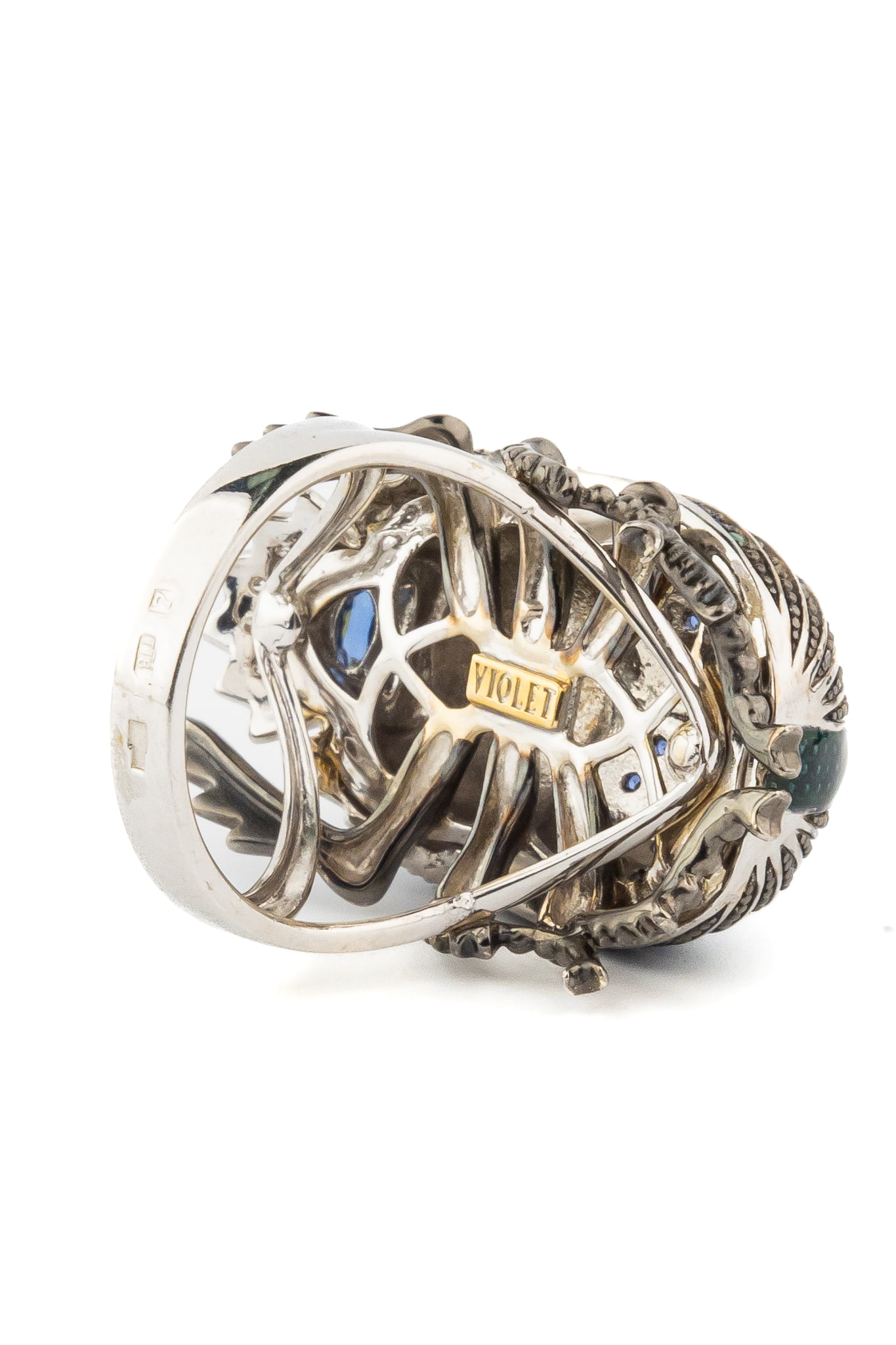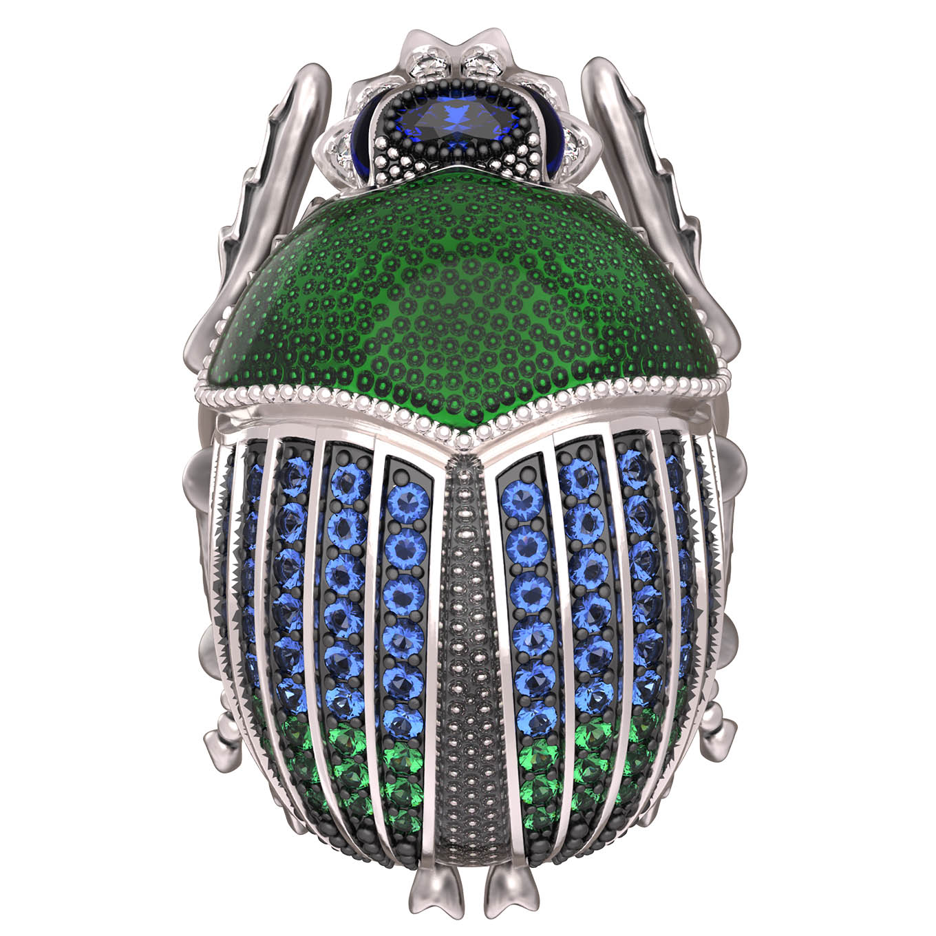 Художественное оформление включает в себя детальную проработку каждой линии. Вставка из ярко-зеленой эмали покрывает панцирь, создавая эффект натурального окраса, в то время как 109 камней, среди которых синие сапфиры и прозрачные фианиты, добавляют изделию роскошное сияние. Форма вставок круг и овал гармонично сочетаются в композиции, подчеркивая мастерство исполнения. Цветовая гамма вставок представлена глубоким синим и насыщенным зеленым оттенками.