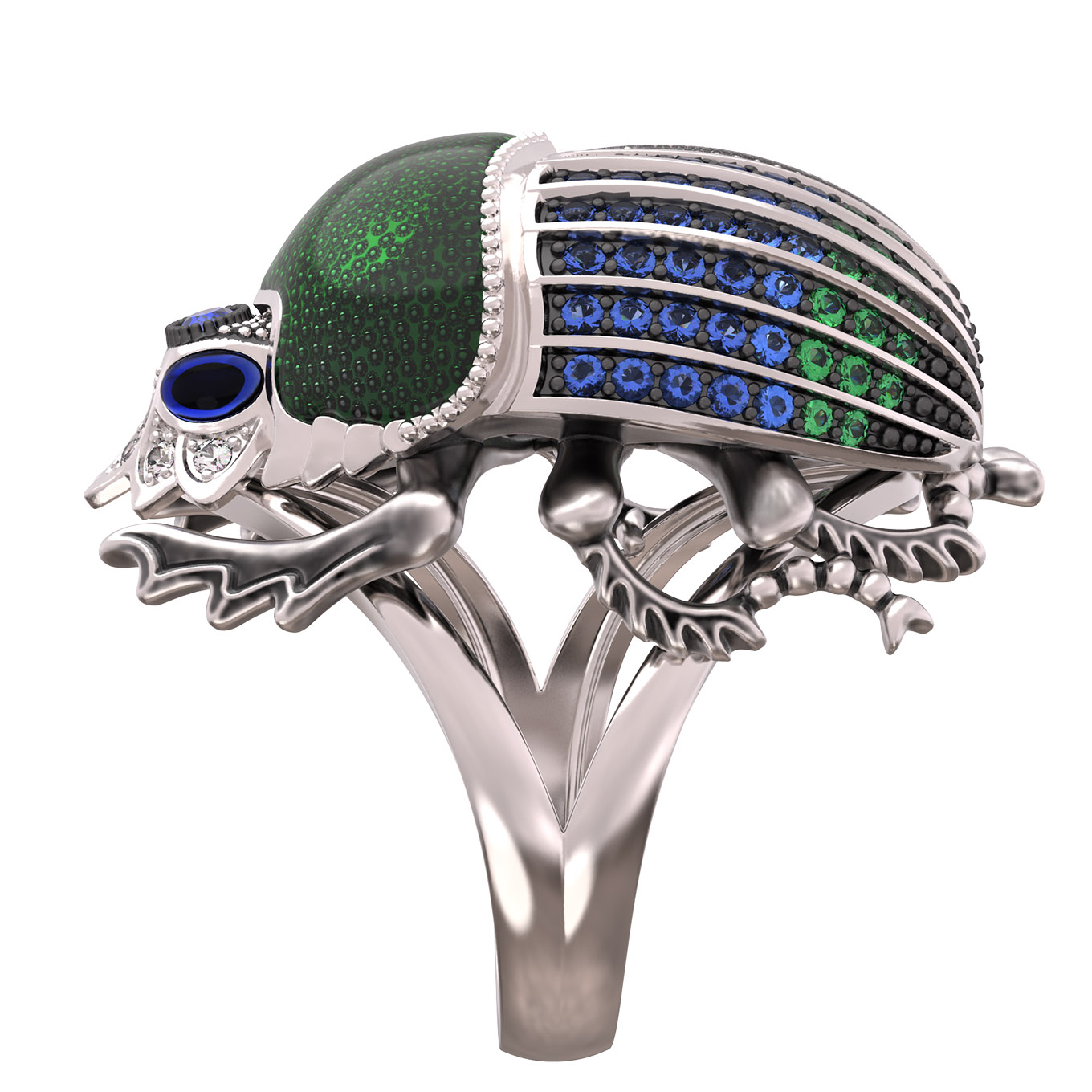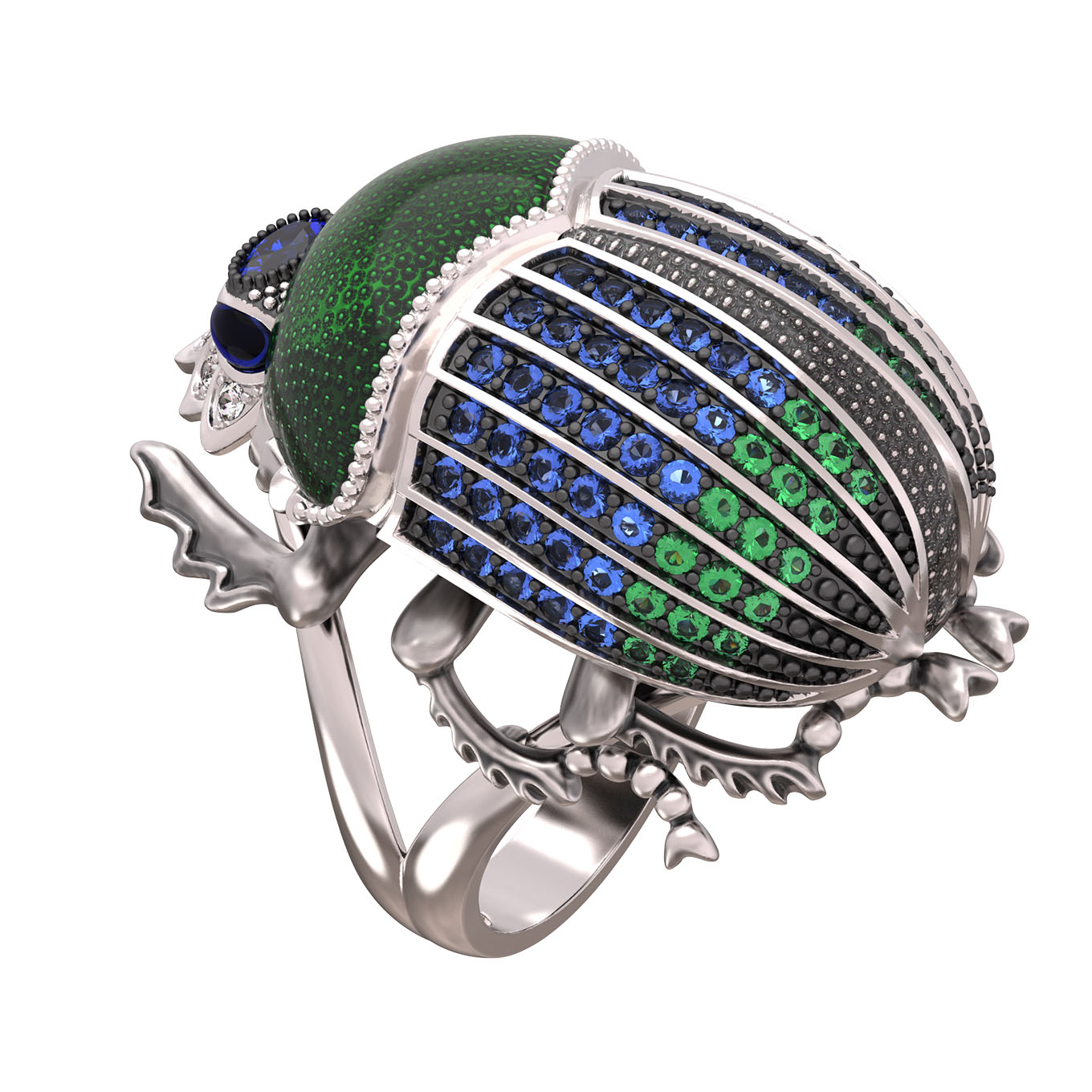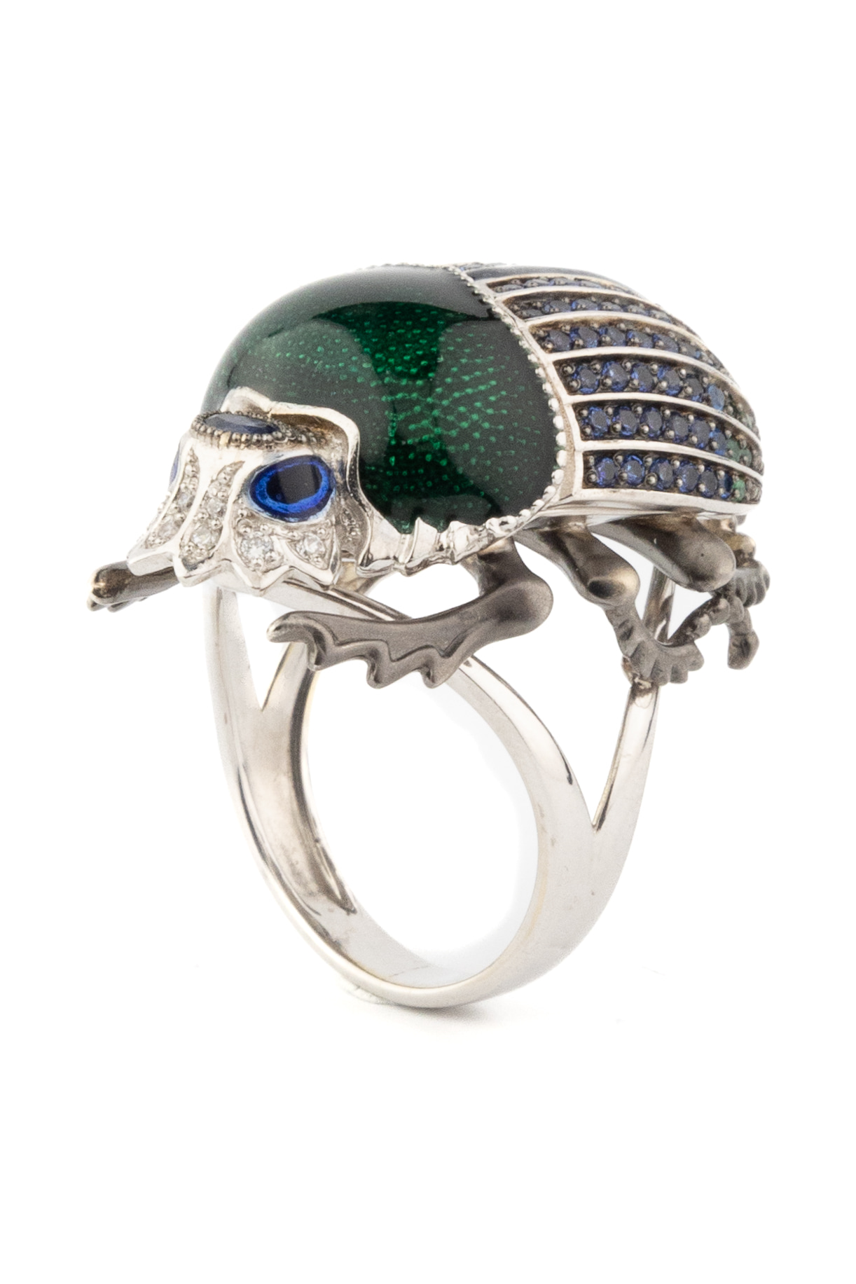 Кольцо в виде скарабея из коллекции De Luxe — Скарабеи станет ярким акцентом вашего образа и символом утонченного стиля. Дизайн изделия выполнен в тематике насекомые, что придает украшению оригинальность и статусность. Кольцо изготовлено из белого золота 585 пробы, что обеспечивает долговечность и благородный холодный блеск материала.