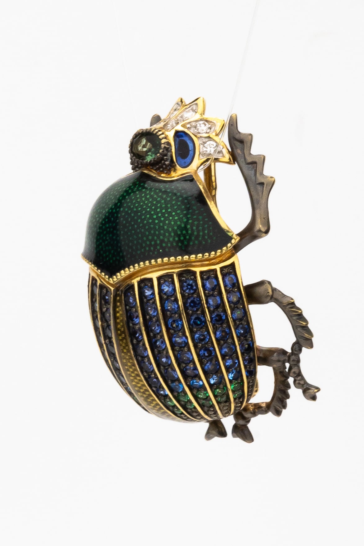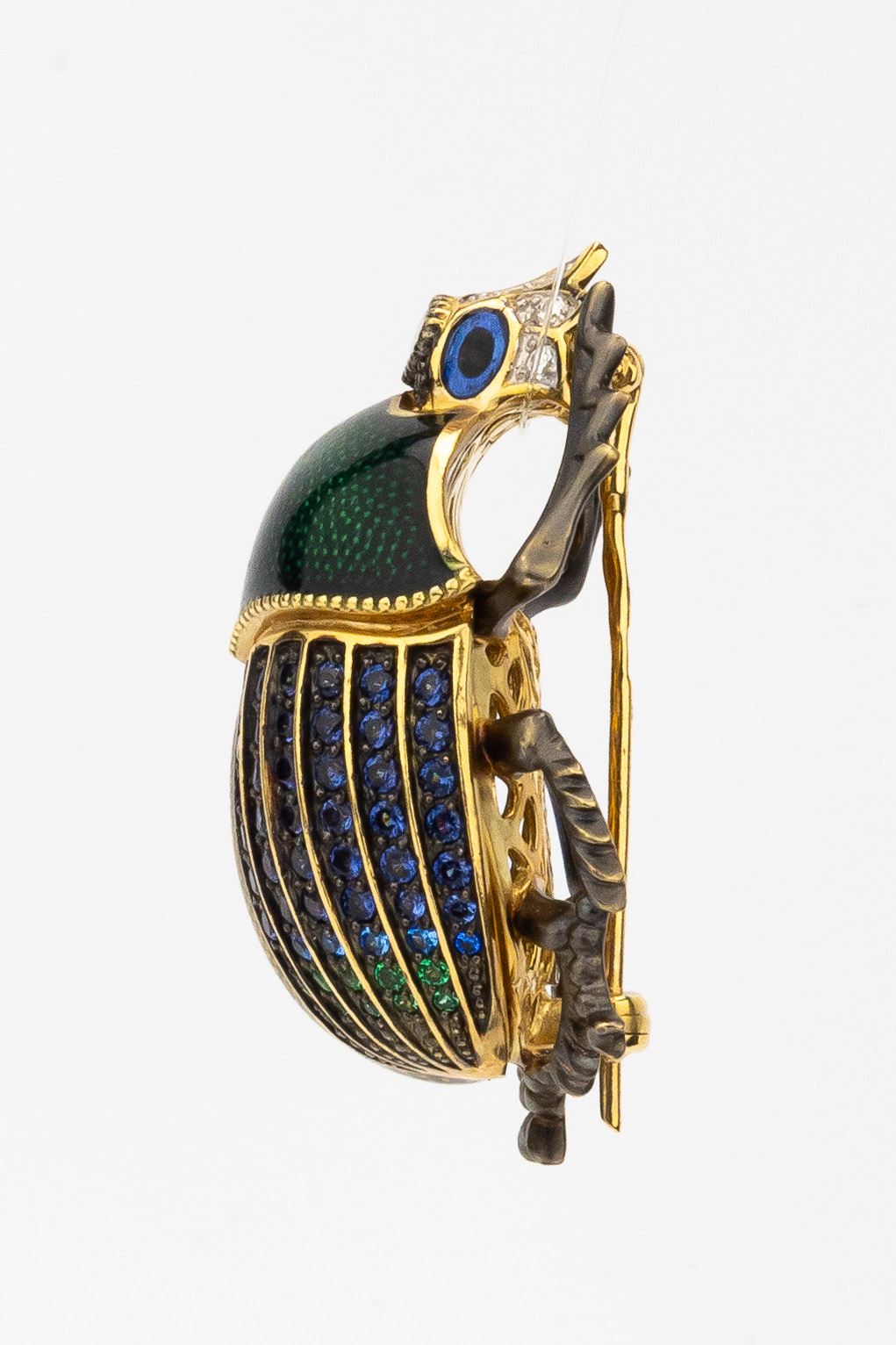 Особую выразительность броши придает сочетание благородного лимонного золота и насыщенной эмали. Центром композиции является роскошная вставка из турмалина и множества искрящихся фианитов, что в общей сложности составляет 113 вставок. Синий цвет вставок эффектно контрастирует с теплым оттенком металла и зеленым переливом эмалевого покрытия, создавая объемный и детализированный визуальный эффект.
