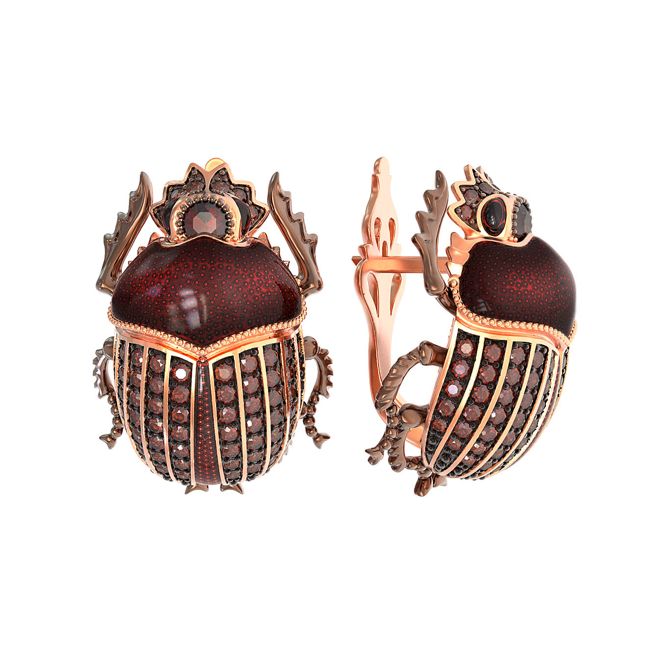 Откройте для себя магию символизма с этими уникальными серьгами, выполненными в оригинальном дизайне с изображением жука-скарабея. Изделие из коллекции De Luxe — Скарабеи станет ярким акцентом вашего образа, подчеркивая статус и безупречный вкус. Украшение изготовлено из красного золота 585 пробы, что обеспечивает долговечность и благородный блеск. Внимание к деталям восхищает: выразительный внешний вид достигается за счет ювелирной эмали глубокого оттенка, которая гармонично сочетается с теплым цветом металла.