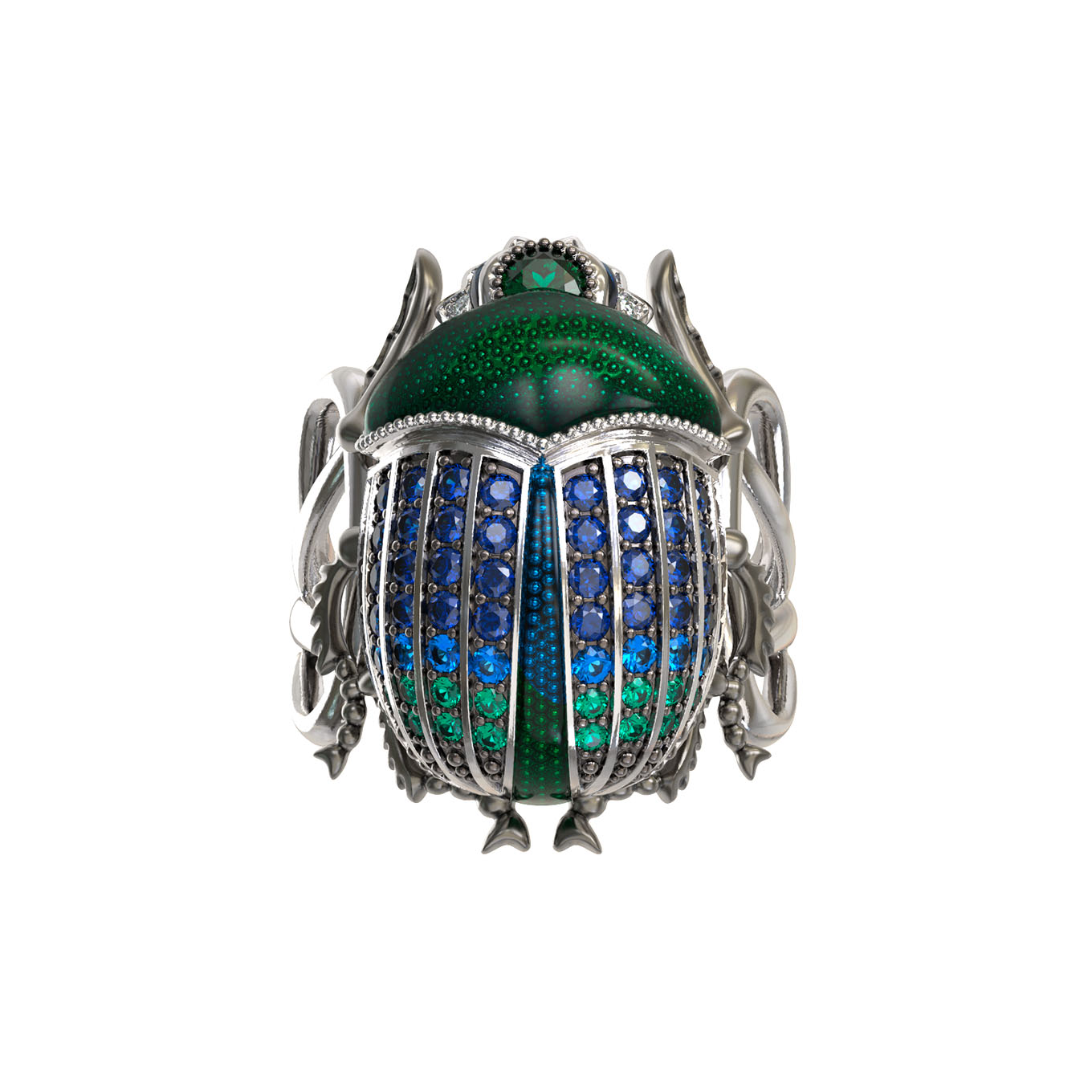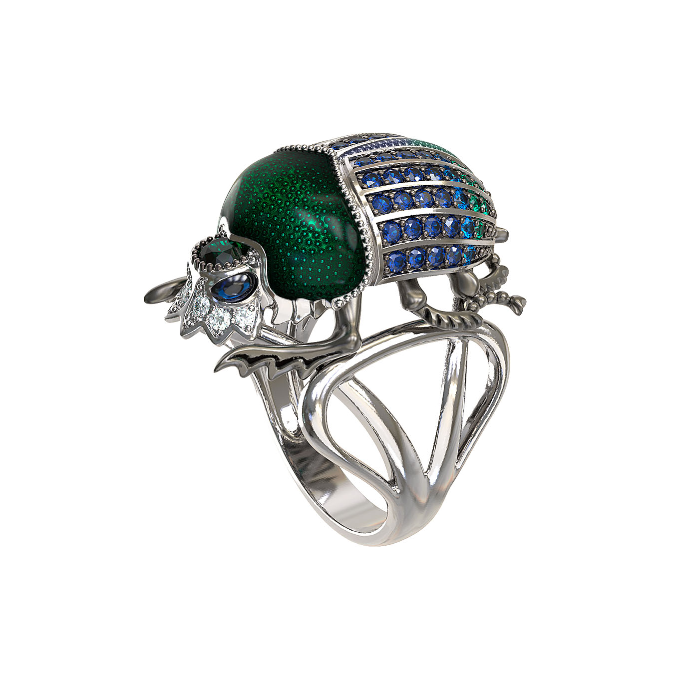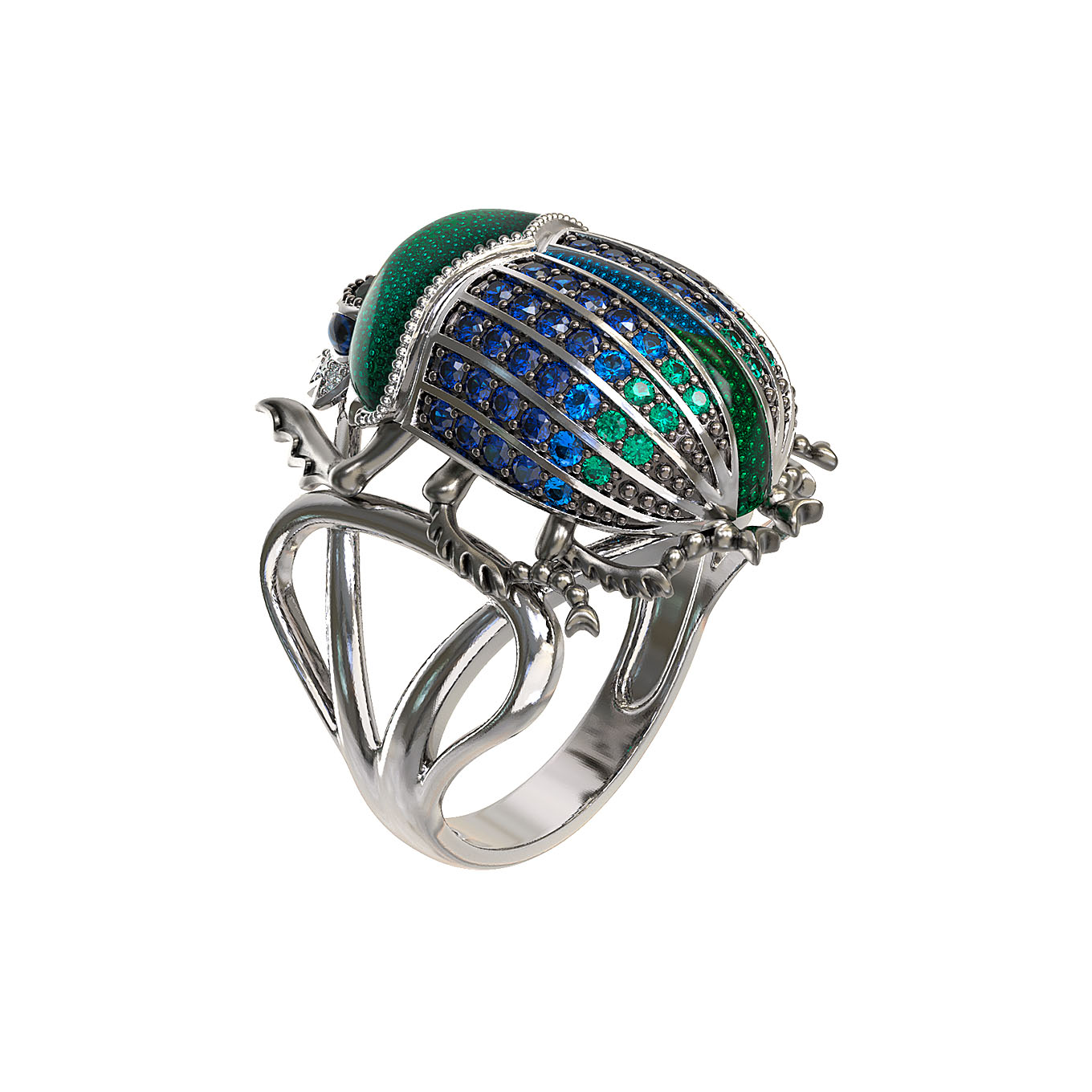 Эффектное кольцо из белого золота 585 пробы из коллекции De Luxe — Скарабеи станет акцентным украшением вашего образа. Дизайн изделия выполнен в виде жука-скарабея, что придает украшению особый символизм и характер. Ювелирная работа впечатляет своей детализацией: корпус насекомого декорирован насыщенной зеленой эмалью, а спинка украшена россыпью из 71 вставки круглой формы. Синий цвет вставок в сочетании с переливами эмали создает гармоничную и глубокую композицию.