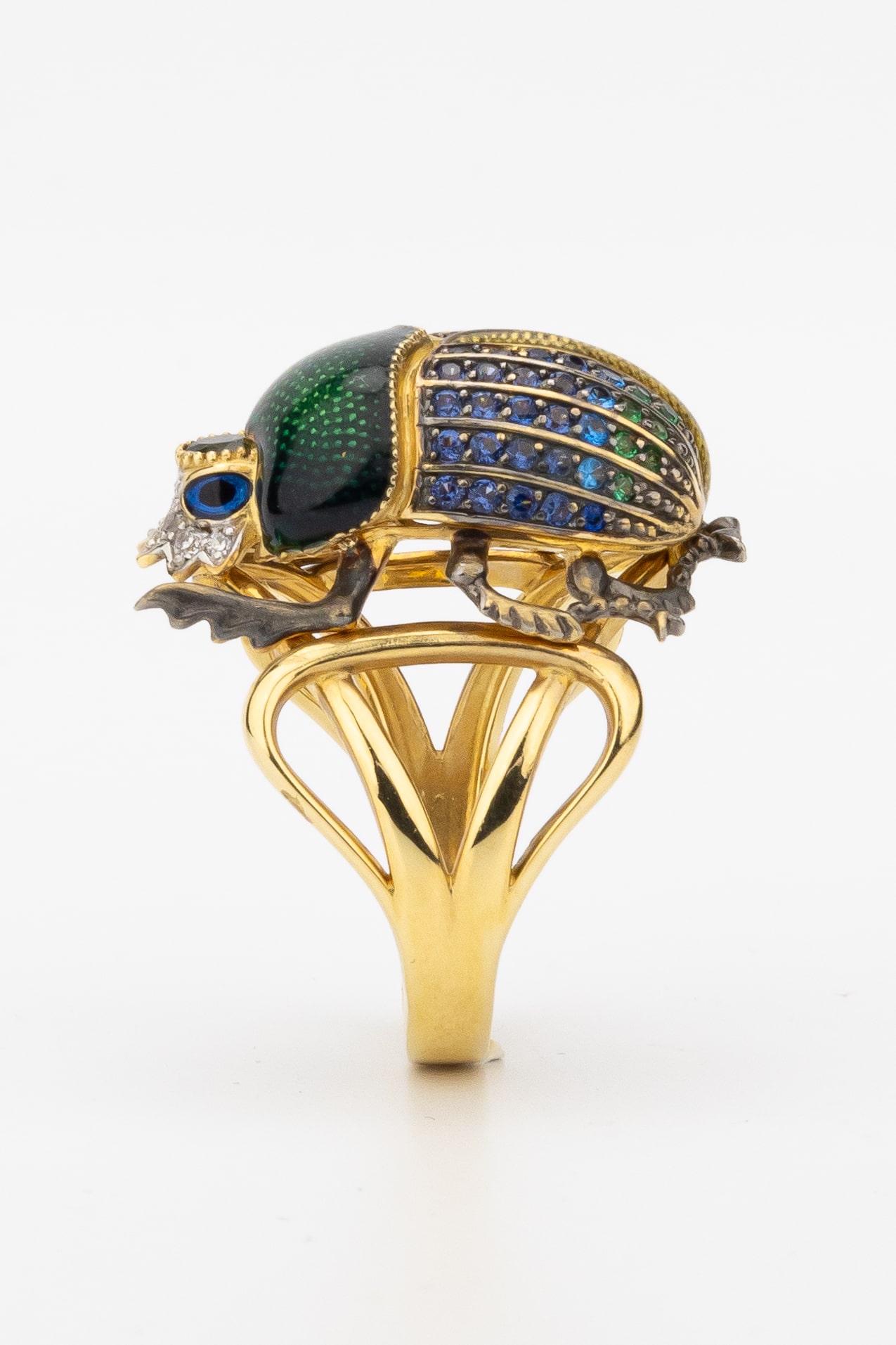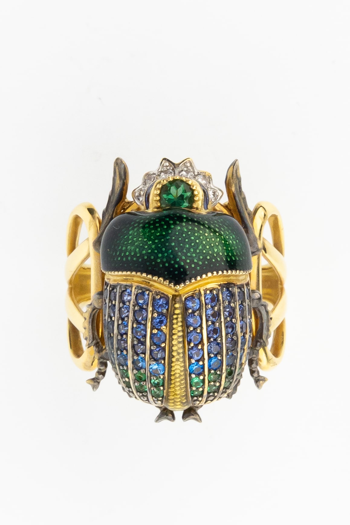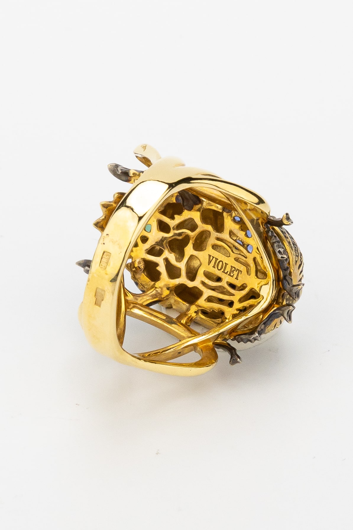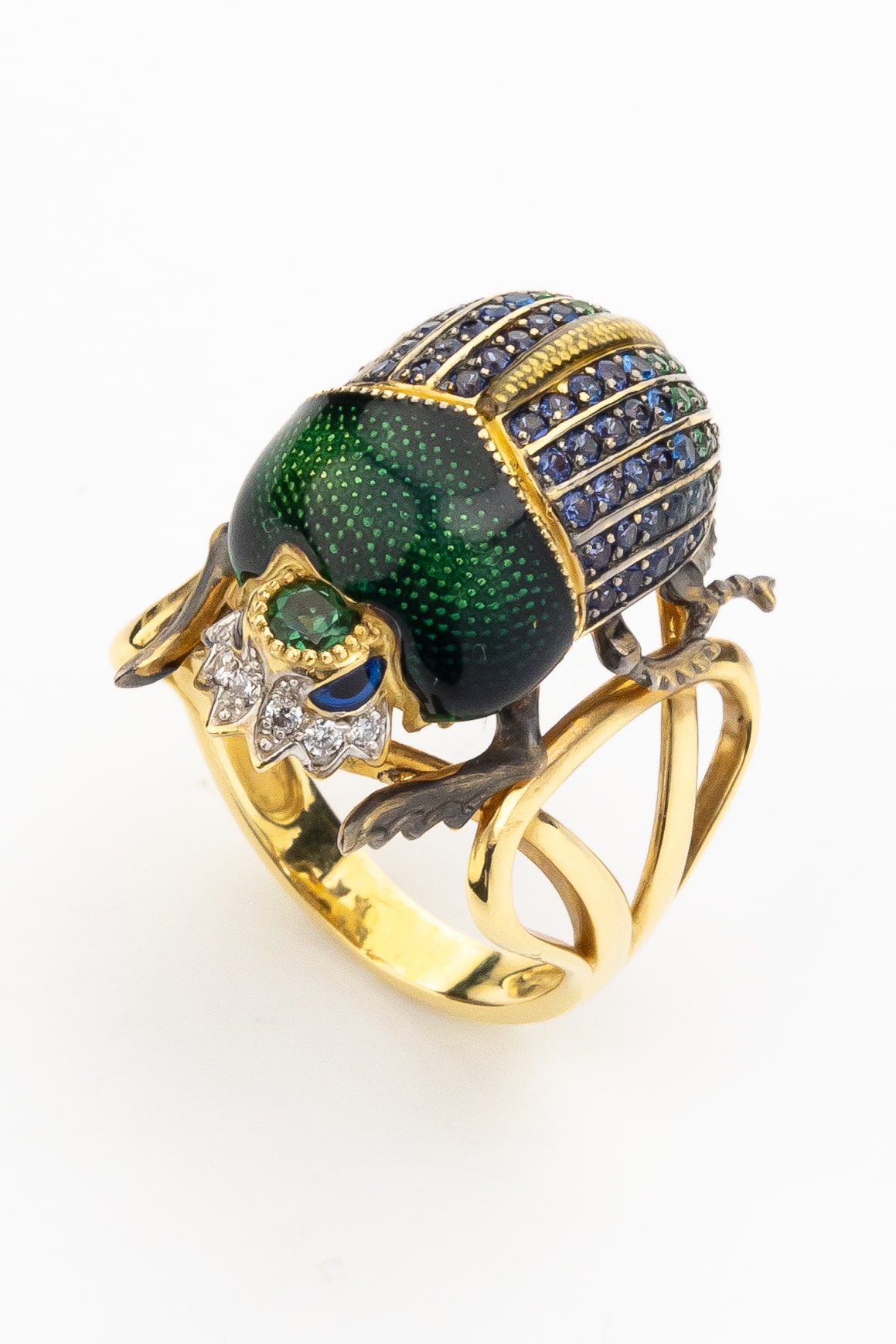 Основа кольца выполнена из благородного лимонного золота, подчеркивающего сияние вставок. Декоративная часть украшена яркой эмалью, создающей глубокий и насыщенный цвет, который гармонично дополняется россыпью из 71 вставки. В дизайне использованы турмалин, синие фианиты круглой формы, которые переливаются при каждом движении руки. Композиция выглядит выразительно и статусно.