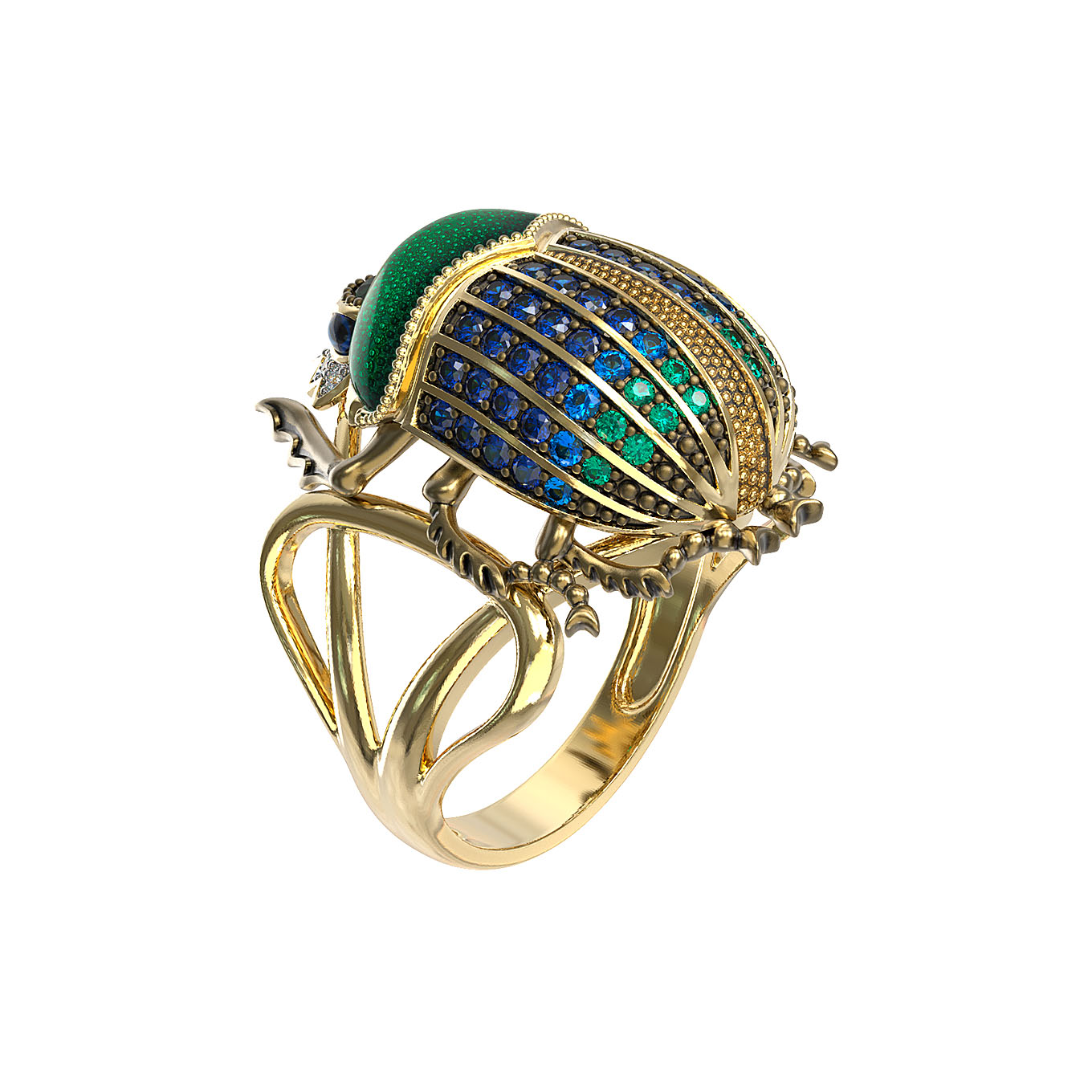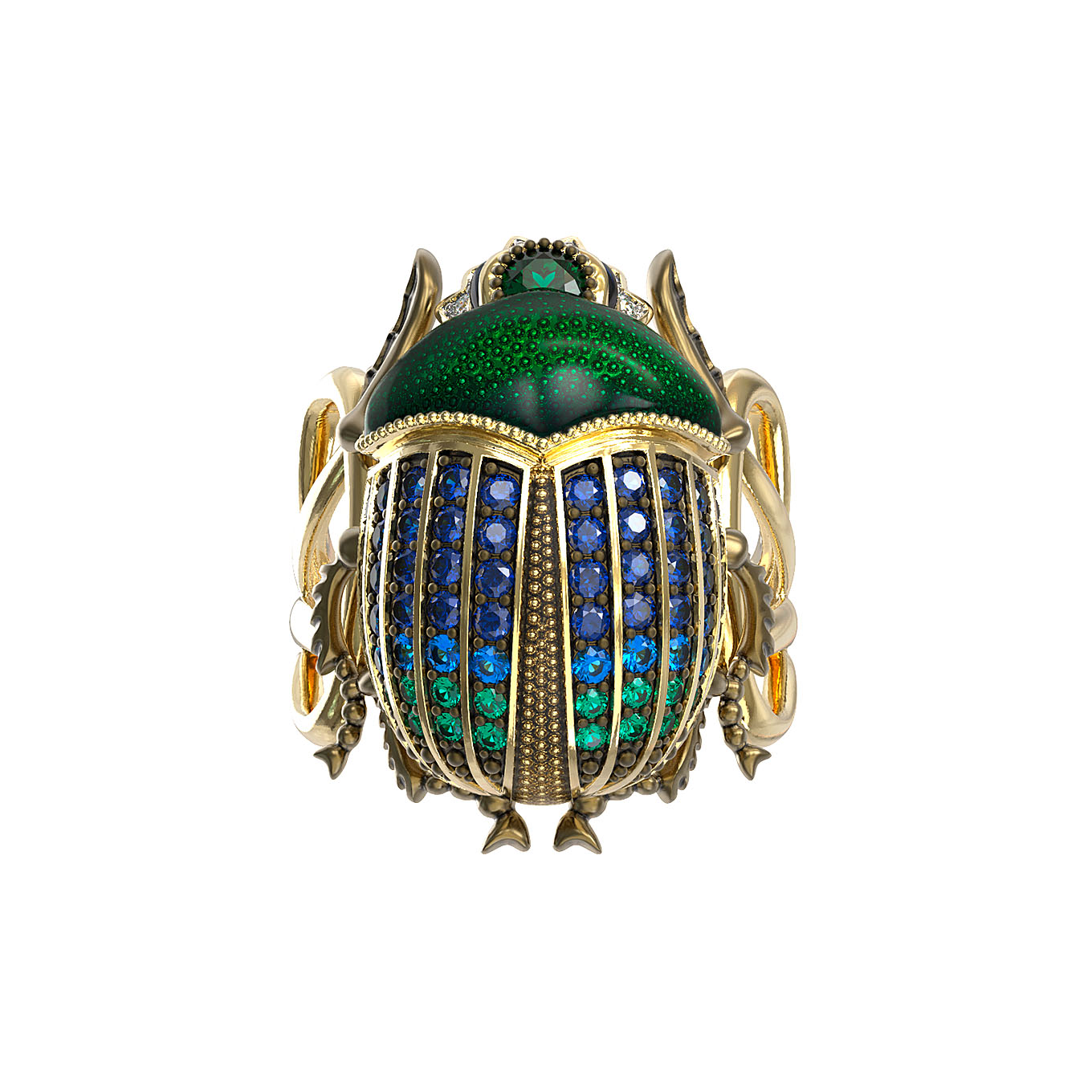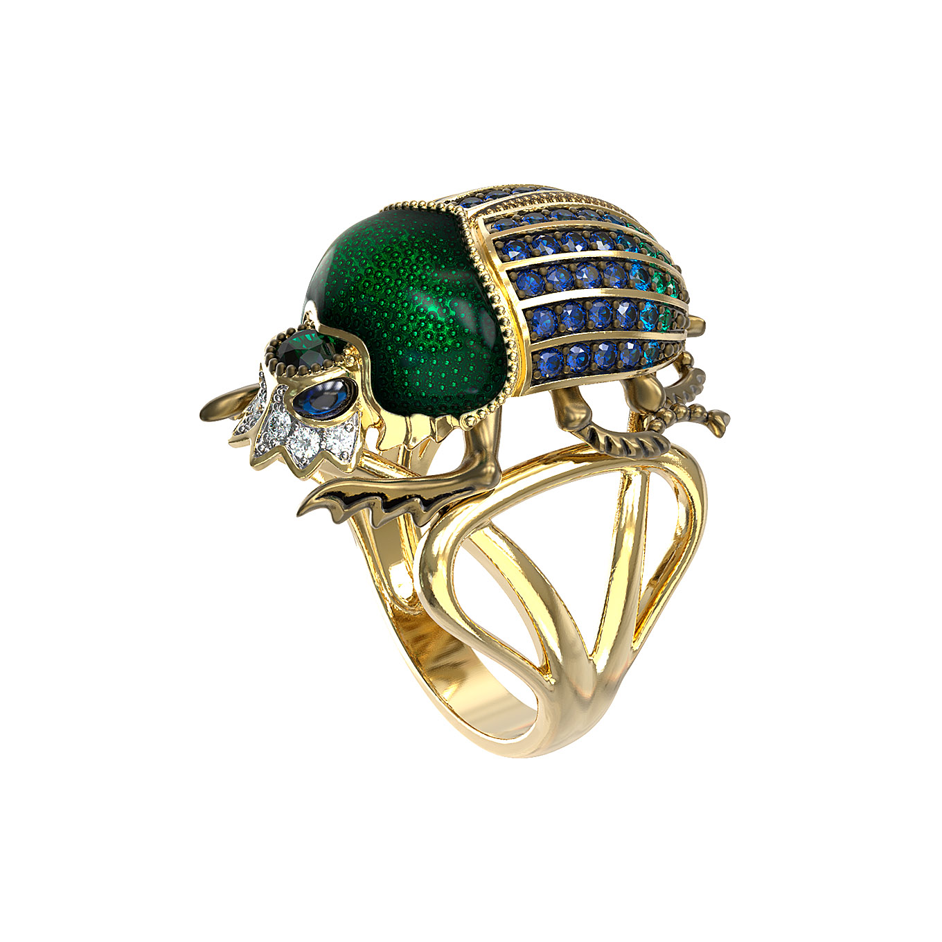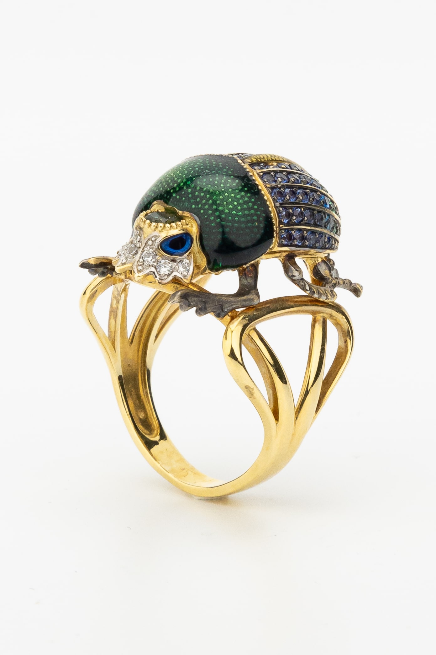 Основа кольца выполнена из благородного лимонного золота, подчеркивающего сияние вставок. Декоративная часть украшена яркой эмалью, создающей глубокий и насыщенный цвет, который гармонично дополняется россыпью из 71 вставки. В дизайне использованы турмалин, синие фианиты круглой формы, которые переливаются при каждом движении руки. Композиция выглядит выразительно и статусно.